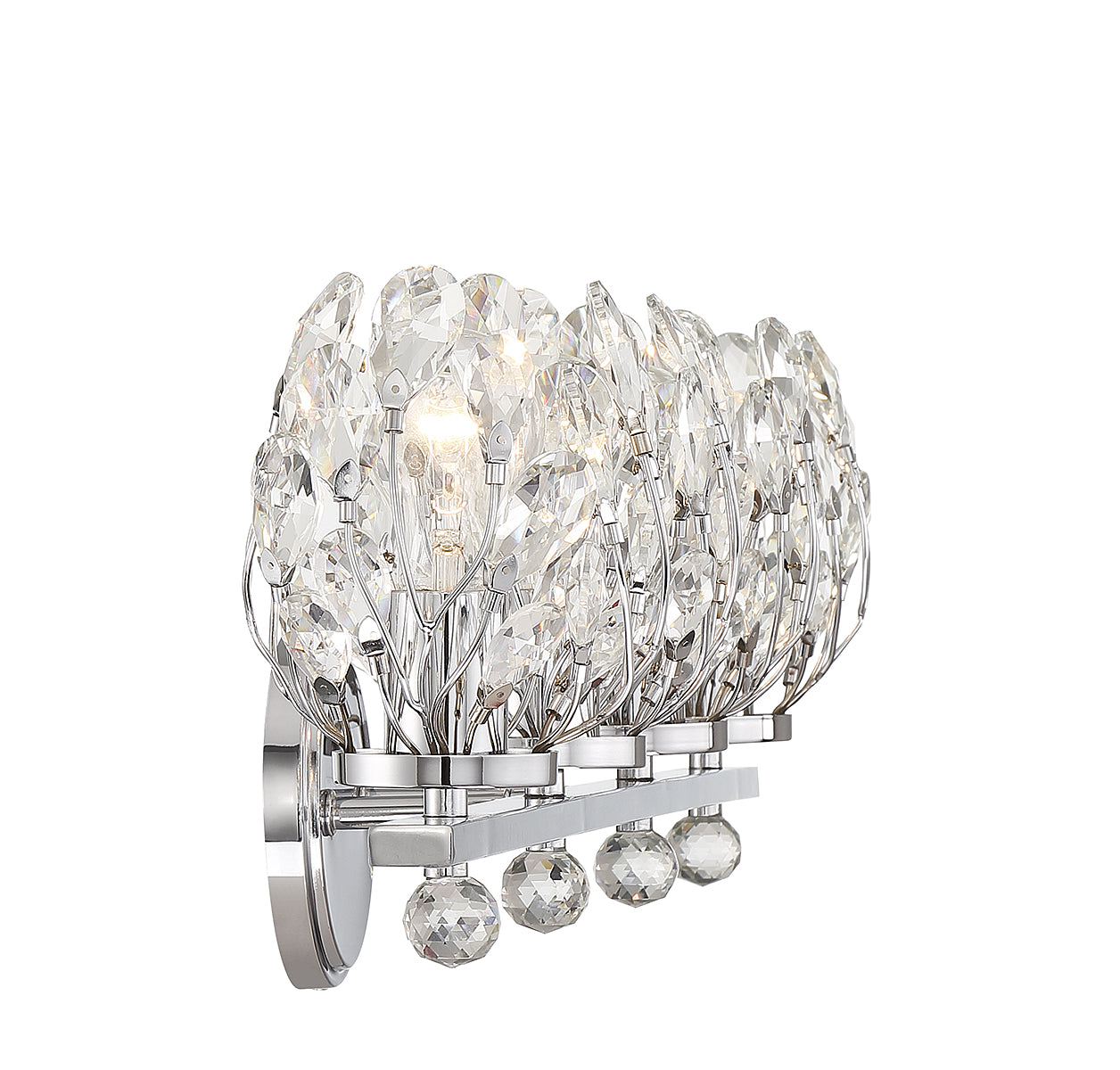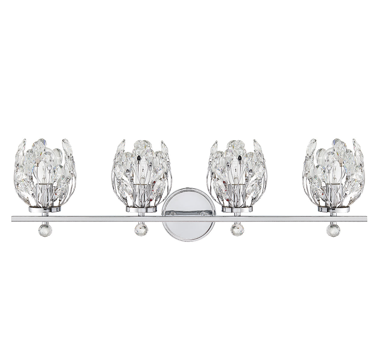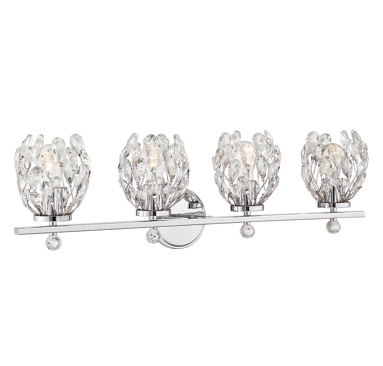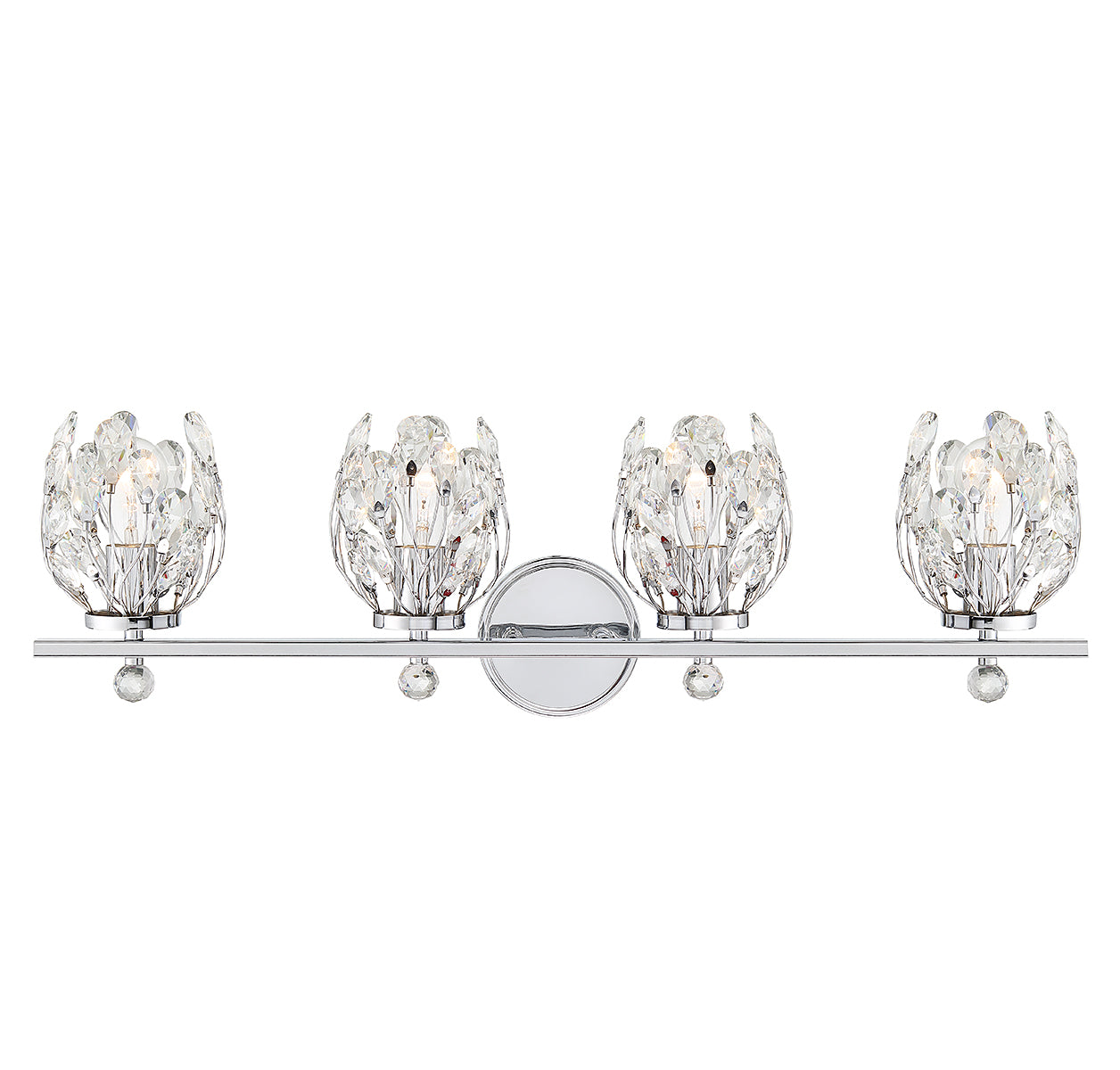 Give your bathroom its flowers with the whimsical Savoy House Moreno 4-light bath vanity light. Metal stems topped with clear crystal buds surround each light to create a look that is always fresh and fun, whether the lights are on or off. Finished in chrome. Moreno is 9.5" in height, 31" in width and extends 6.75" from the wall. It uses 4 standard size bulbs of up to 60 watts per bulb (bulbs not included).