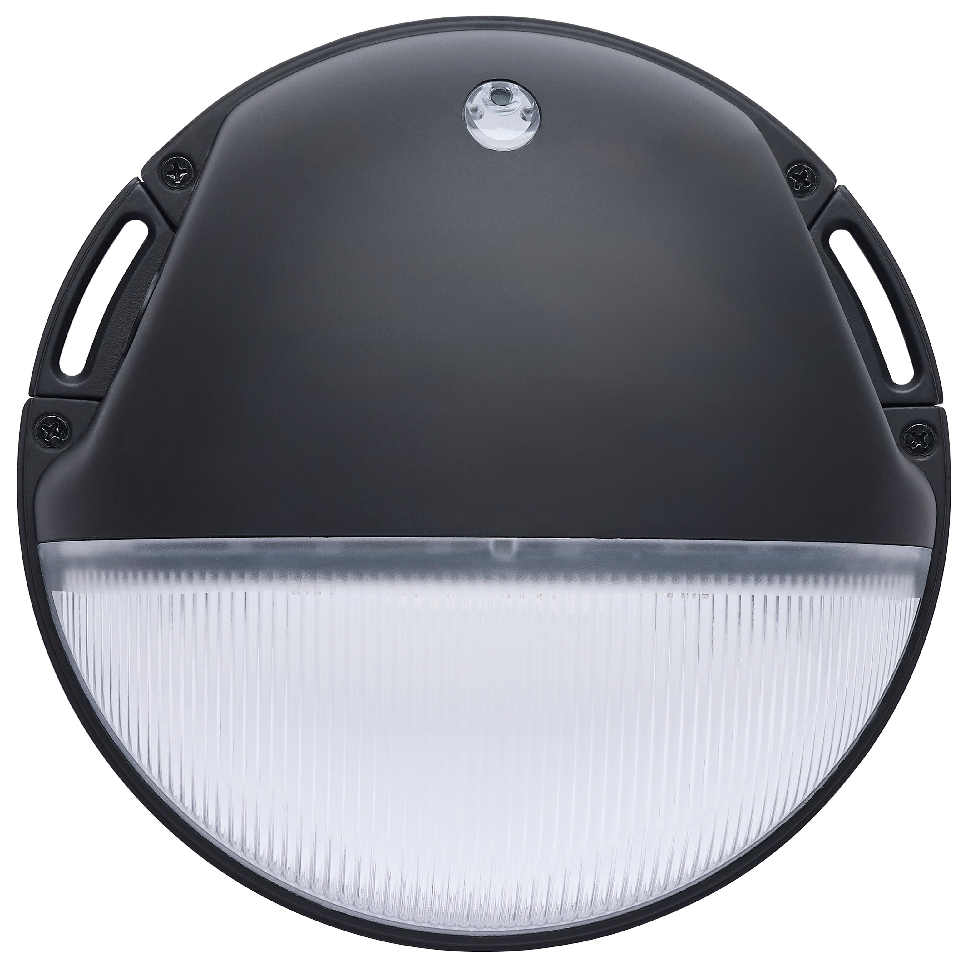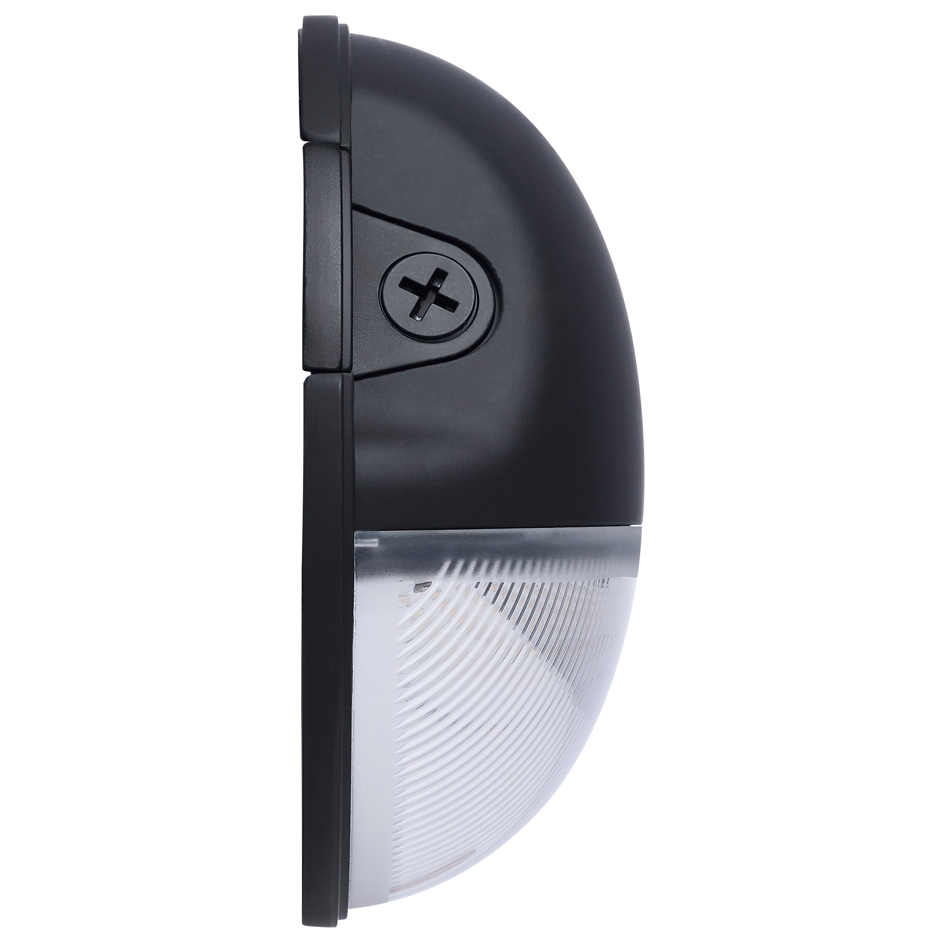 SATCO NUVO's CCT-selectable compact wall pack is the latest expansion in the popular line of Satco's commercial luminaires. This 20-watt black wall pack is just under nine inches in diameter, with superior light output and a convenient, easy to use CCT selection switch inside the fixture that allows you to choose between 3000K, 4000K, and 5000K at installation. Additional features include a bypassable photocell for dusk to dawn operation, multiple knockout points for pass-through wiring, and a wet location IP65 rating. These maintenance-free LED fixtures are ready for whatever outdoor conditions come their way. Perfect for multi-unit housing, light commercial use, landscaping, and more.