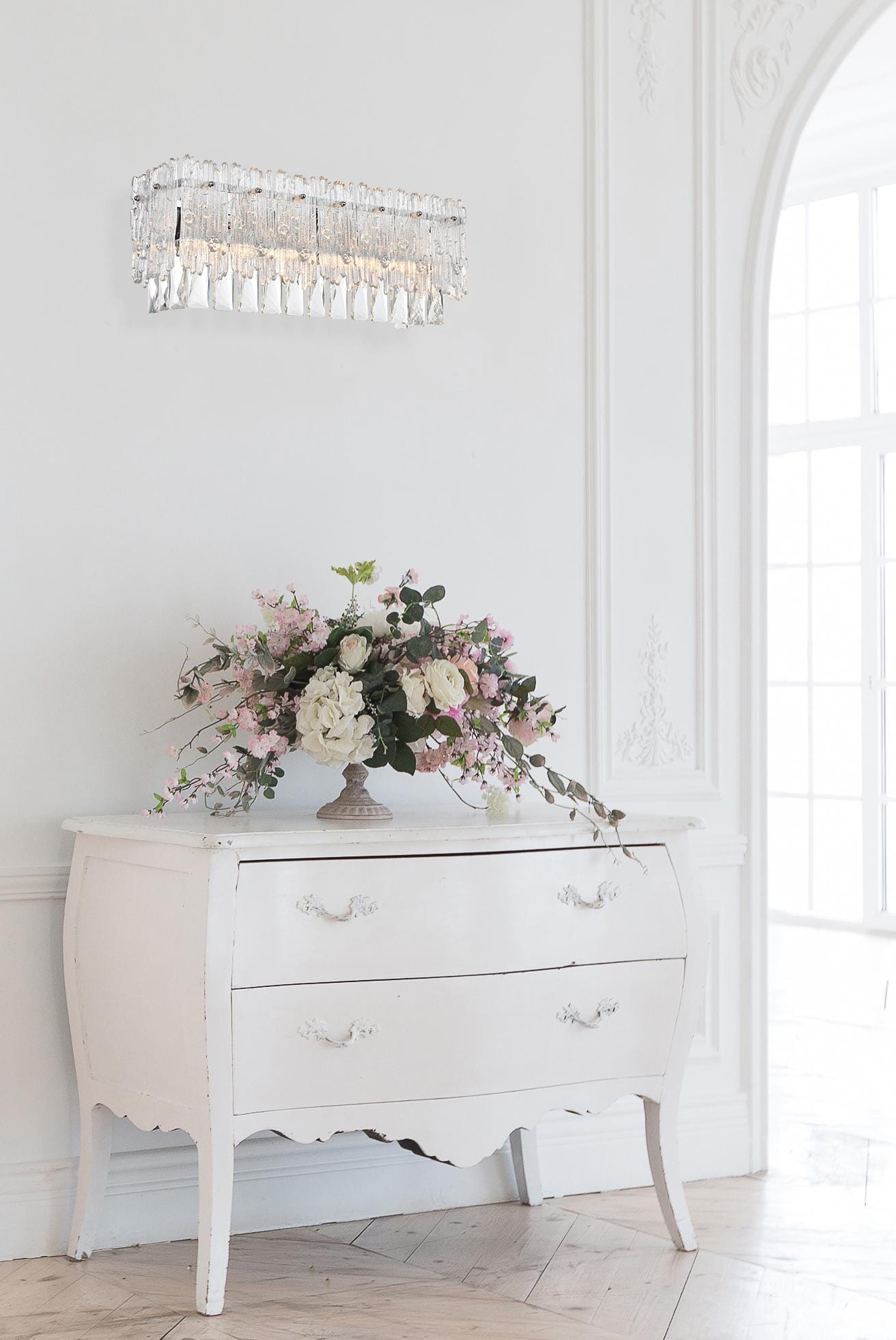 Transform your home with the opulent charm of this indoor lighting, meticulously designed to make a statement in any space. The light fixture showcases an intricate array of precision-cut clear crystals, each expertly faceted to maximize light refraction and create a dazzling display of brilliance. These crystals are complemented by textured glass accents that add depth and visual interest, casting a soft, shimmering glow across the room. Available in your choice of chrome or satin gold finishes, it is the epitome of luxury and modern elegance. As part of a coordinated collection, it also includes matching chandeliers, wall sconces and flush mounts, allowing you to create a harmonious lighting scheme throughout your home.