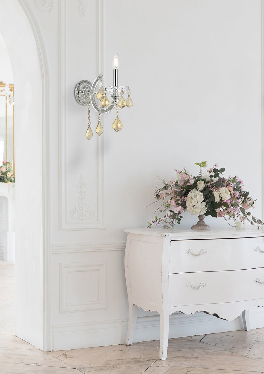 Give your foyer, hallway, or bathroom the royal treatment with the Maria Theresa collection wall sconces. Dazzling drop crystals in clear or golden teak shimmer amid glowing exposed bulbs. Gracefully arching glass-coated arms come in a range of finishes. A majestic display in a kaleidoscope of color combinations.