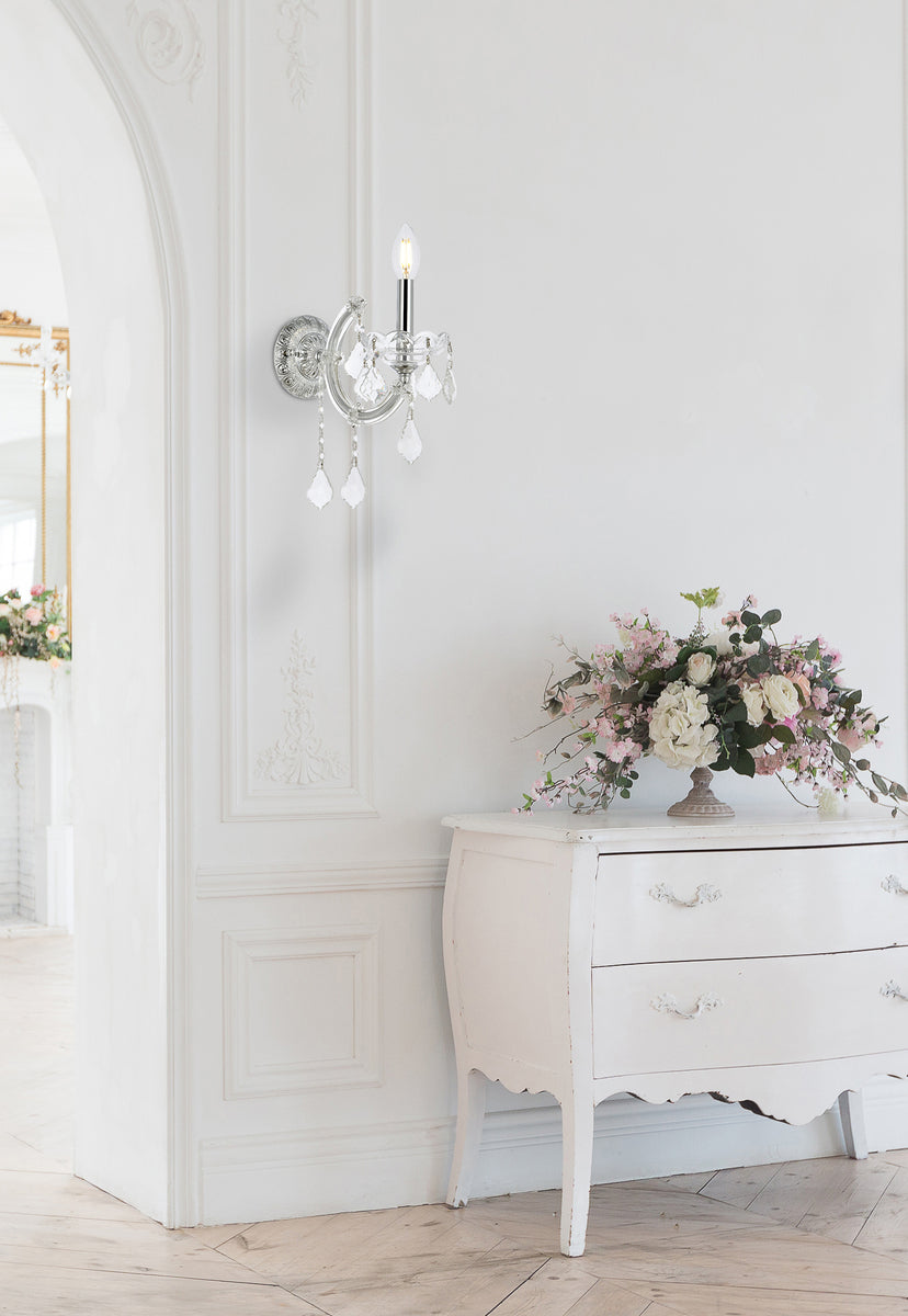 Give your foyer, hallway, or bathroom the royal treatment with the Maria Theresa collection wall sconces. Dazzling drop crystals in clear or golden teak shimmer amid glowing exposed bulbs. Gracefully arching glass-coated arms come in a range of finishes. A majestic display in a kaleidoscope of color combinations.