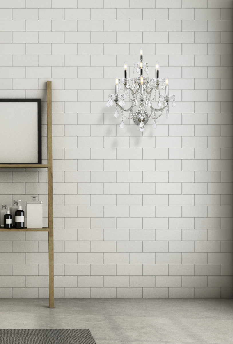 Give your foyer, hallway, or bathroom the royal treatment with the Maria Theresa collection wall sconces. Dazzling drop crystals in clear or golden teak shimmer amid glowing exposed bulbs. Gracefully arching glass-coated arms come in a range of finishes. A majestic display in a kaleidoscope of color combinations.