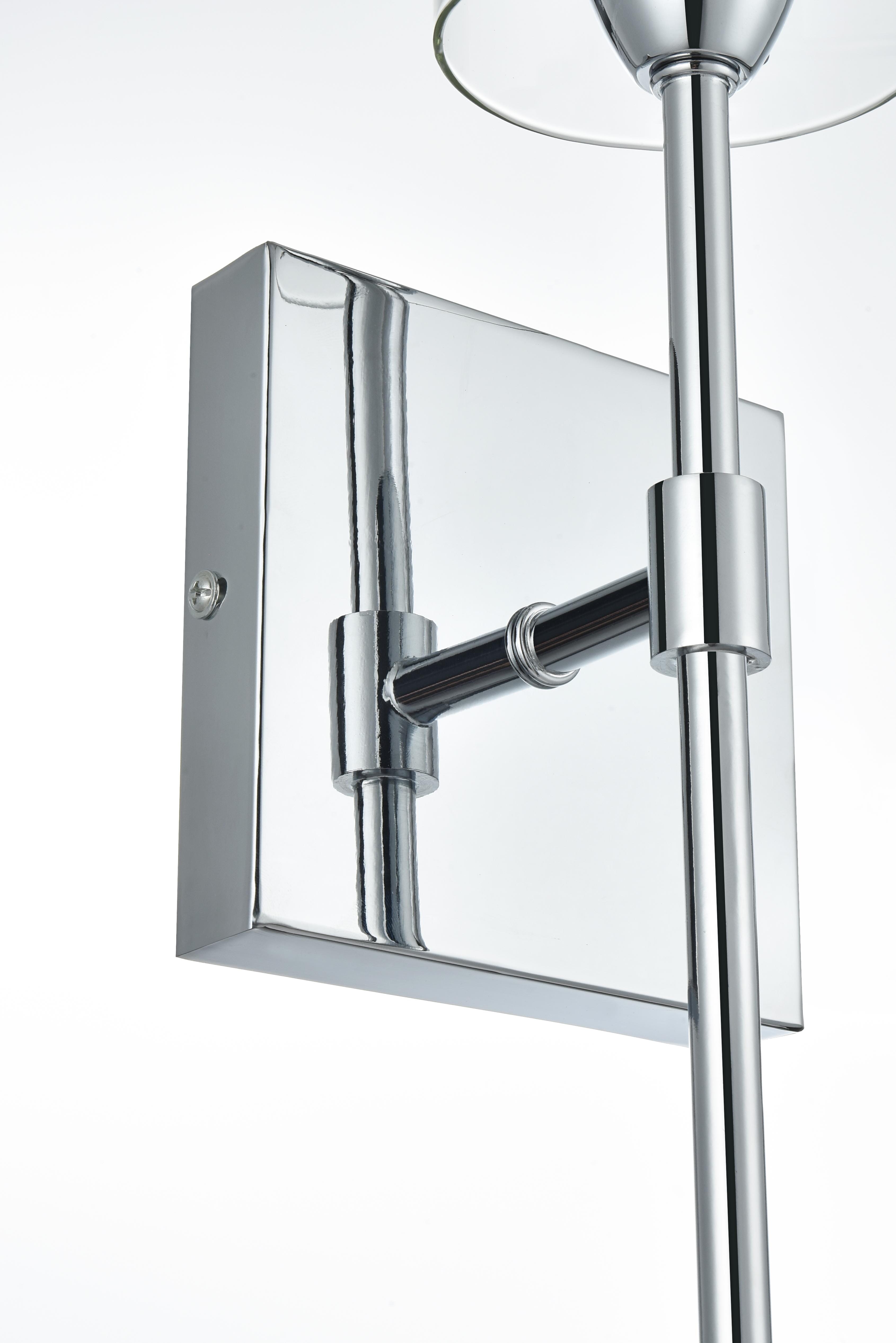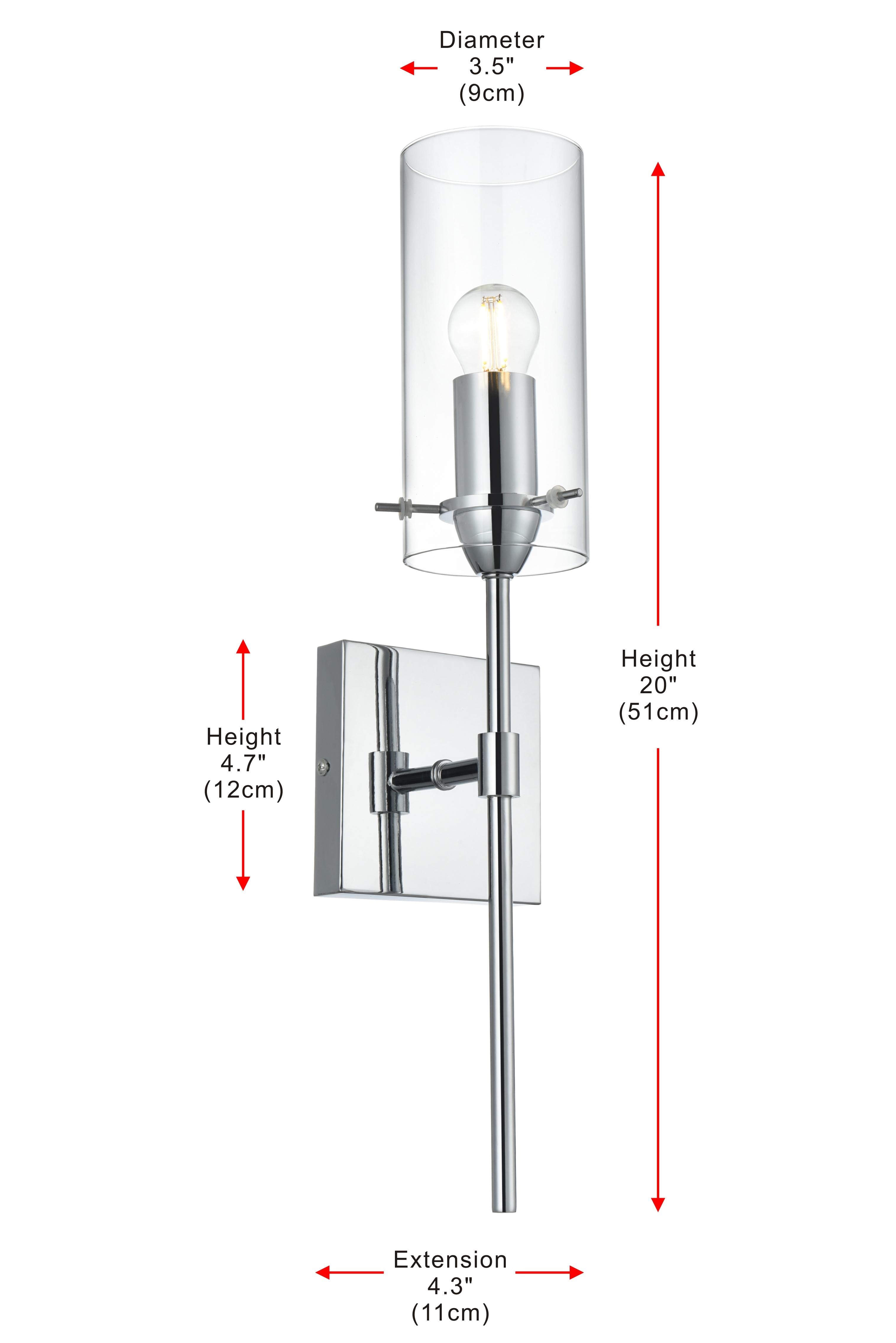 Elevate the ambiance of your space with this stunning wall sconce. Featuring a sleek chrome finish, this wall sconce blends modern style with classic elegance. The elongated metal arm supports a cylindrical clear glass shade that beautifully showcases the bulb, adding a striking architectural detail. Its minimalist square backplate and torch-like design create a sophisticated silhouette, perfect for any room—from a hallway or living room to a bathroom or bedroom. The chrome finish adds a reflective quality that enhances its modern appeal while complementing other metallic accents in your decor. This sconce requires one E26 socket bulb (not included) and is compatible with dimmable features, allowing you to set the perfect lighting mood.