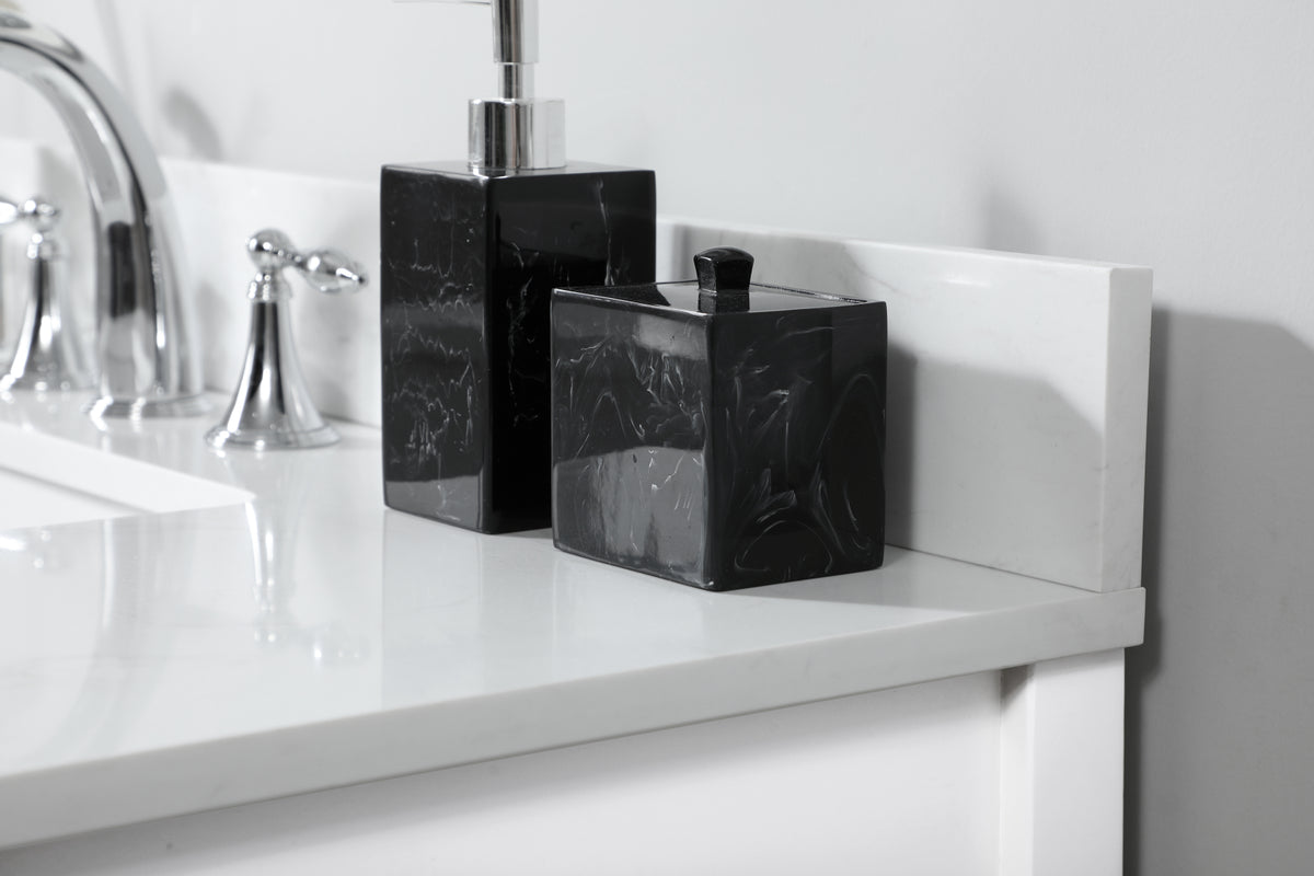 The subtle beauty of the Theo collection vanity exudes comfortable luxury. Its modern, yet traditional beauty will surely dress up your bathroom or powder room without any fuss. The calacatta engineered marble countertop and porcelain undermount sink shows quiet opulence, and the legs support upright without fail. Brushed nickel hardware complements the classic white finish, with pulls adorning the two cabinet doors, showcasing ample storage space within. Slated shelf allows for additional space to organize your towels. Whether this vanity is in your bathroom or for guests, its presence will surely elevate the aesthetics of your room. Comes with a matching backsplash to help protect your bathroom wall.