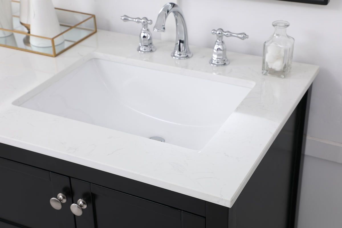 The subtle beauty of the Theo collection 60" vanity in a black finish exudes comfortable luxury. Its modern, yet traditional beauty will surely dress up your bathroom or powder room without any fuss. The white stone countertop and porcelain undermount sink shows quiet opulence, and the legs support upright without fail. Brushed Nickel hardware complements the trendy black finish, with pulls adorning the four cabinet doors and two drawers, showcasing ample storage space within. Slated shelf allows for additional space to organize your towels. Whether this vanity is in your bathroom or for guests, its presence will surely elevate the aesthetics of your room.