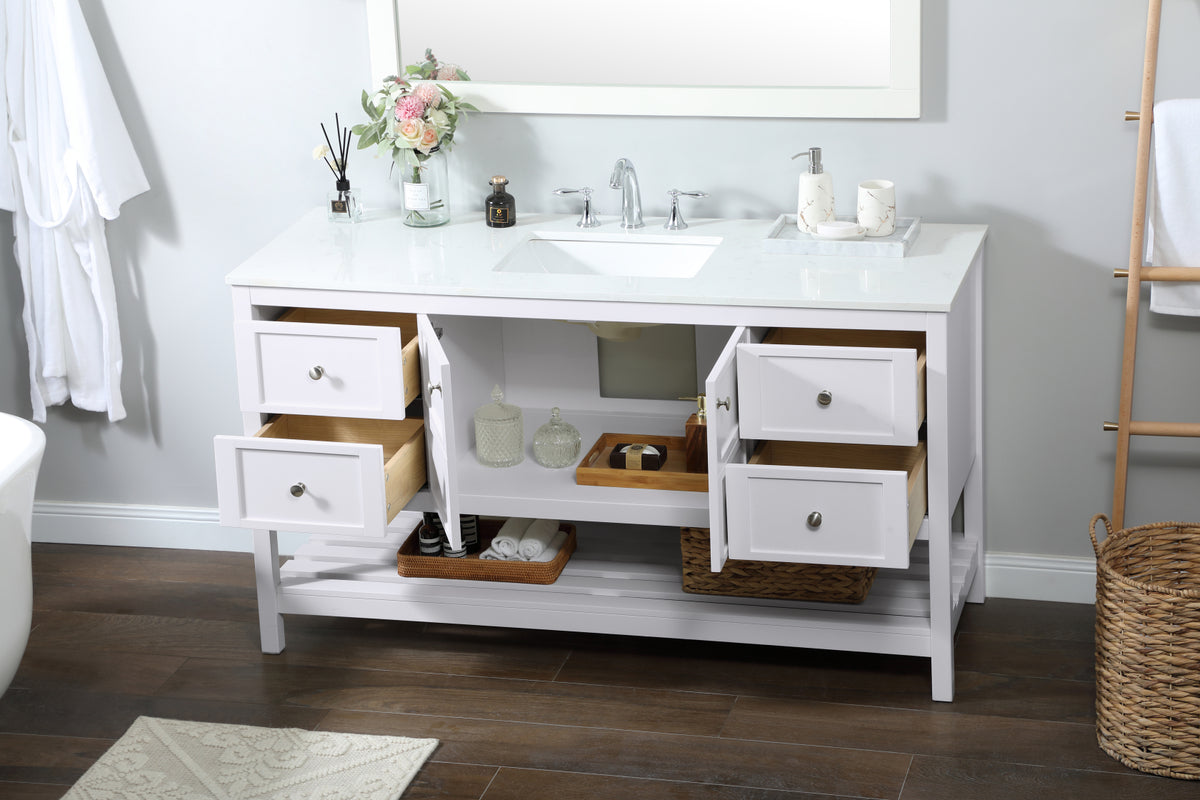 The subtle beauty of the Theo collection vanity exudes comfortable luxury. Its modern, yet traditional beauty will surely dress up your bathroom or powder room without any fuss. The calacatta engineered marble countertop and porcelain undermount sink shows quiet opulence, and the legs support upright without fail. Brushed nickel hardware complements the classic white finish, with pulls adorning the two cabinet doors, showcasing ample storage space within. Slated shelf allows for additional space to organize your towels. Whether this vanity is in your bathroom or for guests, its presence will surely elevate the aesthetics of your room.