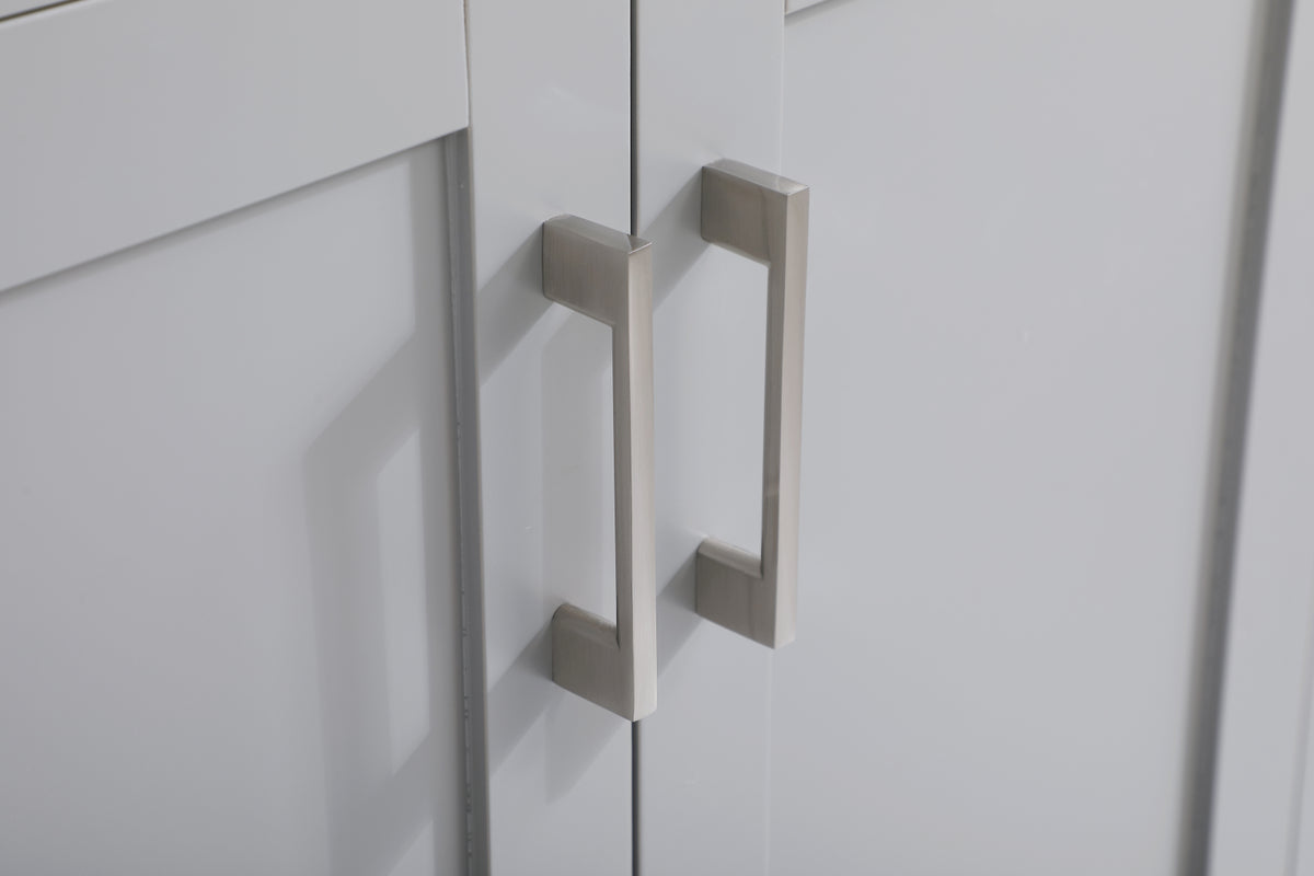 The refined simplicity of this 42" grey finish vanity creates a peaceful, yet stylish, atmosphere. Its traditional modernity adds a mature beauty that will elevate any bathroom or powder room--the Calacatta engineered marble counter top adds refined luxe while the brushed nickel handle bars open the double cabinet doors and 2 side drawers, revealing ample storage space to store and hide away an assortment of bathroom essentials. Whether your home is large or small, this vanity will surely fit in well.