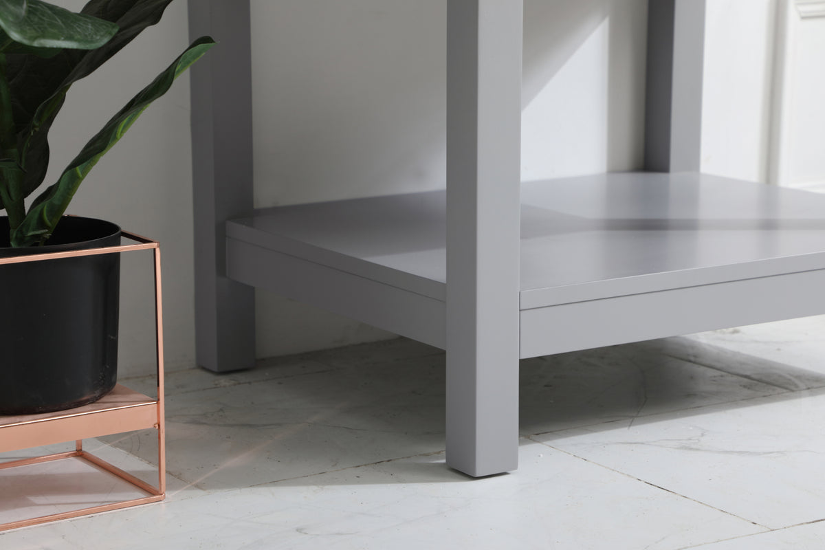 Make the most of your space with this 24" traditional style bathroom vanity. Its traditional style is able to complement many aesthetics with its grey finish, Calacatta engineered marble countertop, and the contemporary slender brushed nickel handle bar that sits on the upper false drawer and the lower u-shaped drawer, allowing you to store an assortment of bathroom essentials. The lower shelf makes it the perfect space to hold new towels for your guests. This compact vanity ensures both form and function in your bathroom or powder room for you and your guests.