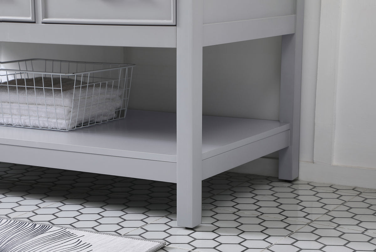 Make the most of your space with this traditional style bathroom vanity. Complements well with many aesthetics with its beautiful finish, calacatta engineered marble countertop, and the contemporary slender handle bar that sits on one false drawer and five functional drawers with soft closing mechanism, allowing you to store an assortment of bathroom essentials. The lower shelf makes it the perfect space to hold new towels for your guests. This compact vanity ensures both form and function in your bathroom or powder room for you and your guests. Comes with a matching backsplash to complete the look and protects your wall.