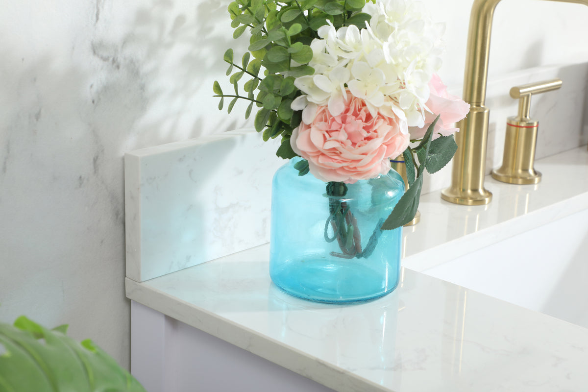 Live in modern comfort with this 30" white finish vanity. Dressed in a white and sleek gold metal hardware, its contemporary style will have your bathroom or powder room elevated in modern sophistication. The open shelf at the base and two drawers reveal ample storage space for your bathroom essentials and miscellany. Clean lines create its own visual interest, adding trendy looks to your already chic room. Comes with a matching backsplash to protect your walls.