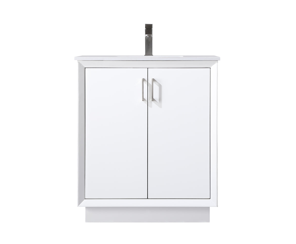Step into a realm of modern luxury with our freestanding bathroom vanity, featuring a sleek and contemporary boxy design that sets new standards for aesthetics. The engineered marble countertop, with its crisp 0.75-inch straight edge, not only introduces sophistication but also ensures enduring durability. Convenience takes center stage with the undermount porcelain sink, measuring 15.35 inches long, 11 inches wide, and 7 inches deep, complemented by a single predrilled faucet hole for seamless installation. Experience the art of organization through soft-closing doors adorned with high-quality bar pulls. The vanity, crafted from resilient MDF material, combines elegance with durability, supported by solid wood legs that provide stability and a touch of natural warmth. Elevate your bathroom with this distinctive piece, where the fusion of form and function creates a harmonious dance of modern sophistication, redefining your daily routine with a statement in style and practicality.