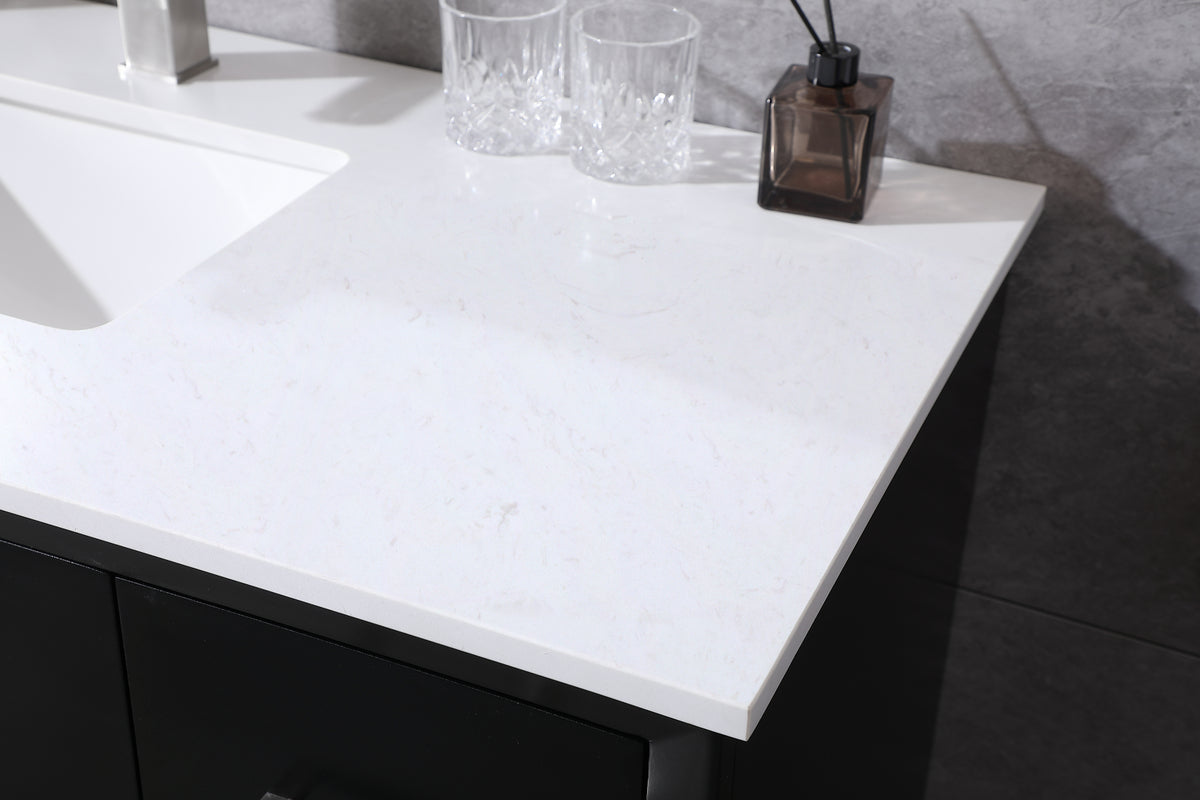 Step into a realm of modern luxury with our freestanding bathroom vanity, featuring a sleek and contemporary boxy design that sets new standards for aesthetics. The engineered marble countertop, with its crisp 0.75-inch straight edge, not only introduces sophistication but also ensures enduring durability. Convenience takes center stage with the undermount porcelain sink, measuring 15.35 inches long, 11 inches wide, and 7 inches deep, complemented by a single predrilled faucet hole for seamless installation. Experience the art of organization through soft-closing drawers and doors adorned with high-quality bar pulls, showcasing meticulous craftsmanship in the precision of butt joint drawers. The vanity, crafted from resilient MDF material, combines elegance with durability, supported by solid wood legs that provide stability and a touch of natural warmth. Elevate your bathroom with this distinctive piece, where the fusion of form and function creates a harmonious dance of modern sophistication, redefining your daily routine with a statement in style and practicality.