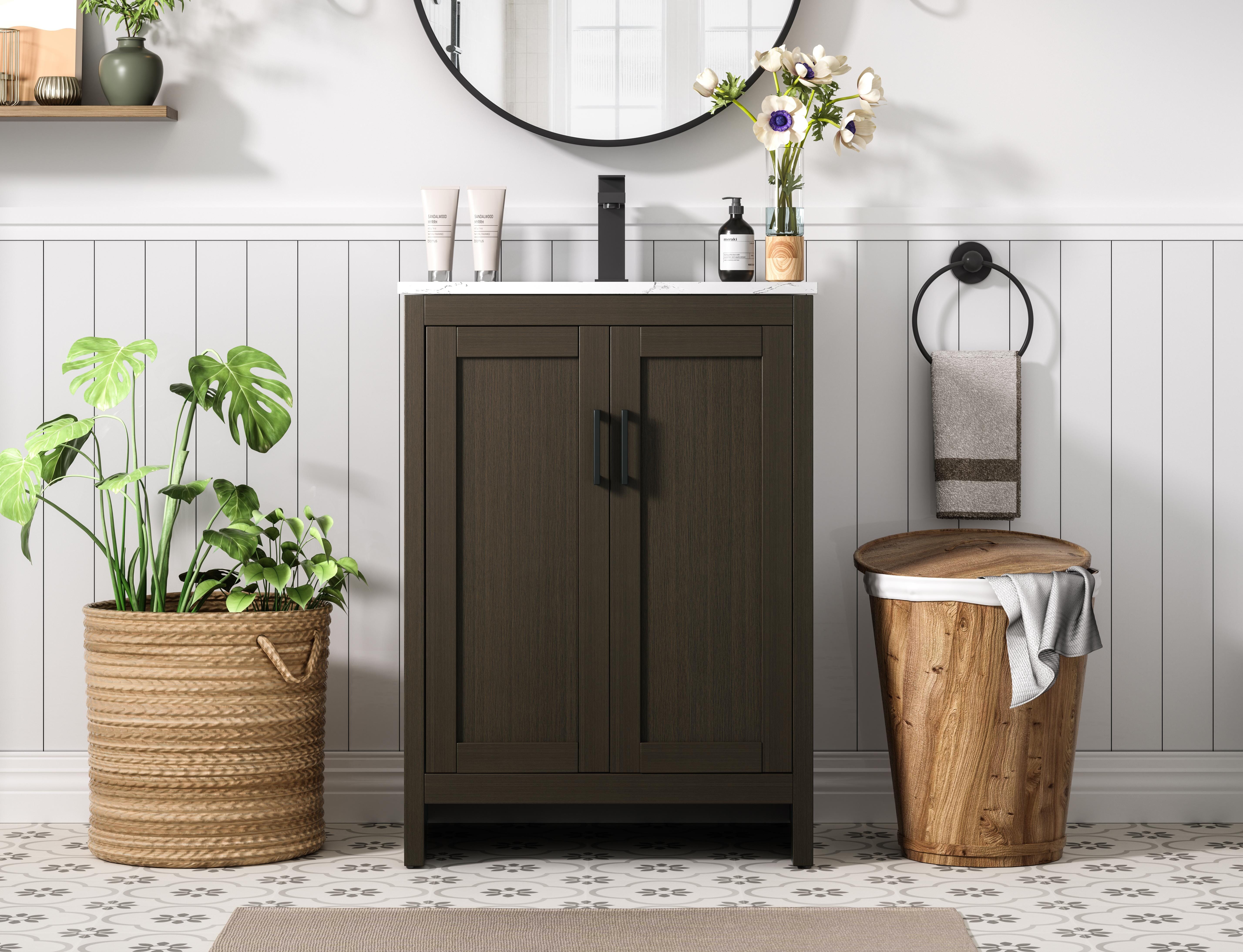 Redefine your bathroom with this transitional shaker-style vanity, designed to combine practicality with timeless aesthetics. Its clean lines and shaker-style door panels create a versatile look that complements both traditional and contemporary spaces. The engineered marble countertop, featuring a unique faux marbled pattern, adds a sophisticated focal point, while the integrated porcelain sink ensures durability and easy maintenance. The vanity includes a shelf with a smart U-shaped cutout, optimizing storage while accommodating plumbing. Crafted from sturdy MDF with a warm woodgrain finish, it brings a natural and inviting feel to your bathroom. Equipped with adjustable foot levelers for stability and a pre-drilled faucet hole for quick installation, this compact vanity delivers on both style and function. Best of all, it arrives fully assembled, ready to enhance your space right out of the box.