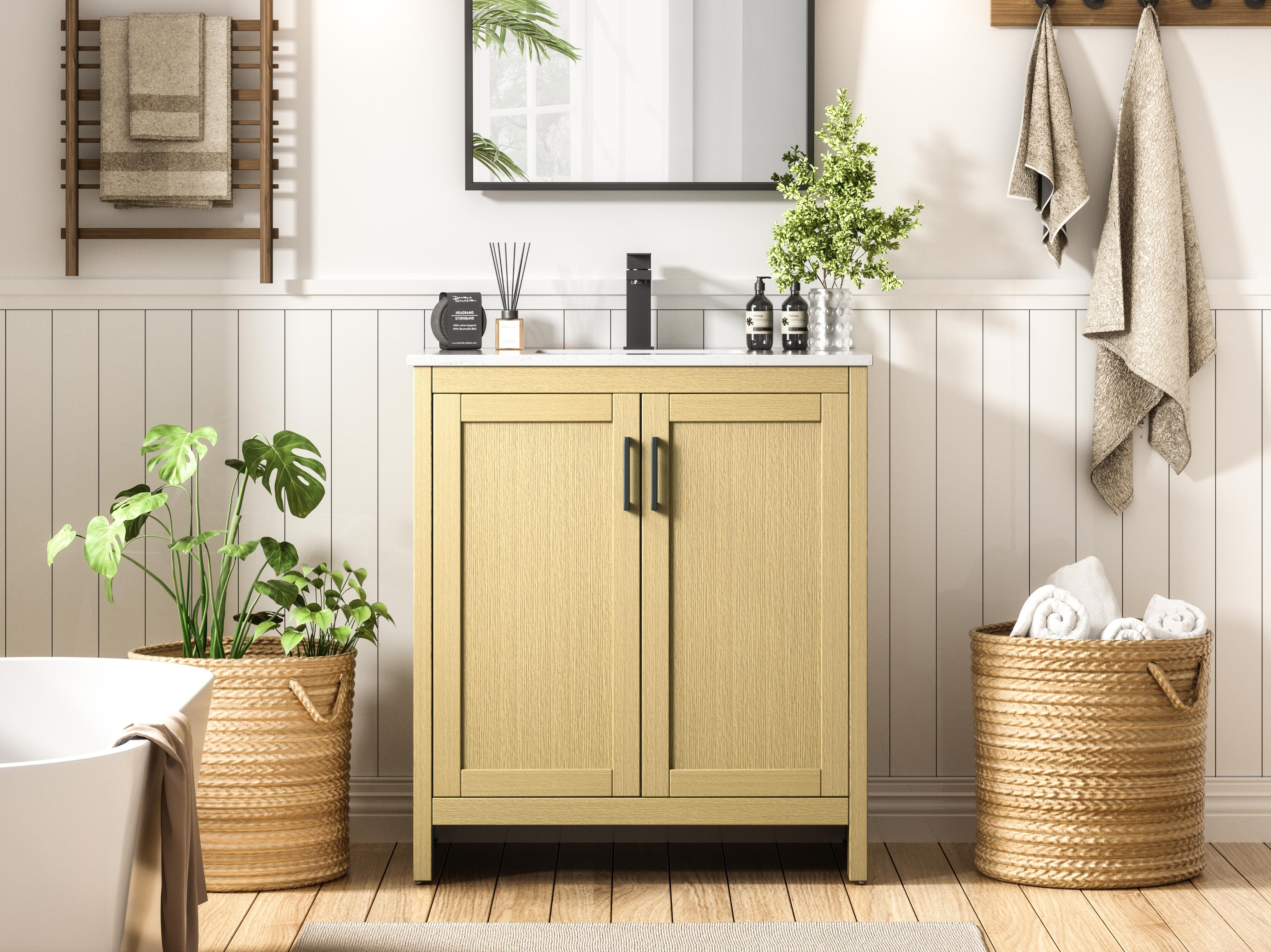 Redefine your bathroom with this transitional shaker-style vanity, designed to combine practicality with timeless aesthetics. Its clean lines and shaker-style door panels create a versatile look that complements both traditional and contemporary spaces. The engineered marble countertop, featuring a unique faux marbled pattern, adds a sophisticated focal point, while the integrated porcelain sink ensures durability and easy maintenance. The vanity includes a shelf with a smart U-shaped cutout, optimizing storage while accommodating plumbing. Crafted from sturdy MDF with a warm woodgrain finish, it brings a natural and inviting feel to your bathroom. Equipped with adjustable foot levelers for stability and a pre-drilled faucet hole for quick installation, this compact vanity delivers on both style and function. Best of all, it arrives fully assembled, ready to enhance your space right out of the box.
