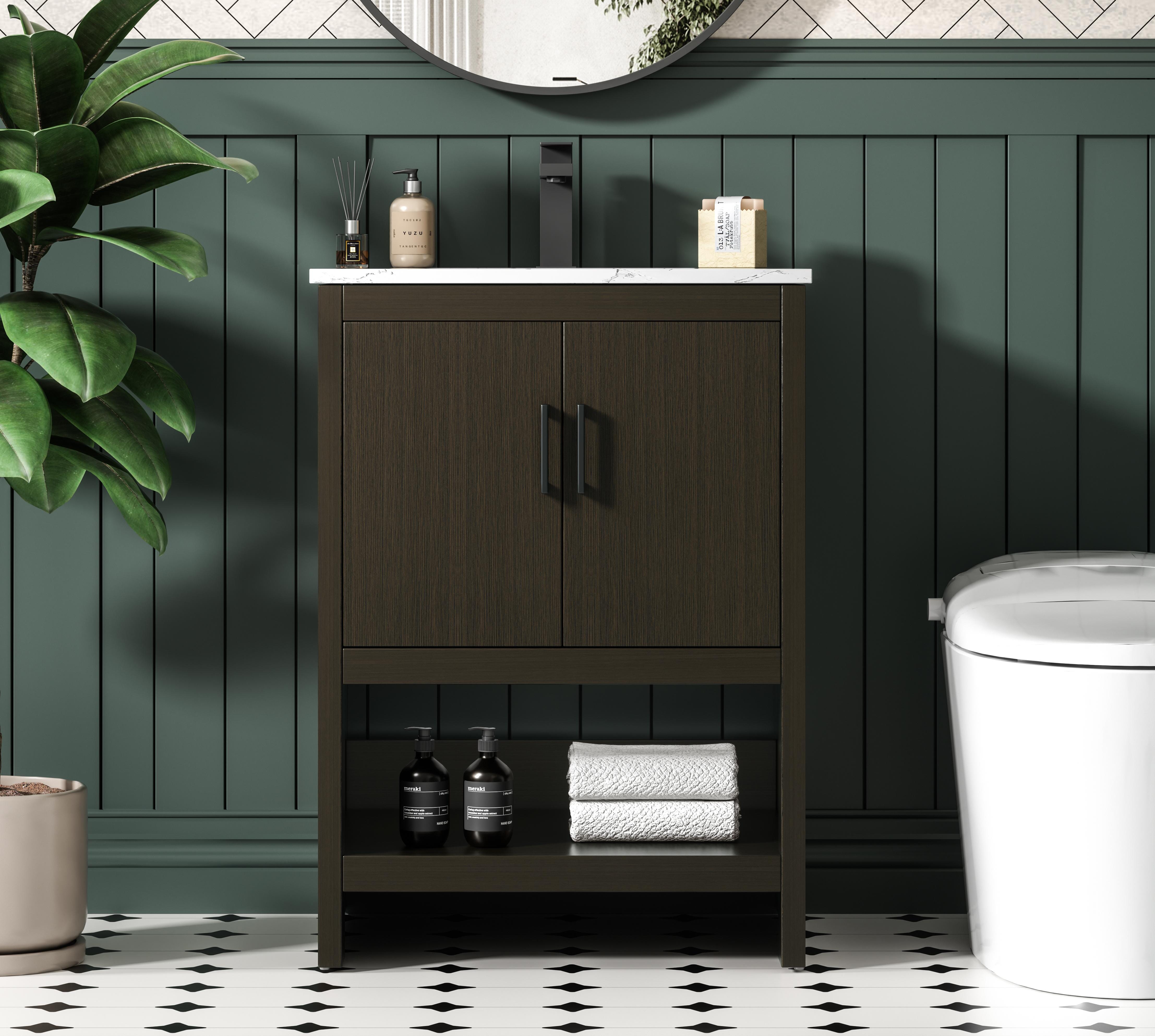 Bring modern style and practicality to your bathroom with this sleek vanity, designed to complement contemporary spaces. The flat-panel doors create a clean, minimalist look, while the open bottom shelf provides functional storage or a space to display decorative items. The engineered marble countertop showcases unique faux marbling, adding a refined and distinct touch to the design. The durable porcelain sink is easy to maintain, and the single pre-drilled faucet hole simplifies the installation process. Constructed from high-quality MDF with a versatile woodgrain finish, this vanity combines durability with timeless style. With adjustable foot levelers for stability on uneven floors and a fully assembled design, this piece offers a seamless addition to your bathroom.