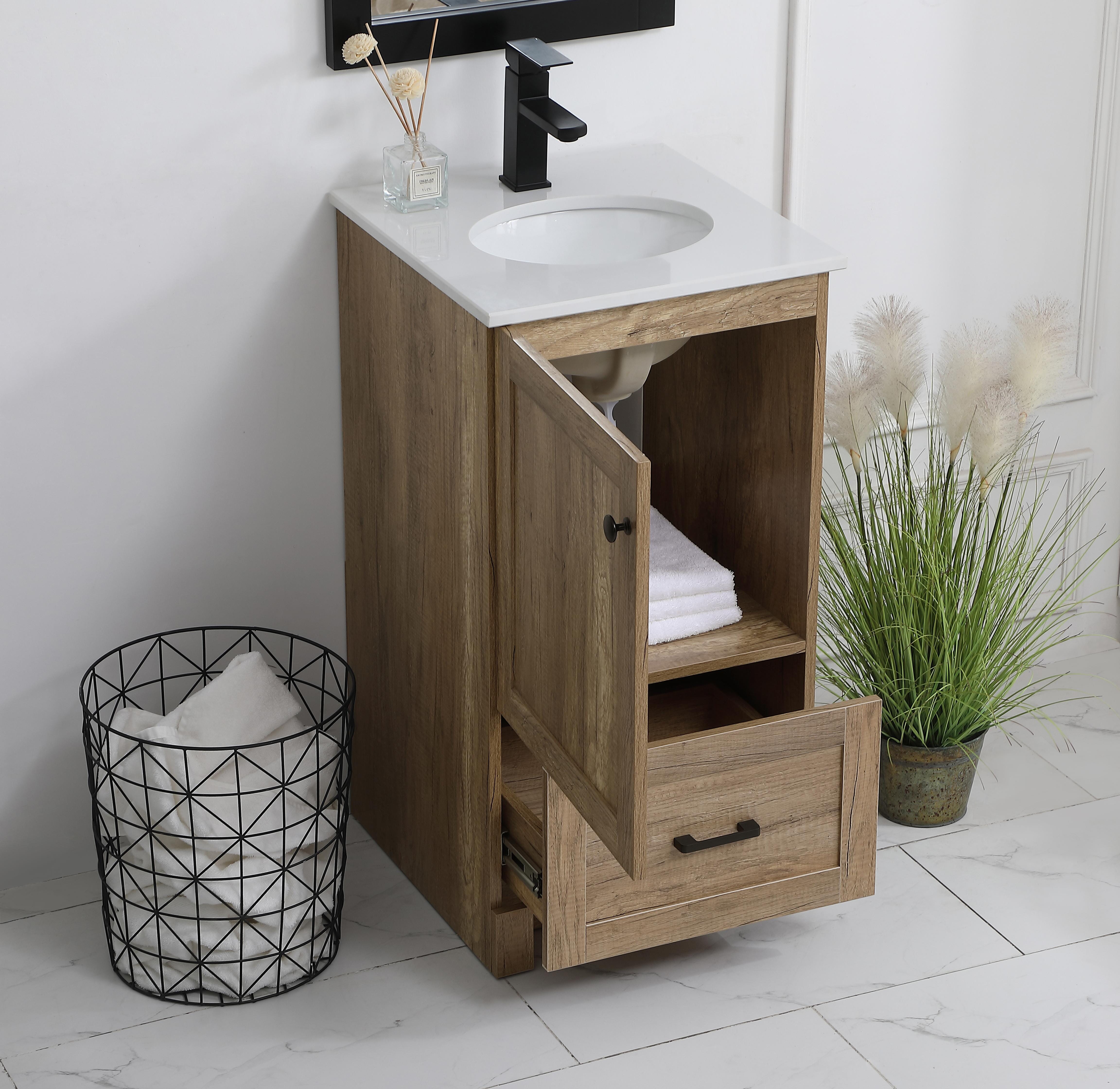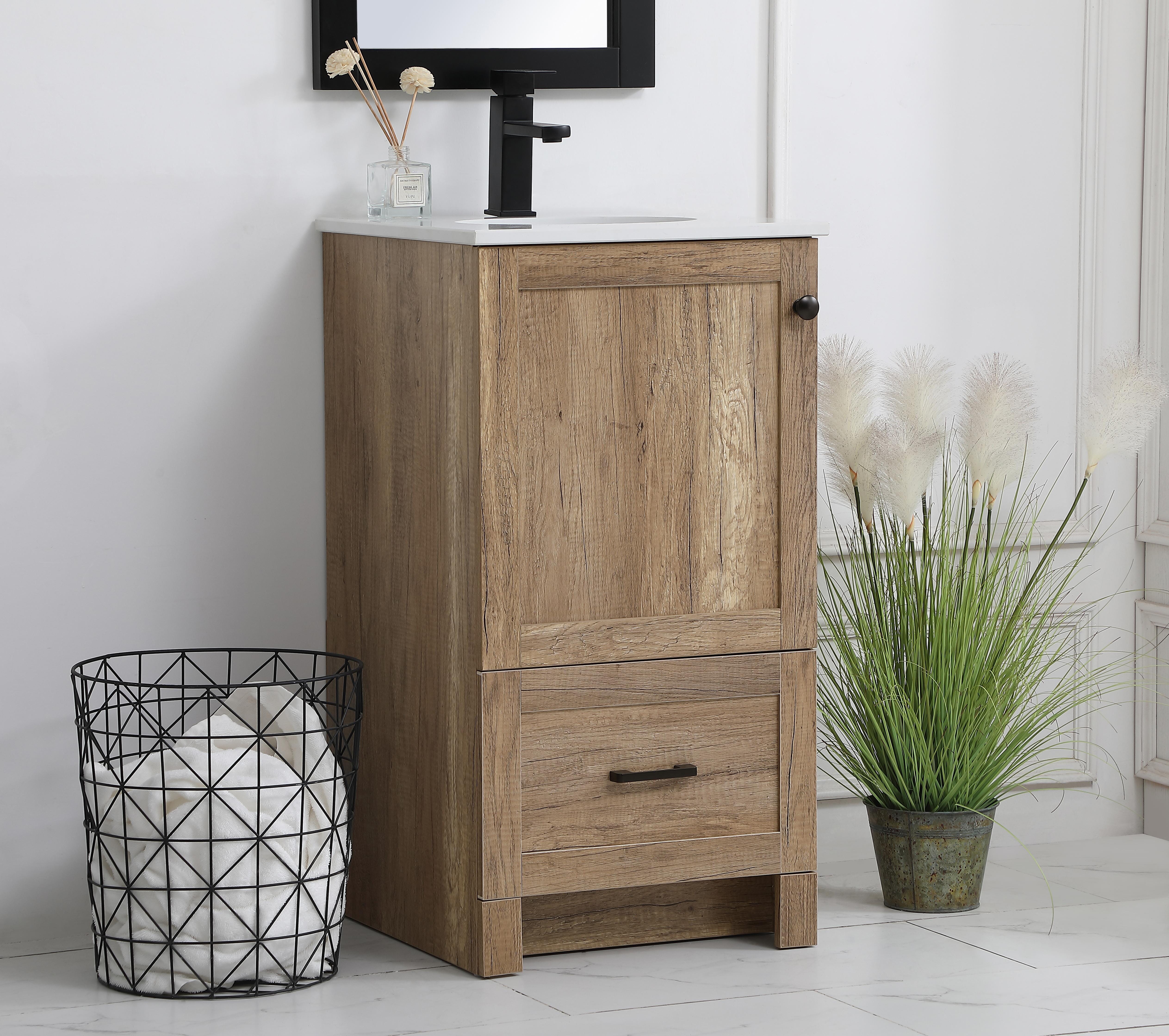 Delve into a world of minimalistic fashion and contemporary styling with this farmhouse 18" vanity. The clean faux lines anchors the weathered design. Black handle adorns the door hiding the base of the integrated porcelain sink while the bottom drawer allows you to store your bathroom necessities and toiletries. The compact size makes it the perfect vanity for any bathroom or powder room, regardless of size.