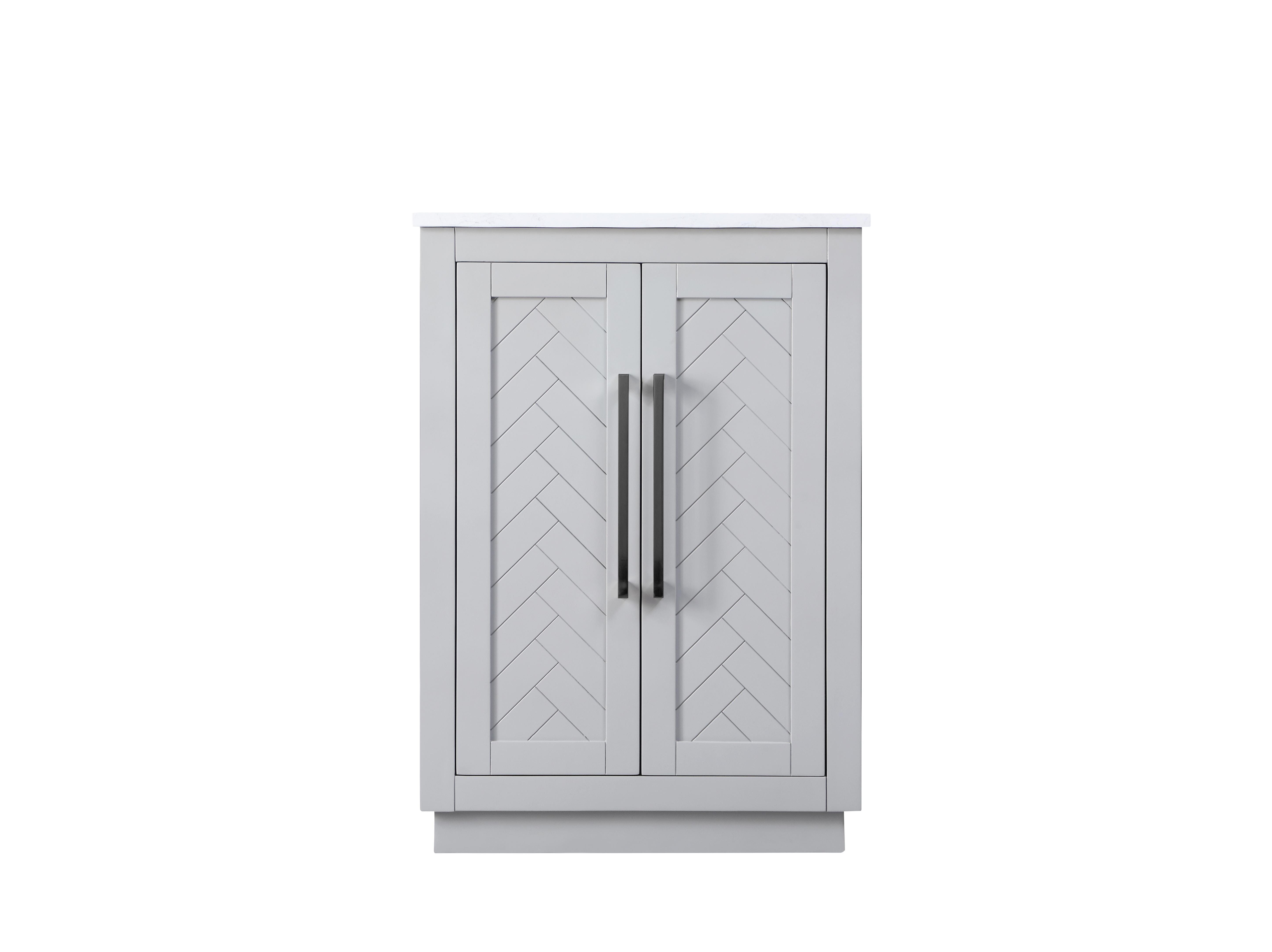 This transitional bathroom vanity offers the perfect blend of timeless style and modern functionality. Available in five refined finishes—crisp white, sleek grey, chocolate oak, honey oak, and linen oak—it complements a range of decor styles, from classic to contemporary. The stunning herringbone design on the Shaker-style door panels adds texture and craftsmanship to the piece. Topped with a white engineered marble countertop featuring subtle veining, it provides both beauty and durability. The long black metal pulls on the soft-closing doors add sleek, modern detailing. Practical features include a concealed overflow, a back panel cutout for easy plumbing installation, and a U-shaped cutout shelf to fit plumbing while maximizing storage space. With a toe kick all around the base, this vanity is thoughtfully designed to blend form and function in any bathroom setting.
