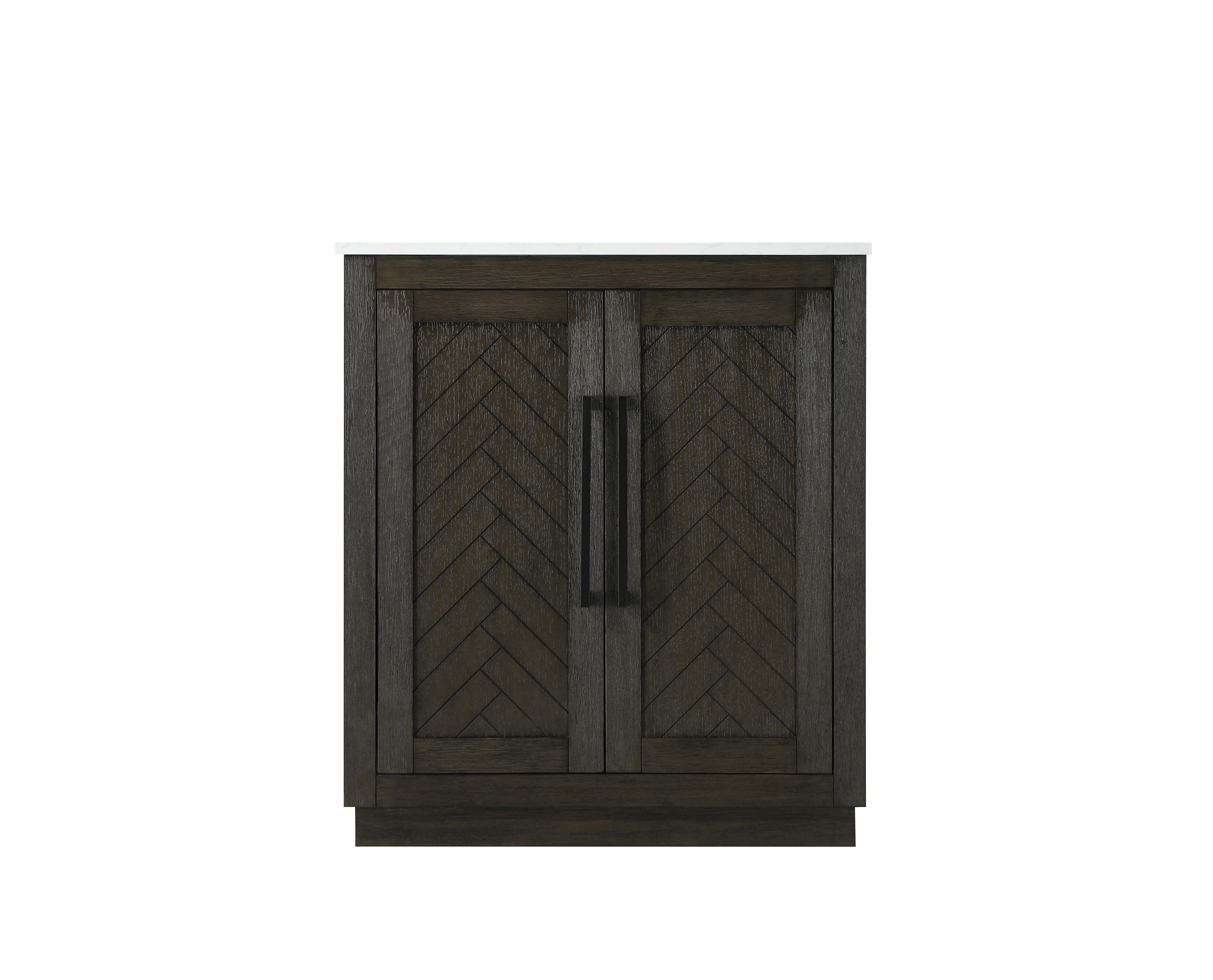 This transitional bathroom vanity offers the perfect blend of timeless style and modern functionality. Available in five refined finishes—crisp white, sleek grey, chocolate oak, honey oak, and linen oak—it complements a range of decor styles, from classic to contemporary. The stunning herringbone design on the Shaker-style door panels adds texture and craftsmanship to the piece. Topped with a white engineered marble countertop featuring subtle veining, it provides both beauty and durability. The long black metal pulls on the soft-closing doors add sleek, modern detailing. Practical features include a concealed overflow, a back panel cutout for easy plumbing installation, and a U-shaped cutout shelf to fit plumbing while maximizing storage space. With a toe kick all around the base, this vanity is thoughtfully designed to blend form and function in any bathroom setting.