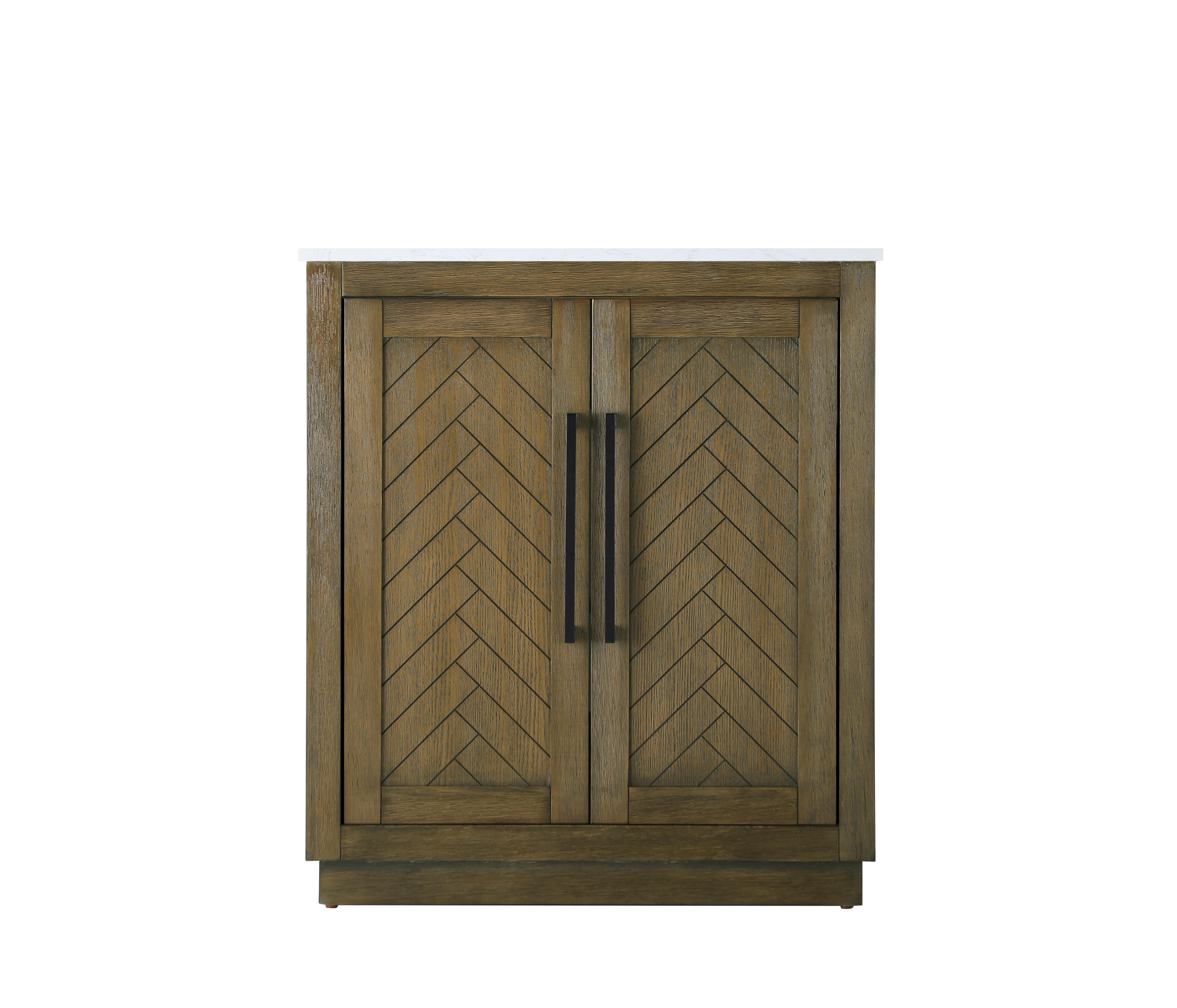 This transitional bathroom vanity offers the perfect blend of timeless style and modern functionality. Available in five refined finishes—crisp white, sleek grey, chocolate oak, honey oak, and linen oak—it complements a range of decor styles, from classic to contemporary. The stunning herringbone design on the Shaker-style door panels adds texture and craftsmanship to the piece. Topped with a white engineered marble countertop featuring subtle veining, it provides both beauty and durability. The long black metal pulls on the soft-closing doors add sleek, modern detailing. Practical features include a concealed overflow, a back panel cutout for easy plumbing installation, and a U-shaped cutout shelf to fit plumbing while maximizing storage space. With a toe kick all around the base, this vanity is thoughtfully designed to blend form and function in any bathroom setting.