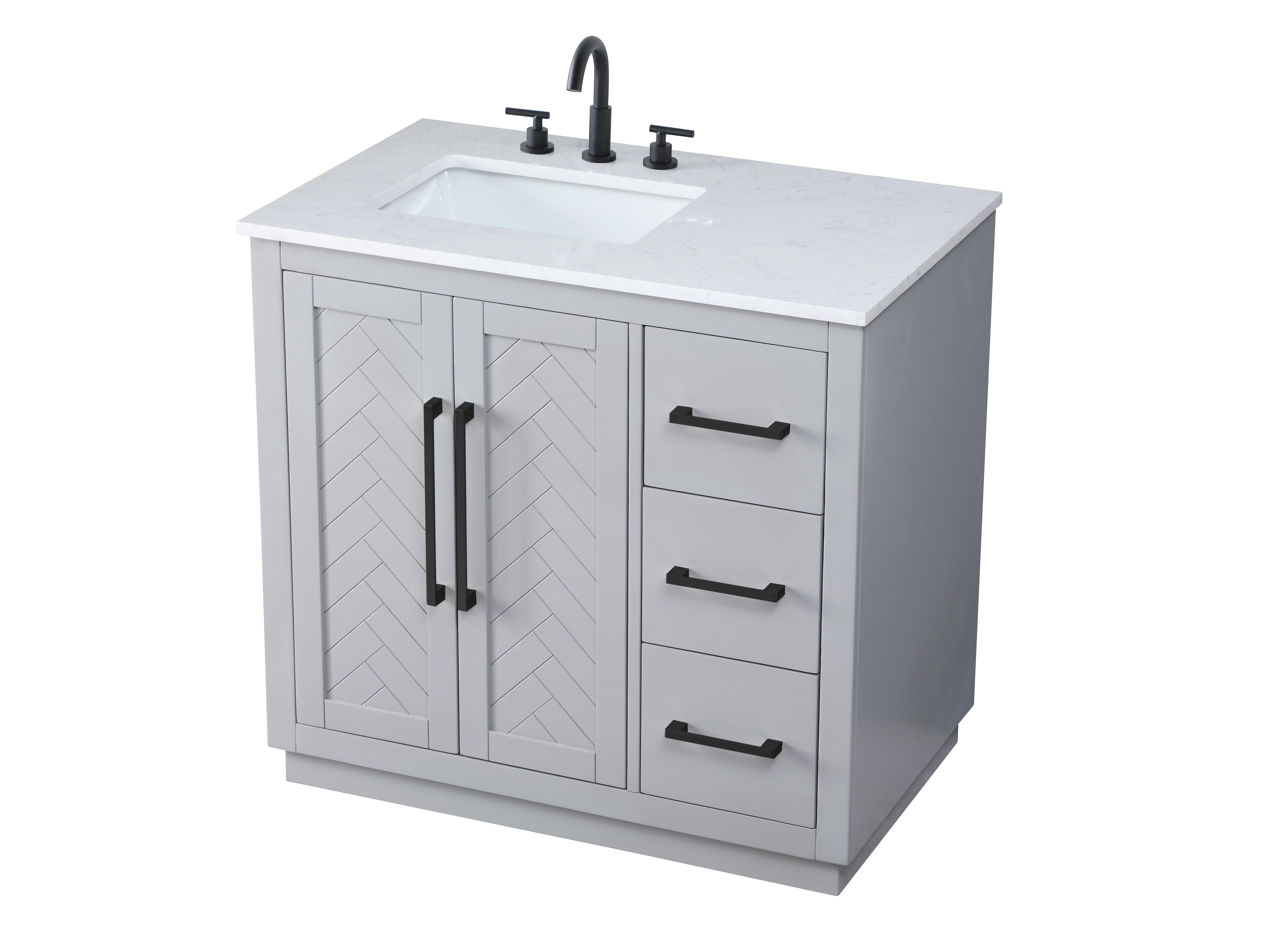 This transitional bathroom vanity offers the perfect blend of timeless style and modern functionality. Available in five refined finishes—crisp white, sleek grey, chocolate oak, honey oak, and linen oak—it complements a range of decor styles, from classic to contemporary. The stunning herringbone design on the Shaker-style door panels adds texture and craftsmanship to the piece. Topped with a white engineered marble countertop featuring subtle veining, it provides both beauty and durability. The long black metal pulls on the soft-closing doors and the thin bar pulls on the drawers add sleek, modern detailing. Practical features include a concealed overflow, a back panel cutout for easy plumbing installation, and a U-shaped cutout shelf to fit plumbing while maximizing storage space. With a toe kick all around the base, this vanity is thoughtfully designed to blend form and function in any bathroom setting.