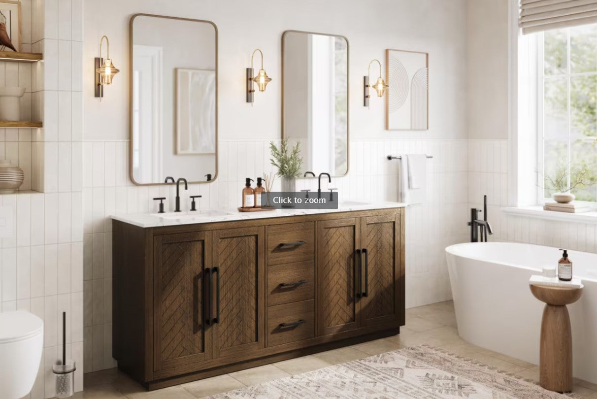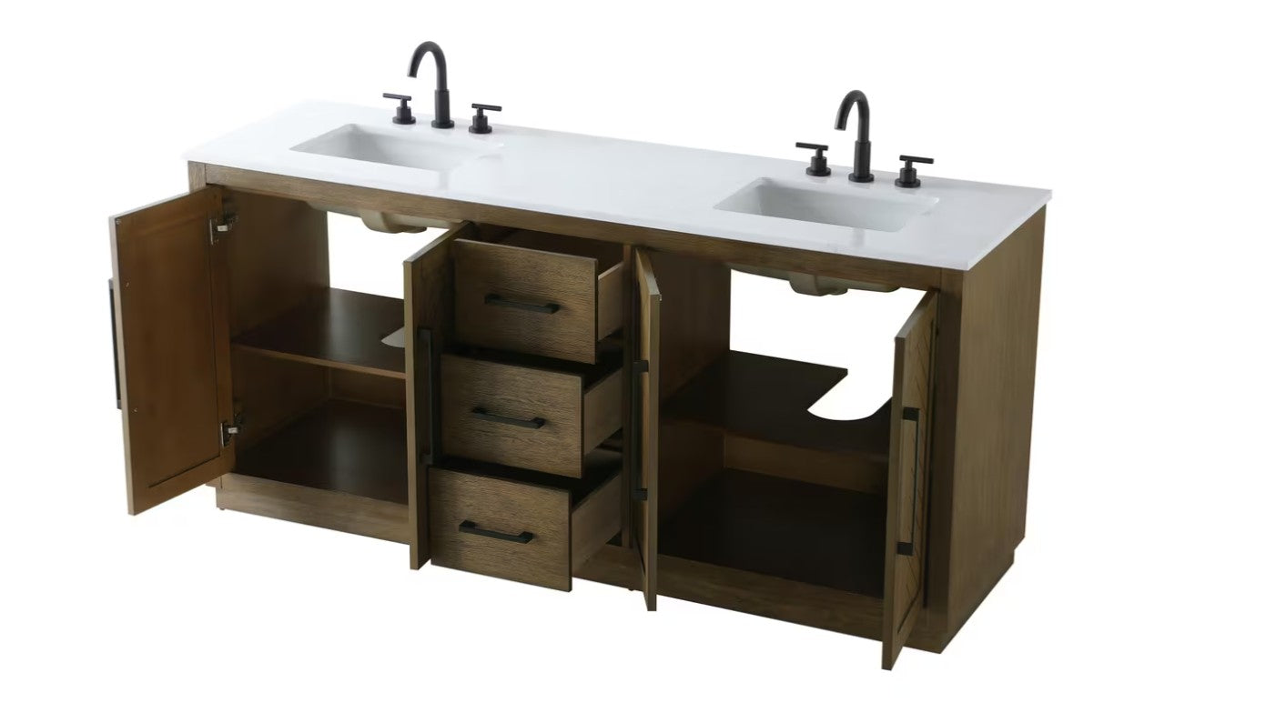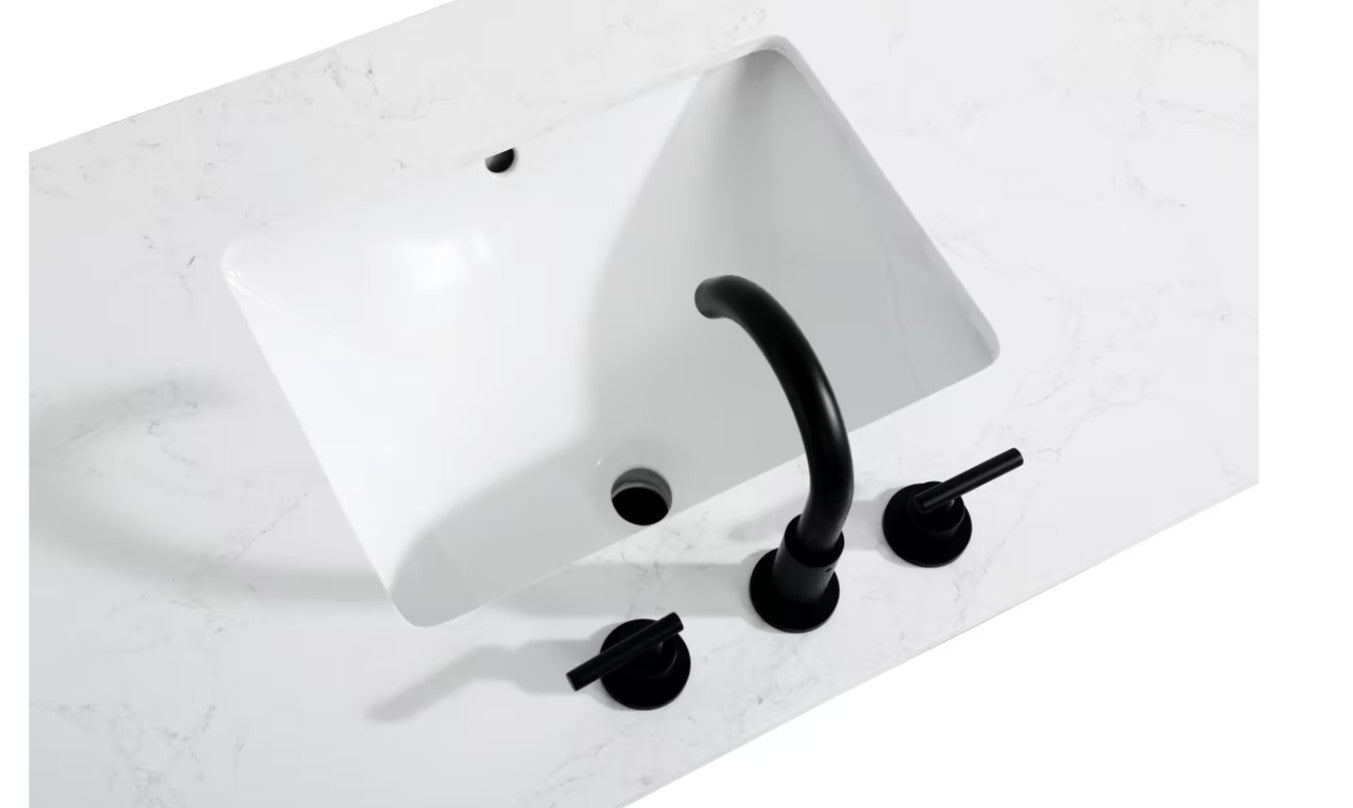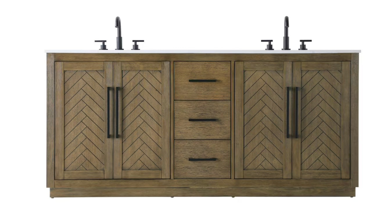 This transitional bathroom vanity offers the perfect blend of timeless style and modern functionality. Available in five refined finishes—crisp white, sleek grey, chocolate oak, honey oak, and linen oak—it complements a range of decor styles, from classic to contemporary. The stunning herringbone design on the Shaker-style door panels adds texture and craftsmanship to the piece. Topped with a white engineered marble countertop featuring subtle veining, it provides both beauty and durability. The long black metal pulls on the soft-closing doors and the thin bar pulls on the drawers add sleek, modern detailing. Practical features include a concealed overflow, a back panel cutout for easy plumbing installation, and a U-shaped cutout shelf to fit plumbing while maximizing storage space. With a toe kick all around the base, this vanity is thoughtfully designed to blend form and function in any bathroom setting.