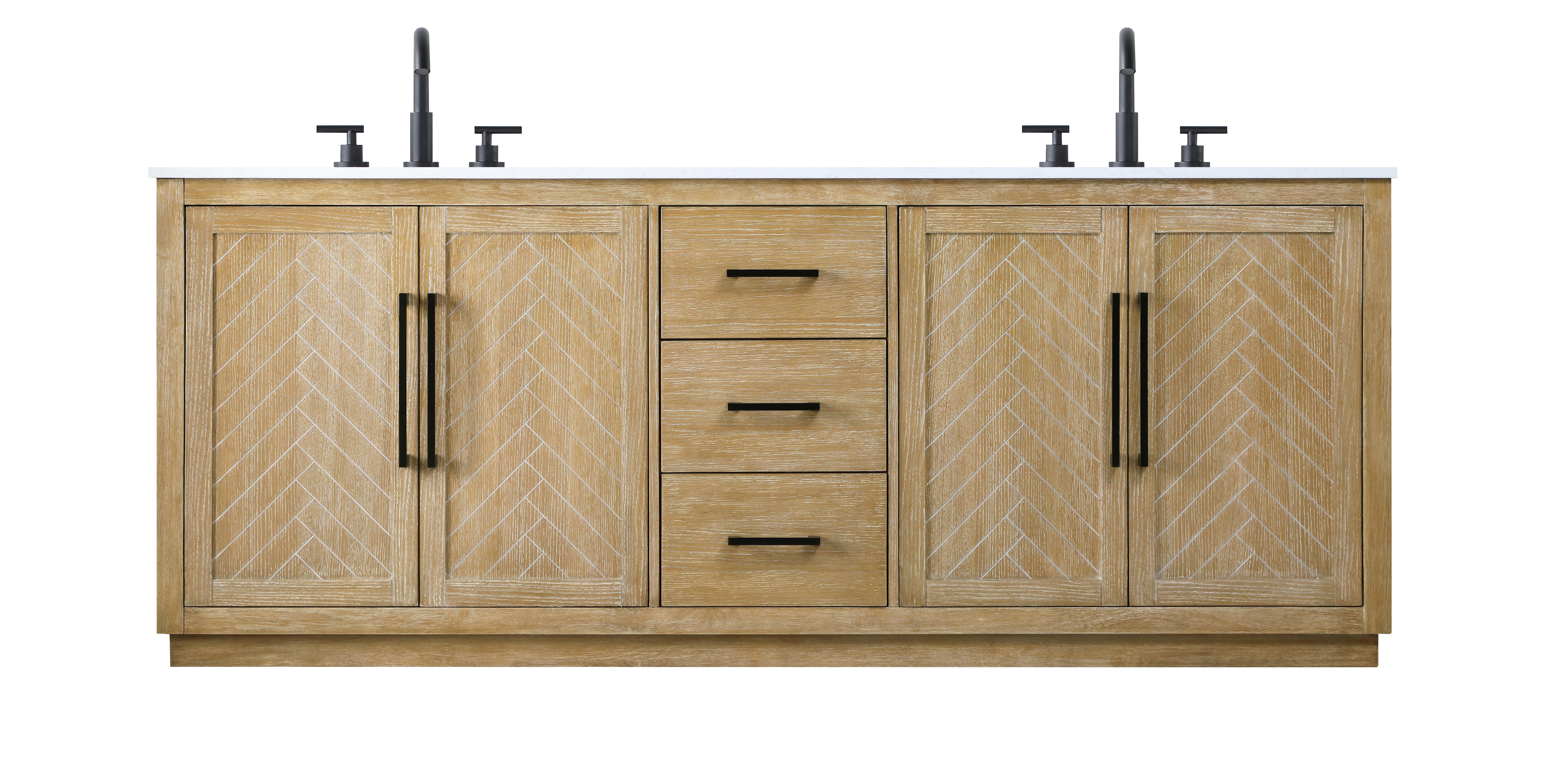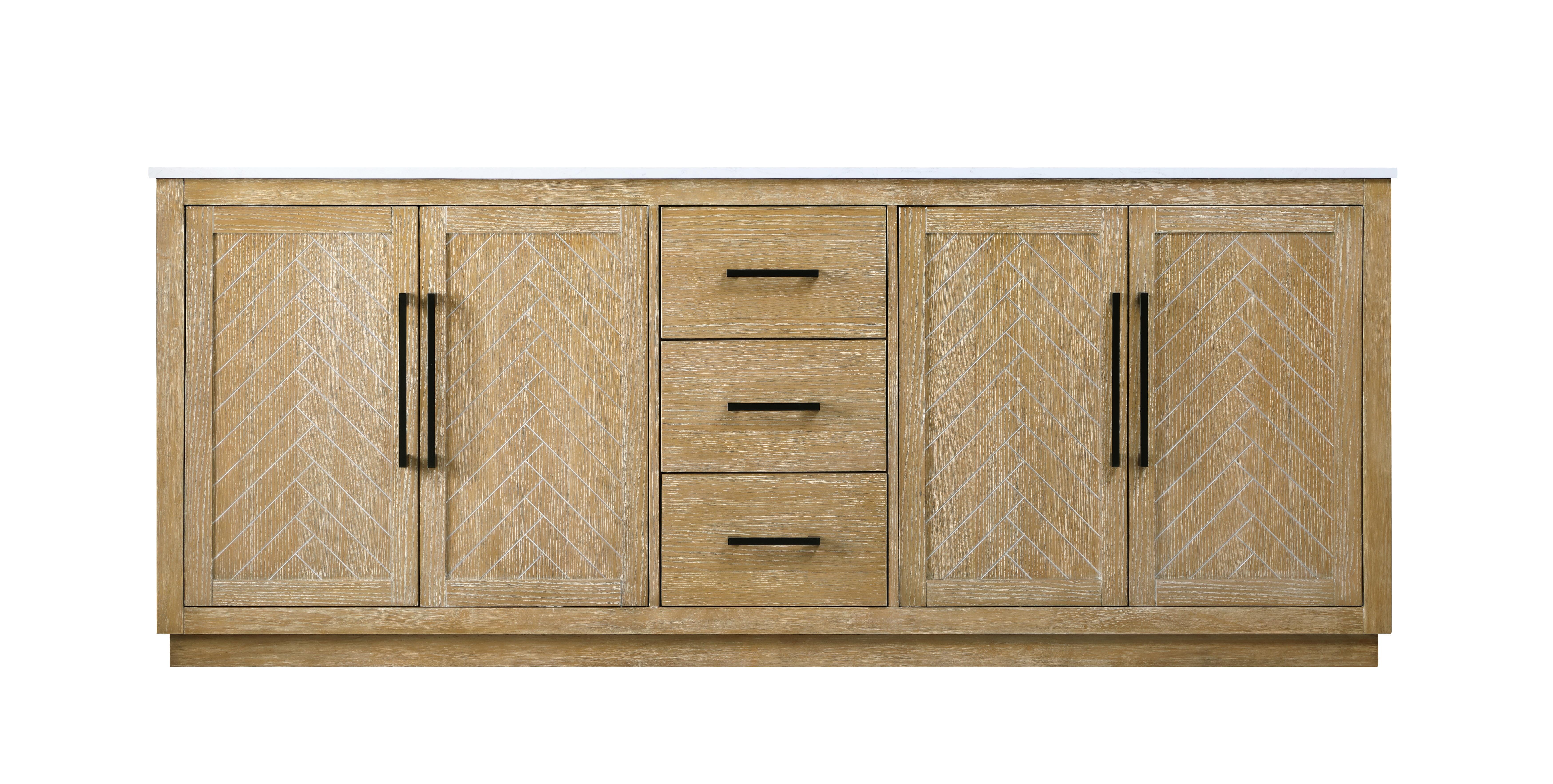 This transitional bathroom vanity offers the perfect blend of timeless style and modern functionality. Available in five refined finishes—crisp white, sleek grey, chocolate oak, honey oak, and linen oak—it complements a range of decor styles, from classic to contemporary. The stunning herringbone design on the Shaker-style door panels adds texture and craftsmanship to the piece. Topped with a white engineered marble countertop featuring subtle veining, it provides both beauty and durability. The long black metal pulls on the soft-closing doors and the thin bar pulls on the drawers add sleek, modern detailing. Practical features include a concealed overflow, a back panel cutout for easy plumbing installation, and a U-shaped cutout shelf to fit plumbing while maximizing storage space. With a toe kick all around the base, this vanity is thoughtfully designed to blend form and function in any bathroom setting.