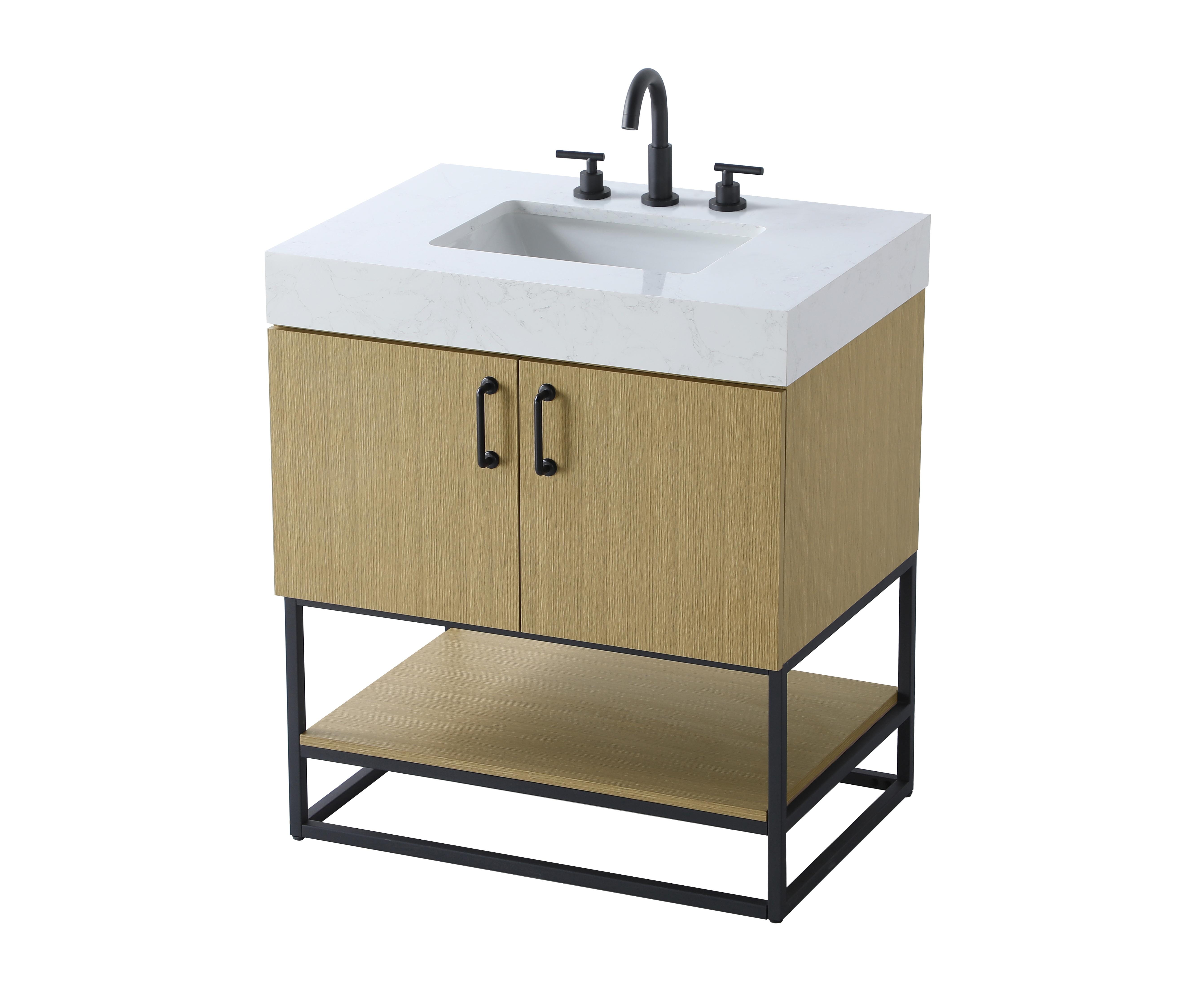Upgrade your bathroom with this stylish transitional vanity, available in five stunning finishes, from crisp white to warm honey brown, designed to suit a variety of decor styles. The minimalist flat door panels and open wood shelf create a functional yet visually appealing storage solution, while the slender black metal legs elevate the look with modern sophistication. The 4-inch thick white engineered marble countertop, accented with natural veining, adds a luxurious touch, perfectly complemented by soft-closing doors with sleek black metal bar pulls. Thoughtful details like the concealed overflow, back panel cutout for plumbing, and 3 pre-drilled holes for an 8-inch faucet make installation easy and efficient. With a porcelain sink and farmhouse-inspired touches, this vanity brings both elegance and practicality to any bathroom setting.