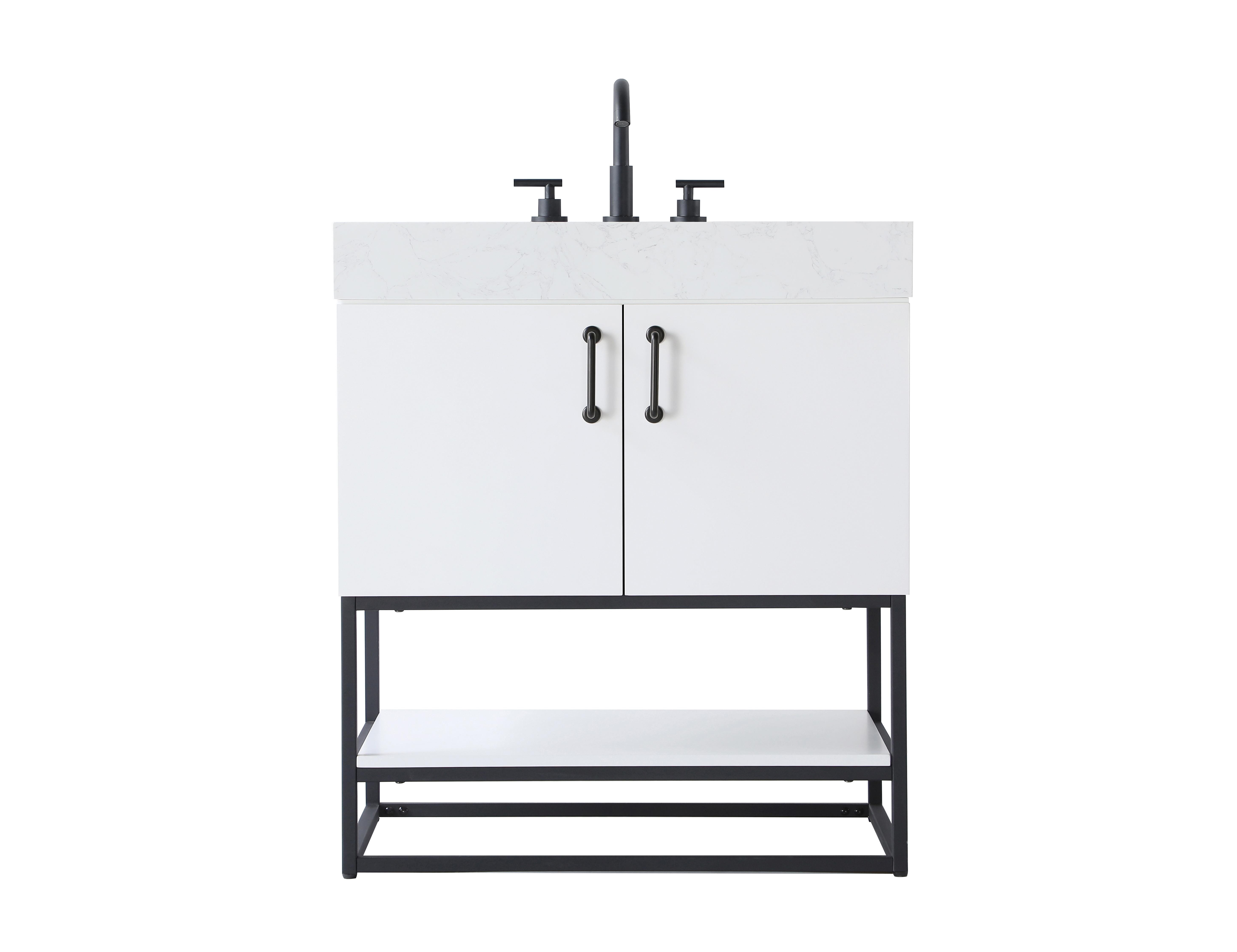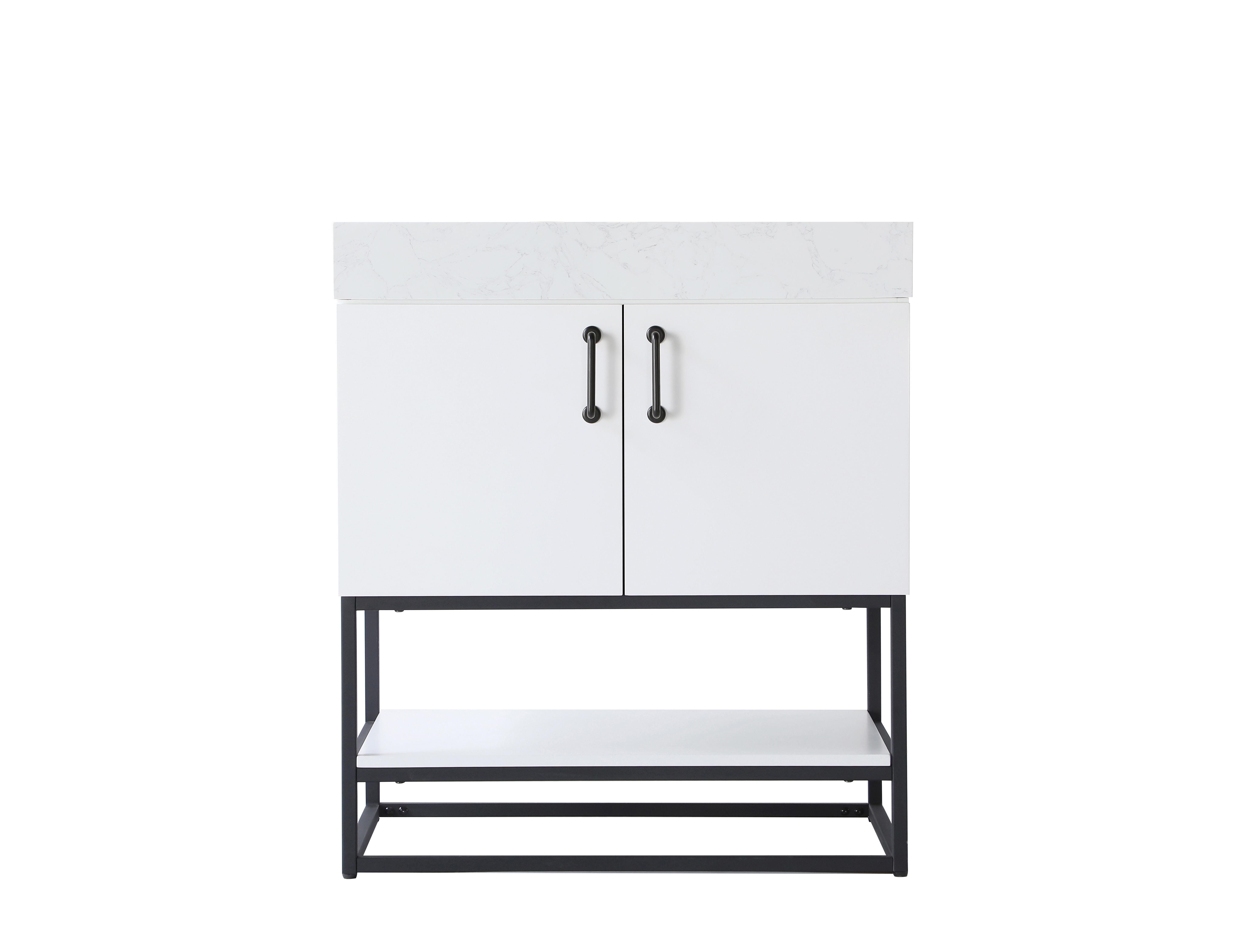 Upgrade your bathroom with this stylish transitional vanity, available in five stunning finishes, from crisp white to warm honey brown, designed to suit a variety of decor styles. The minimalist flat door panels and open wood shelf create a functional yet visually appealing storage solution, while the slender black metal legs elevate the look with modern sophistication. The 4-inch thick white engineered marble countertop, accented with natural veining, adds a luxurious touch, perfectly complemented by soft-closing doors with sleek black metal bar pulls. Thoughtful details like the concealed overflow, back panel cutout for plumbing, and 3 pre-drilled holes for an 8-inch faucet make installation easy and efficient. With a porcelain sink and farmhouse-inspired touches, this vanity brings both elegance and practicality to any bathroom setting.