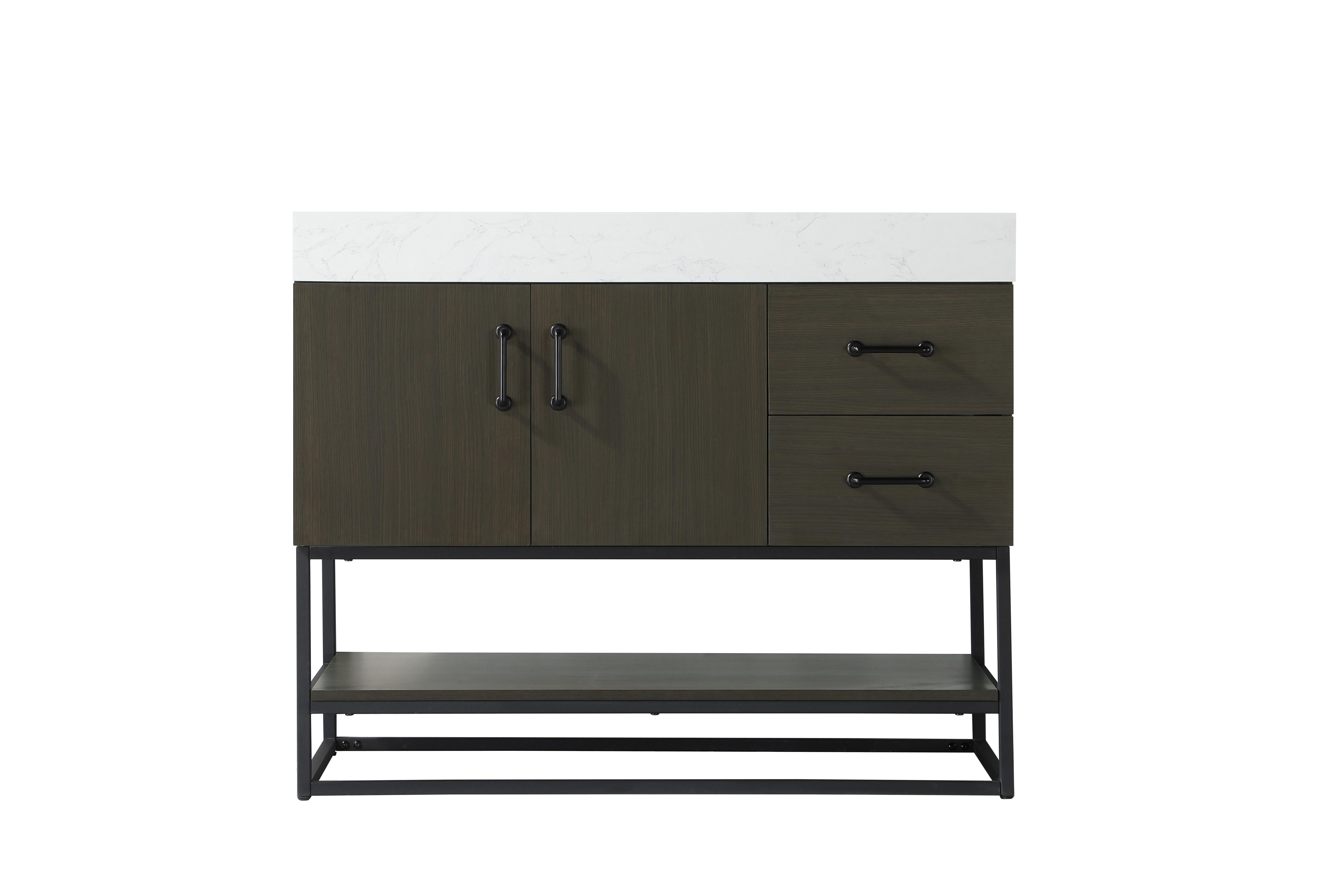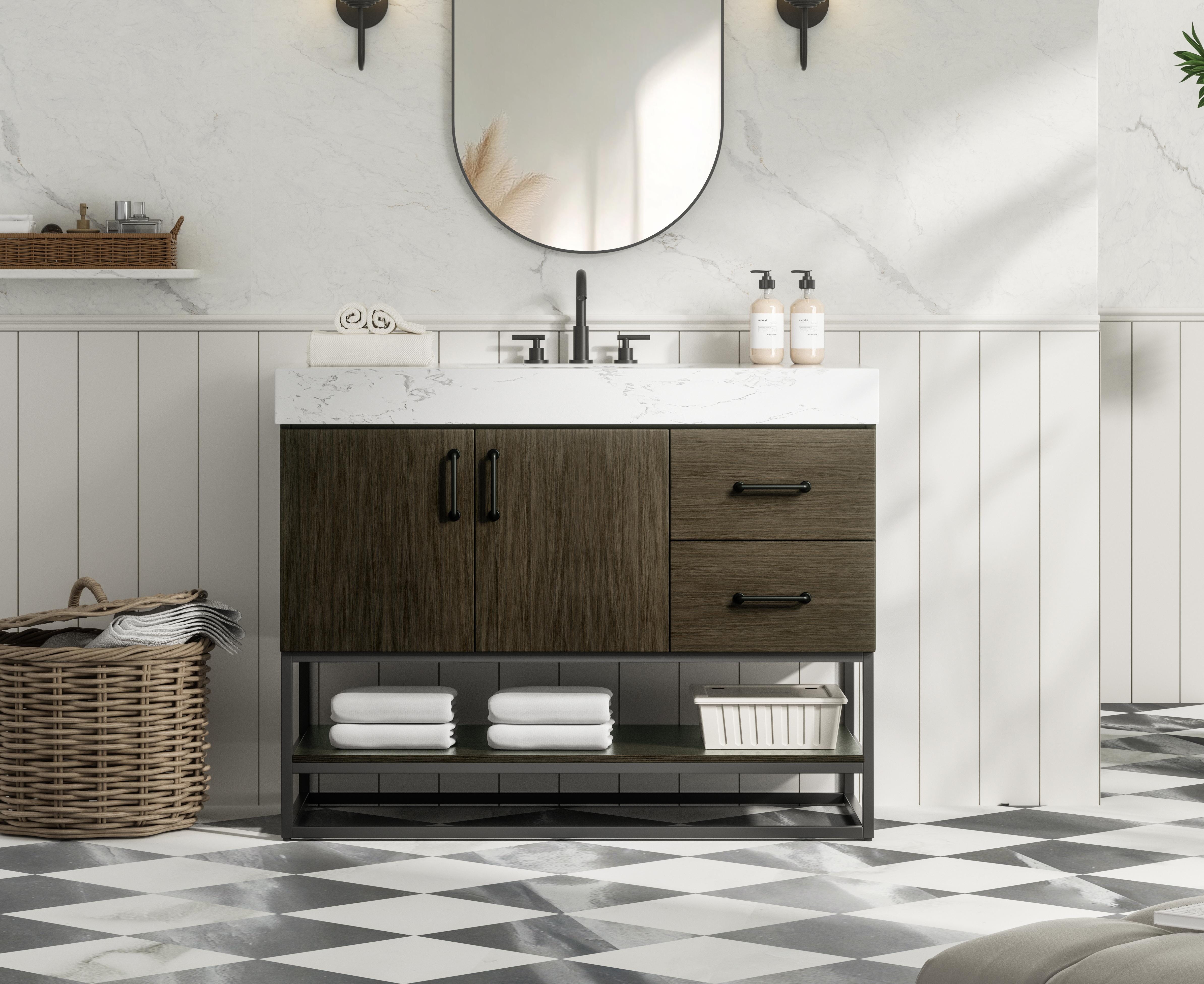 Upgrade your bathroom with this stylish transitional vanity, available in five stunning finishes, from crisp white to warm honey brown, designed to suit a variety of decor styles. The minimalist flat door panels and open wood shelf create a functional yet visually appealing storage solution, while the slender black metal legs elevate the look with modern sophistication. The 4-inch thick white engineered marble countertop, accented with natural veining, adds a luxurious touch, perfectly complemented by soft-closing doors with sleek black metal bar pulls. Thoughtful details like the concealed overflow, back panel cutout for plumbing, and 3 pre-drilled holes for an 8-inch faucet make installation easy and efficient. With a porcelain sink and farmhouse-inspired touches, this vanity brings both elegance and practicality to any bathroom setting.
