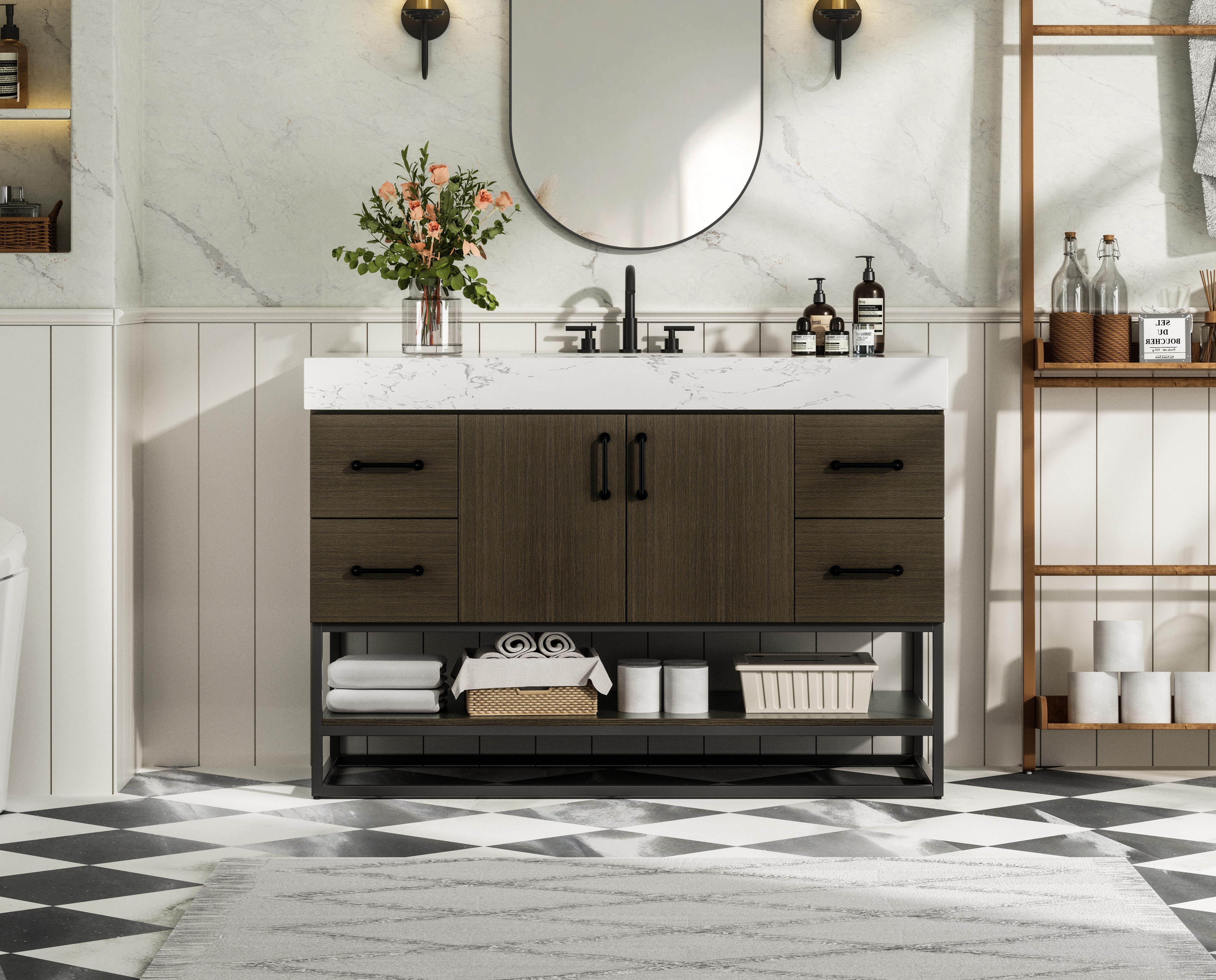 Upgrade your bathroom with this stylish transitional vanity, available in five stunning finishes, from crisp white to warm honey brown, designed to suit a variety of decor styles. The minimalist flat door panels and open wood shelf create a functional yet visually appealing storage solution, while the slender black metal legs elevate the look with modern sophistication. The 4-inch thick white engineered marble countertop, accented with natural veining, adds a luxurious touch, perfectly complemented by soft-closing doors with sleek black metal bar pulls. Thoughtful details like the concealed overflow, back panel cutout for plumbing, and 3 pre-drilled holes for an 8-inch faucet make installation easy and efficient. With a porcelain sink and farmhouse-inspired touches, this vanity brings both elegance and practicality to any bathroom setting.