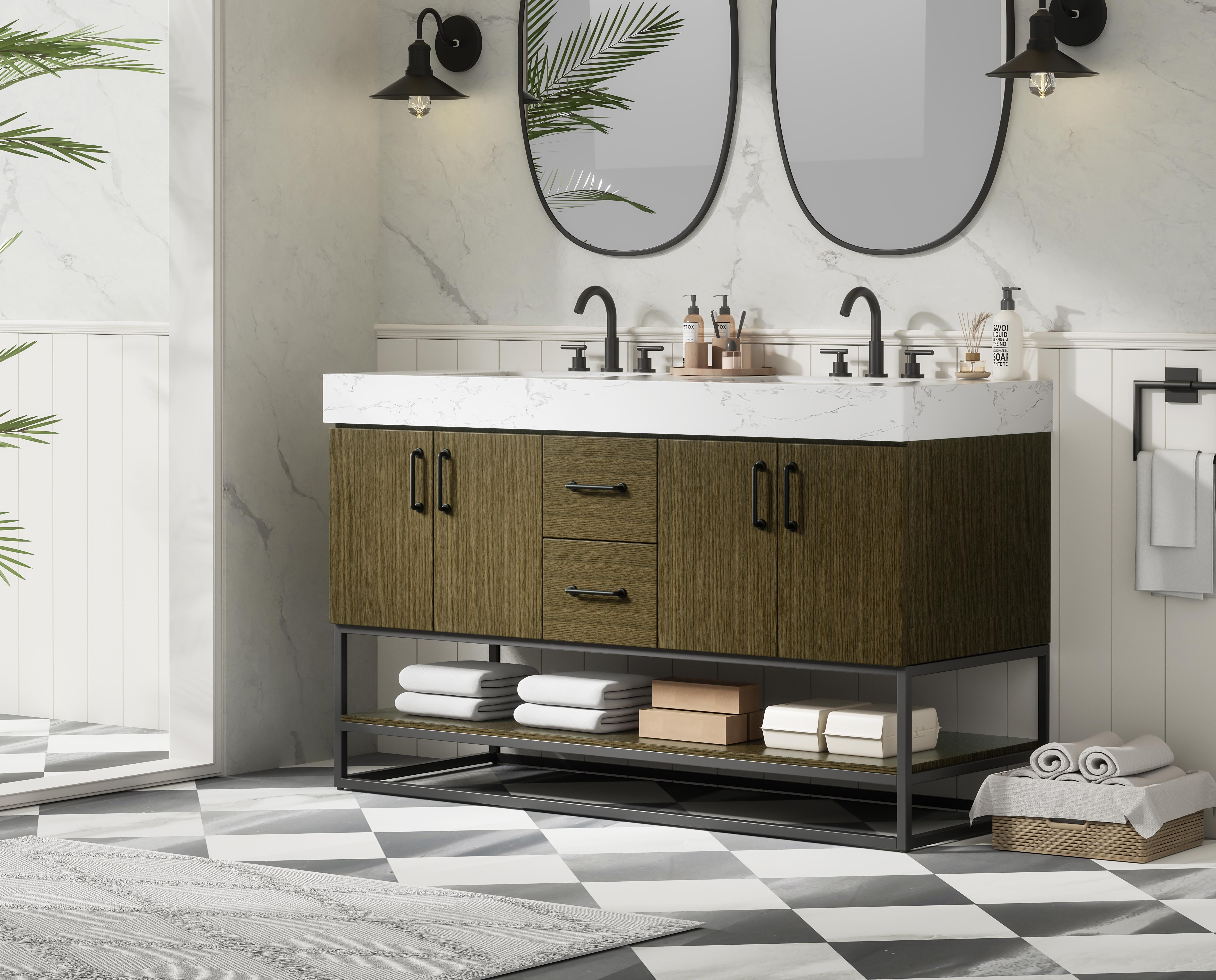 Upgrade your bathroom with this stylish transitional vanity, available in five stunning finishes, from crisp white to warm honey brown, designed to suit a variety of decor styles. The minimalist flat door panels and open wood shelf create a functional yet visually appealing storage solution, while the slender black metal legs elevate the look with modern sophistication. The 4-inch thick white engineered marble countertop, accented with natural veining, adds a luxurious touch, perfectly complemented by soft-closing doors with sleek black metal bar pulls. Thoughtful details like the concealed overflow, back panel cutout for plumbing, and 3 pre-drilled holes for an 8-inch faucet make installation easy and efficient. With a porcelain sink and farmhouse-inspired touches, this vanity brings both elegance and practicality to any bathroom setting.