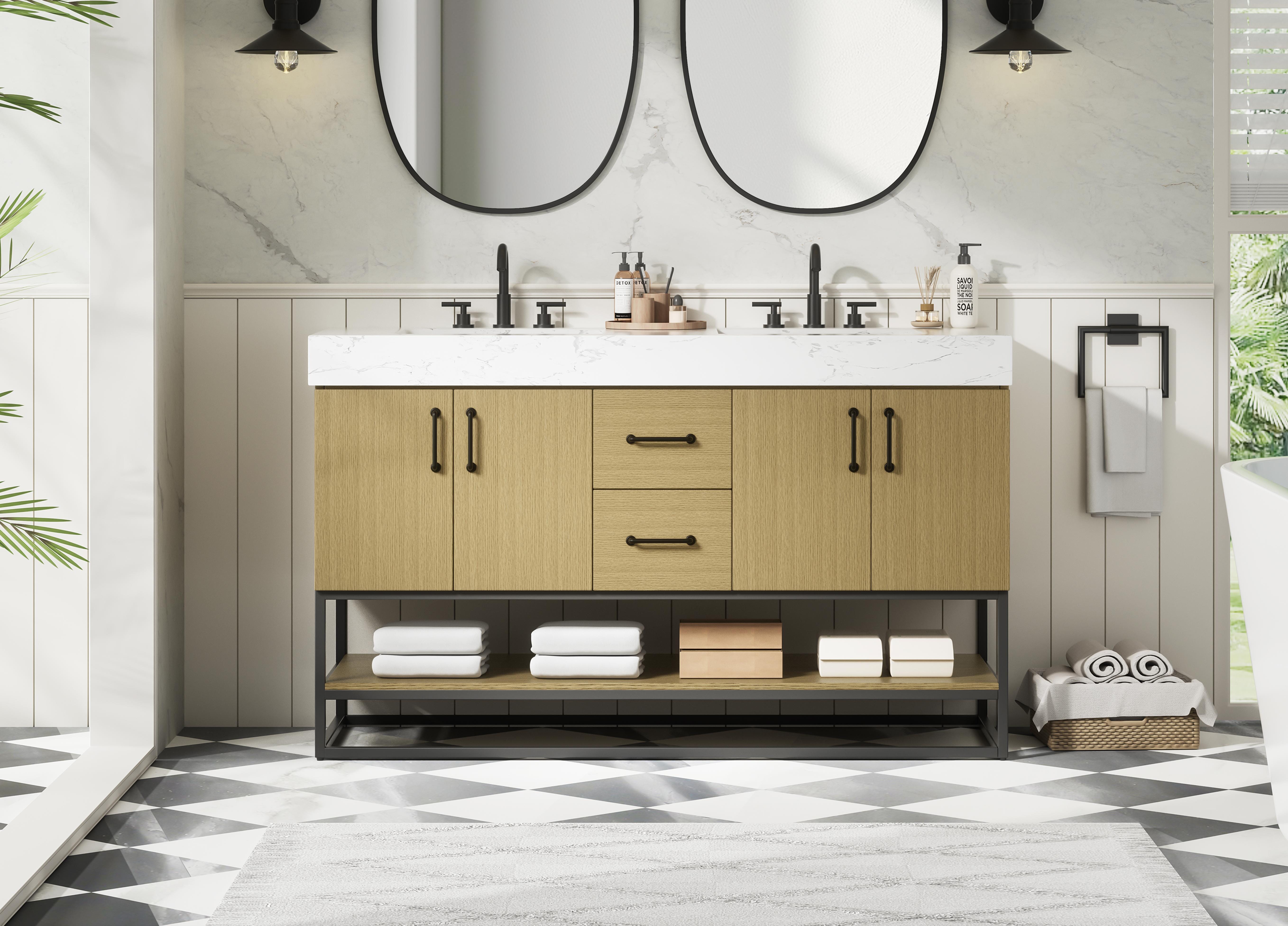 Upgrade your bathroom with this stylish transitional vanity, available in five stunning finishes, from crisp white to warm honey brown, designed to suit a variety of decor styles. The minimalist flat door panels and open wood shelf create a functional yet visually appealing storage solution, while the slender black metal legs elevate the look with modern sophistication. The 4-inch thick white engineered marble countertop, accented with natural veining, adds a luxurious touch, perfectly complemented by soft-closing doors with sleek black metal bar pulls. Thoughtful details like the concealed overflow, back panel cutout for plumbing, and 3 pre-drilled holes for an 8-inch faucet make installation easy and efficient. With a porcelain sink and farmhouse-inspired touches, this vanity brings both elegance and practicality to any bathroom setting.