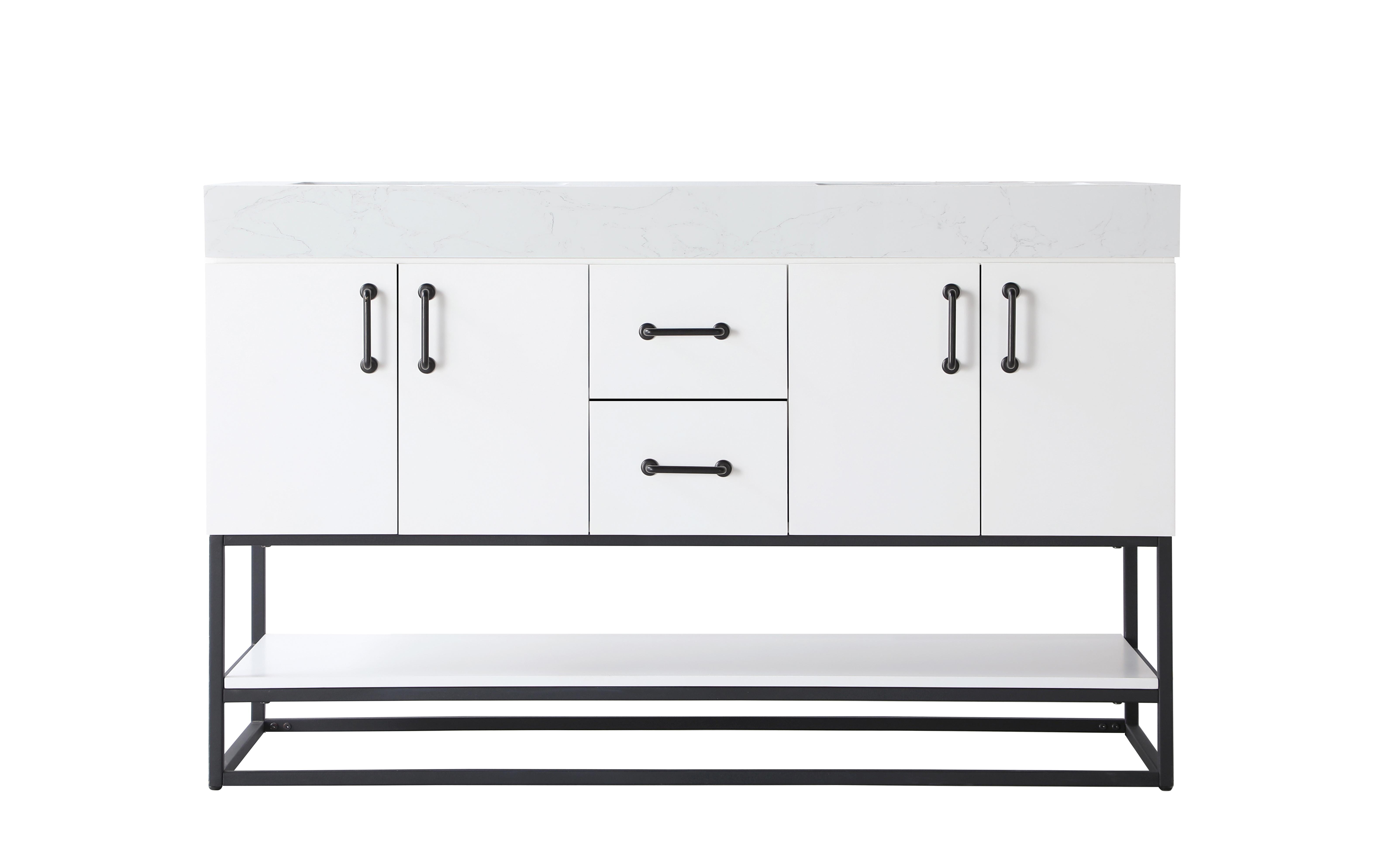 Upgrade your bathroom with this stylish transitional vanity, available in five stunning finishes, from crisp white to warm honey brown, designed to suit a variety of decor styles. The minimalist flat door panels and open wood shelf create a functional yet visually appealing storage solution, while the slender black metal legs elevate the look with modern sophistication. The 4-inch thick white engineered marble countertop, accented with natural veining, adds a luxurious touch, perfectly complemented by soft-closing doors with sleek black metal bar pulls. Thoughtful details like the concealed overflow, back panel cutout for plumbing, and 3 pre-drilled holes for an 8-inch faucet make installation easy and efficient. With a porcelain sink and farmhouse-inspired touches, this vanity brings both elegance and practicality to any bathroom setting.