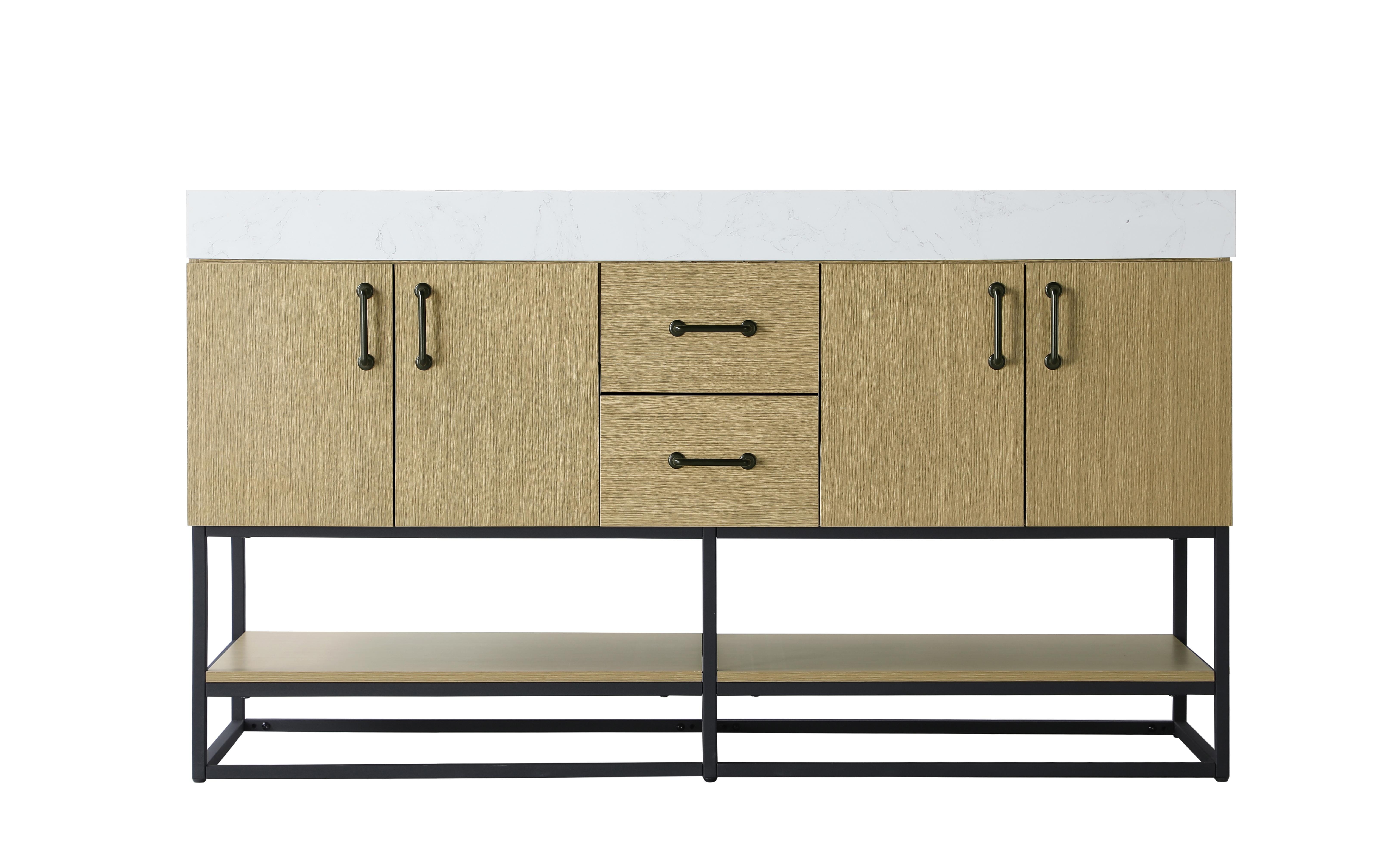 Upgrade your bathroom with this stylish transitional vanity, available in five stunning finishes, from crisp white to warm honey brown, designed to suit a variety of decor styles. The minimalist flat door panels and open wood shelf create a functional yet visually appealing storage solution, while the slender black metal legs elevate the look with modern sophistication. The 4-inch thick white engineered marble countertop, accented with natural veining, adds a luxurious touch, perfectly complemented by soft-closing doors with sleek black metal bar pulls. Thoughtful details like the concealed overflow, back panel cutout for plumbing, and 3 pre-drilled holes for an 8-inch faucet make installation easy and efficient. With a porcelain sink and farmhouse-inspired touches, this vanity brings both elegance and practicality to any bathroom setting.