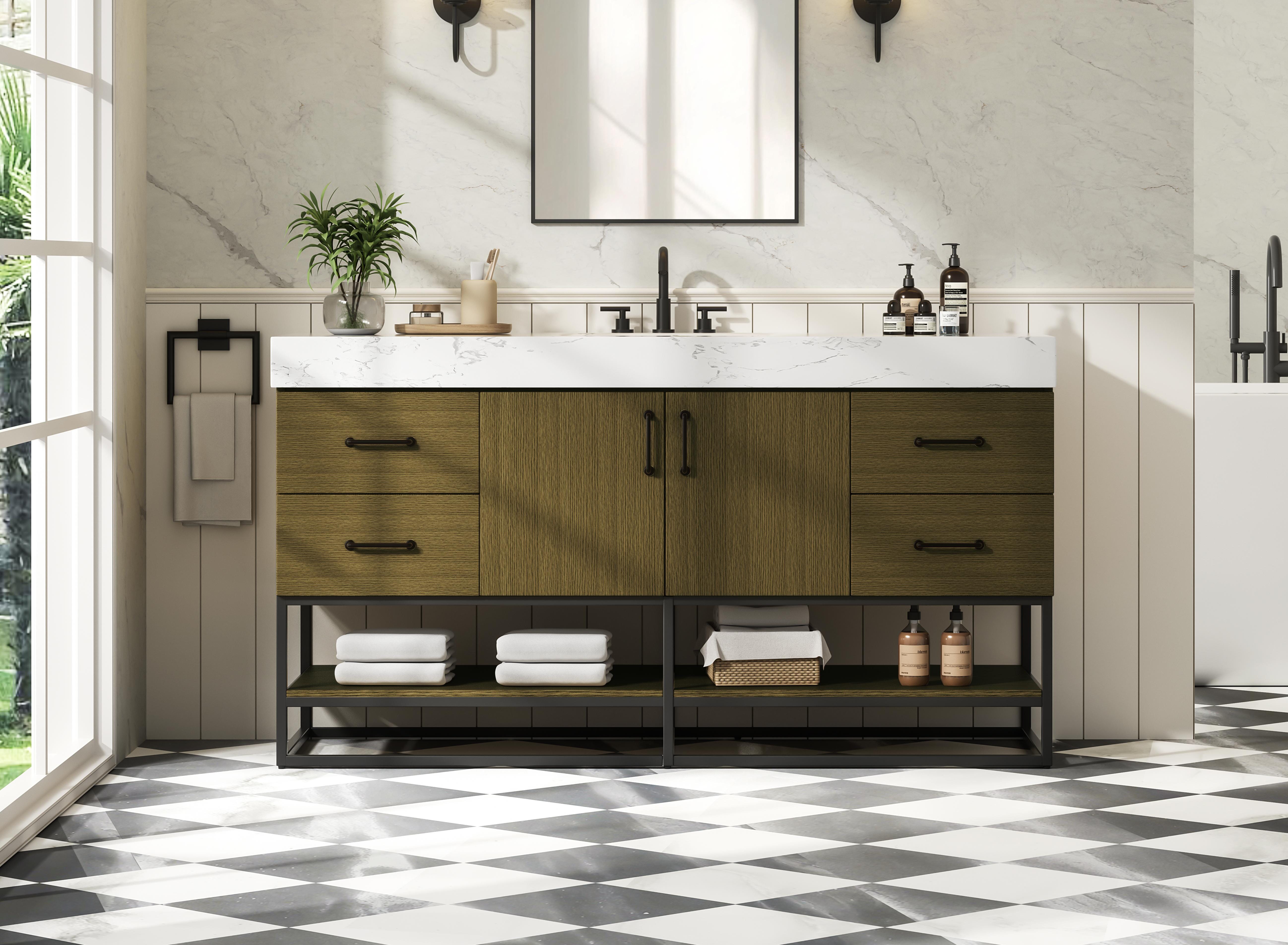 Upgrade your bathroom with this stylish transitional vanity, available in five stunning finishes, from crisp white to warm honey brown, designed to suit a variety of decor styles. The minimalist flat door panels and open wood shelf create a functional yet visually appealing storage solution, while the slender black metal legs elevate the look with modern sophistication. The 4-inch thick white engineered marble countertop, accented with natural veining, adds a luxurious touch, perfectly complemented by soft-closing doors with sleek black metal bar pulls. Thoughtful details like the concealed overflow, back panel cutout for plumbing, and 3 pre-drilled holes for an 8-inch faucet make installation easy and efficient. With a porcelain sink and farmhouse-inspired touches, this vanity brings both elegance and practicality to any bathroom setting.