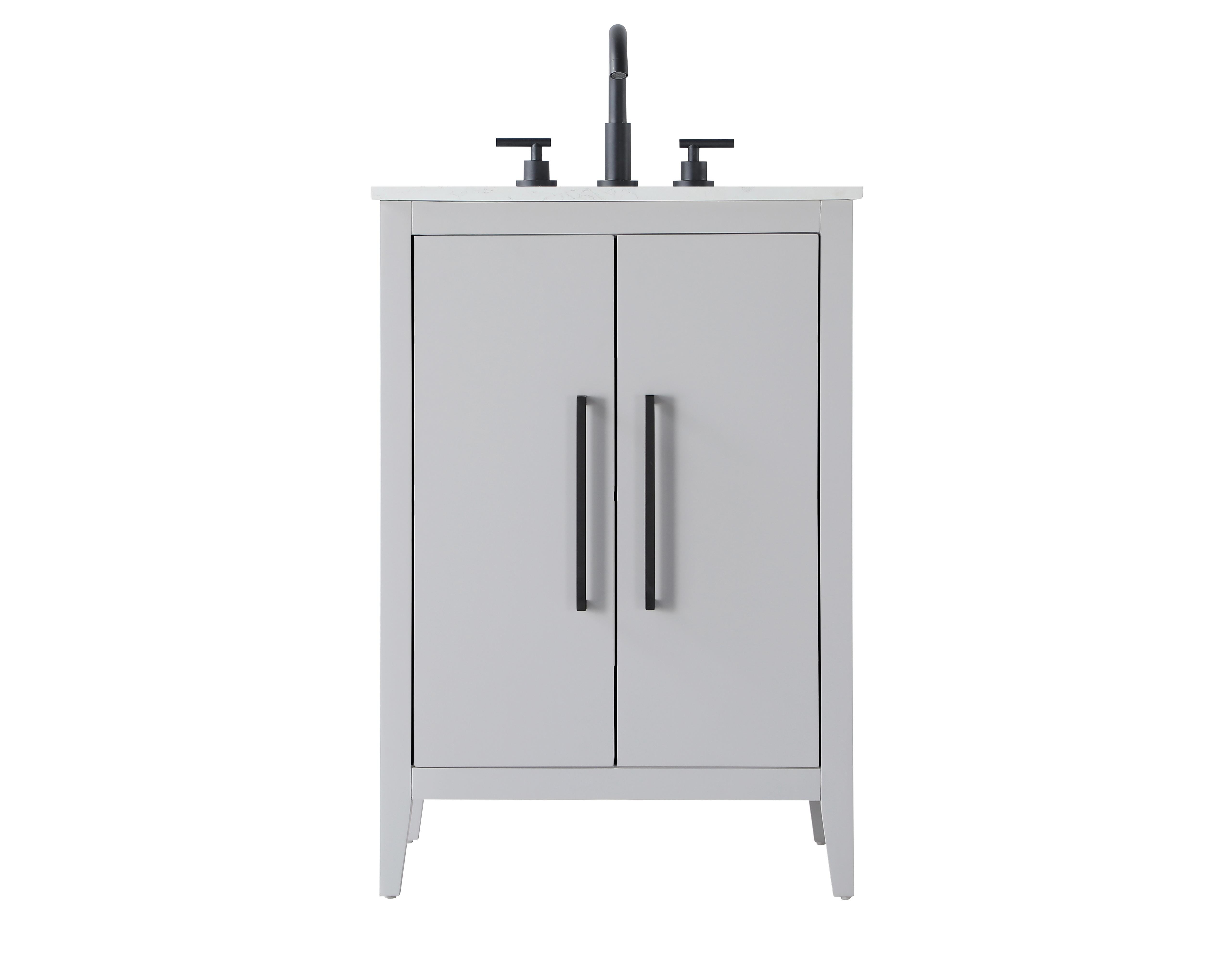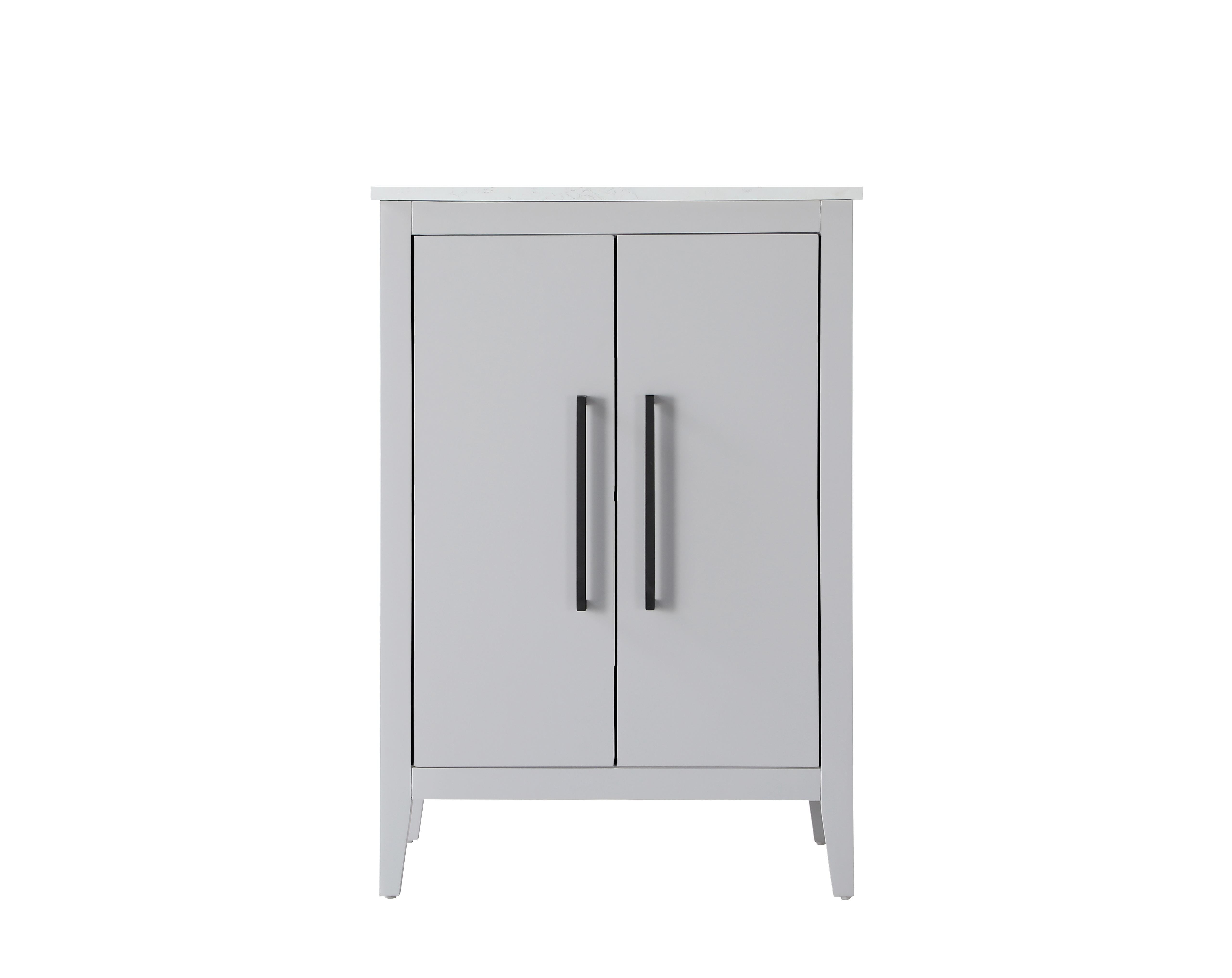 Bring both elegance and practicality to your bathroom with this transitional vanity, available in a selection of rich finishes that highlight the beauty of faux wood grain in shades of mocha, chestnut, and honey, along with classic white and modern grey. The flat door panels and sleek black metal pulls create a minimalist yet refined aesthetic, while the soft-closing drawers and tapered legs with levelers provide smooth, functional operation. Topped with a luxurious white engineered marble countertop and featuring a porcelain sink, this vanity combines timeless style with modern efficiency. Thoughtfully designed with U-shaped cutout for plumbing, it offers ample storage and easy installation, making it the perfect centerpiece for any bathroom.