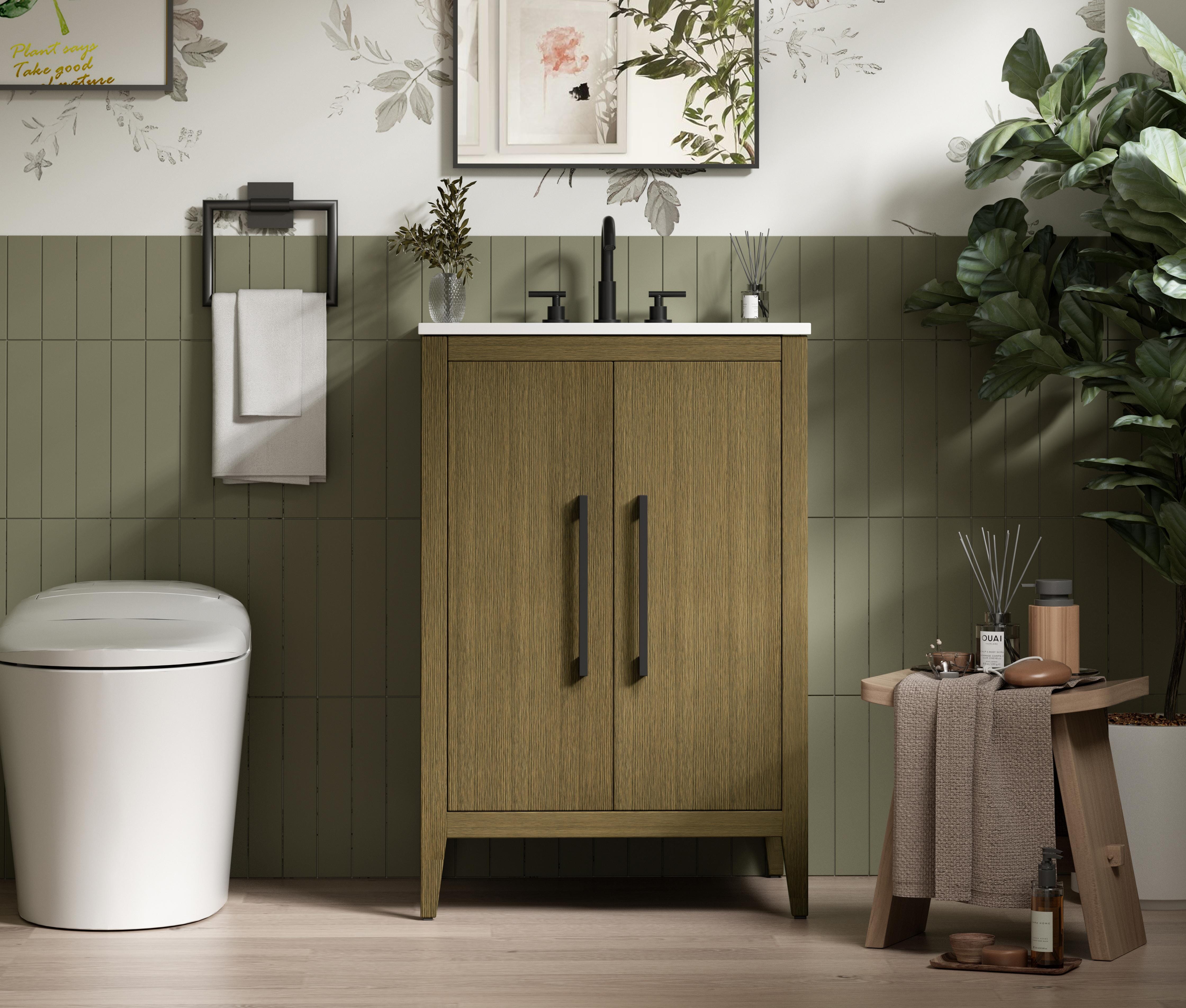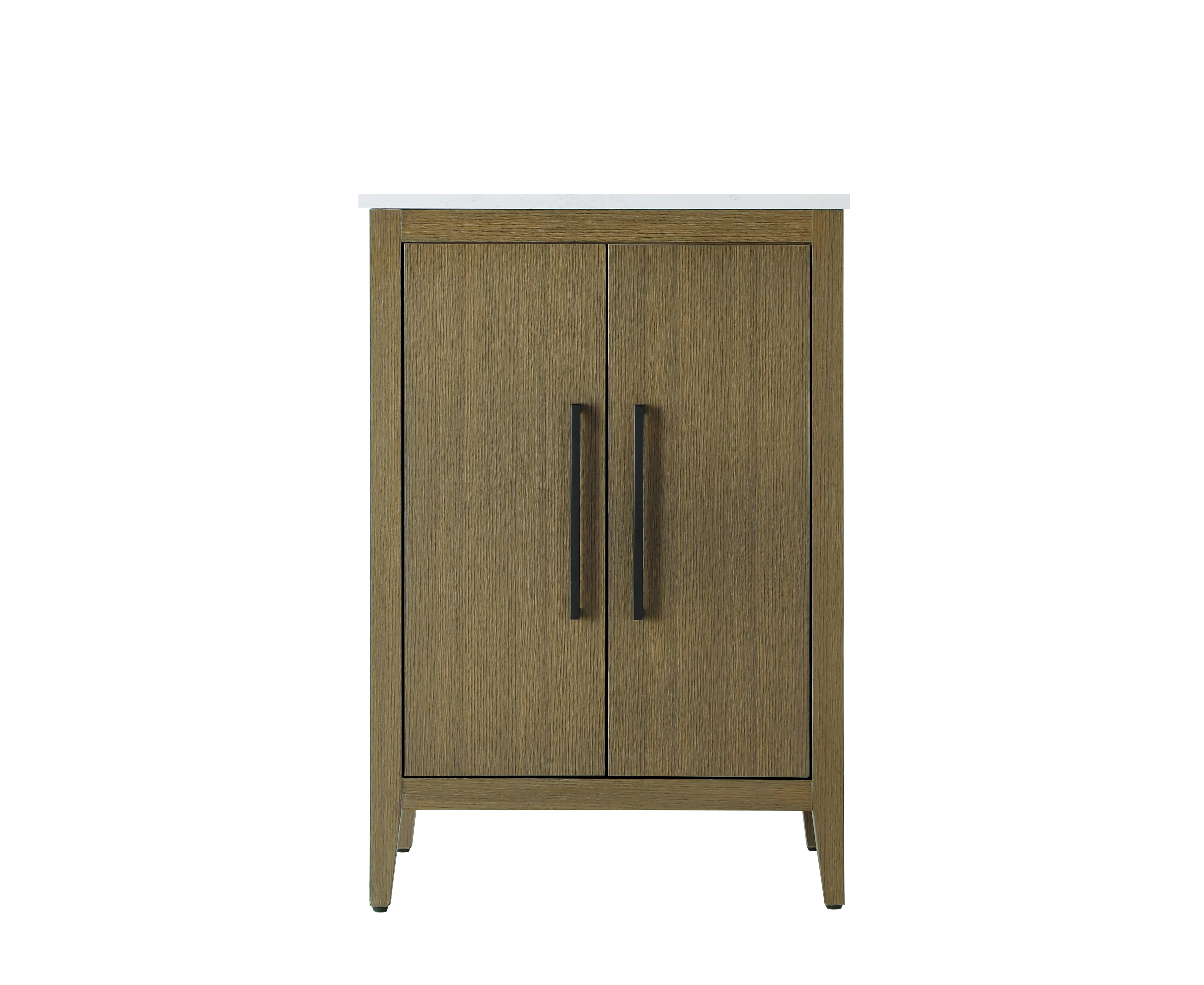 Bring both elegance and practicality to your bathroom with this transitional vanity, available in a selection of rich finishes that highlight the beauty of faux wood grain in shades of mocha, chestnut, and honey, along with classic white and modern grey. The flat door panels and sleek black metal pulls create a minimalist yet refined aesthetic, while the soft-closing drawers and tapered legs with levelers provide smooth, functional operation. Topped with a luxurious white engineered marble countertop and featuring a porcelain sink, this vanity combines timeless style with modern efficiency. Thoughtfully designed with U-shaped cutout for plumbing, it offers ample storage and easy installation, making it the perfect centerpiece for any bathroom.