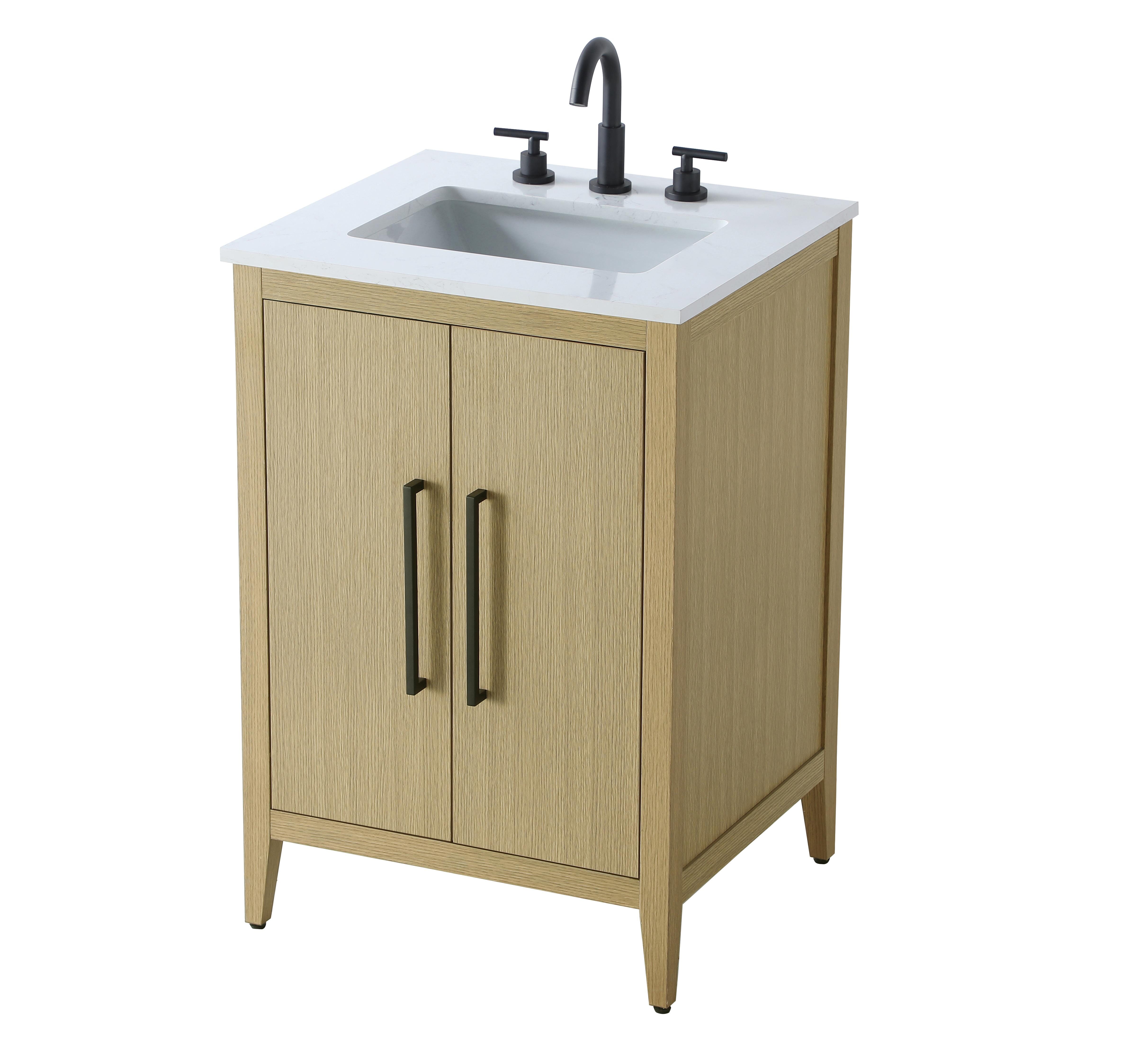 Bring both elegance and practicality to your bathroom with this transitional vanity, available in a selection of rich finishes that highlight the beauty of faux wood grain in shades of mocha, chestnut, and honey, along with classic white and modern grey. The flat door panels and sleek black metal pulls create a minimalist yet refined aesthetic, while the soft-closing drawers and tapered legs with levelers provide smooth, functional operation. Topped with a luxurious white engineered marble countertop and featuring a porcelain sink, this vanity combines timeless style with modern efficiency. Thoughtfully designed with U-shaped cutout for plumbing, it offers ample storage and easy installation, making it the perfect centerpiece for any bathroom.