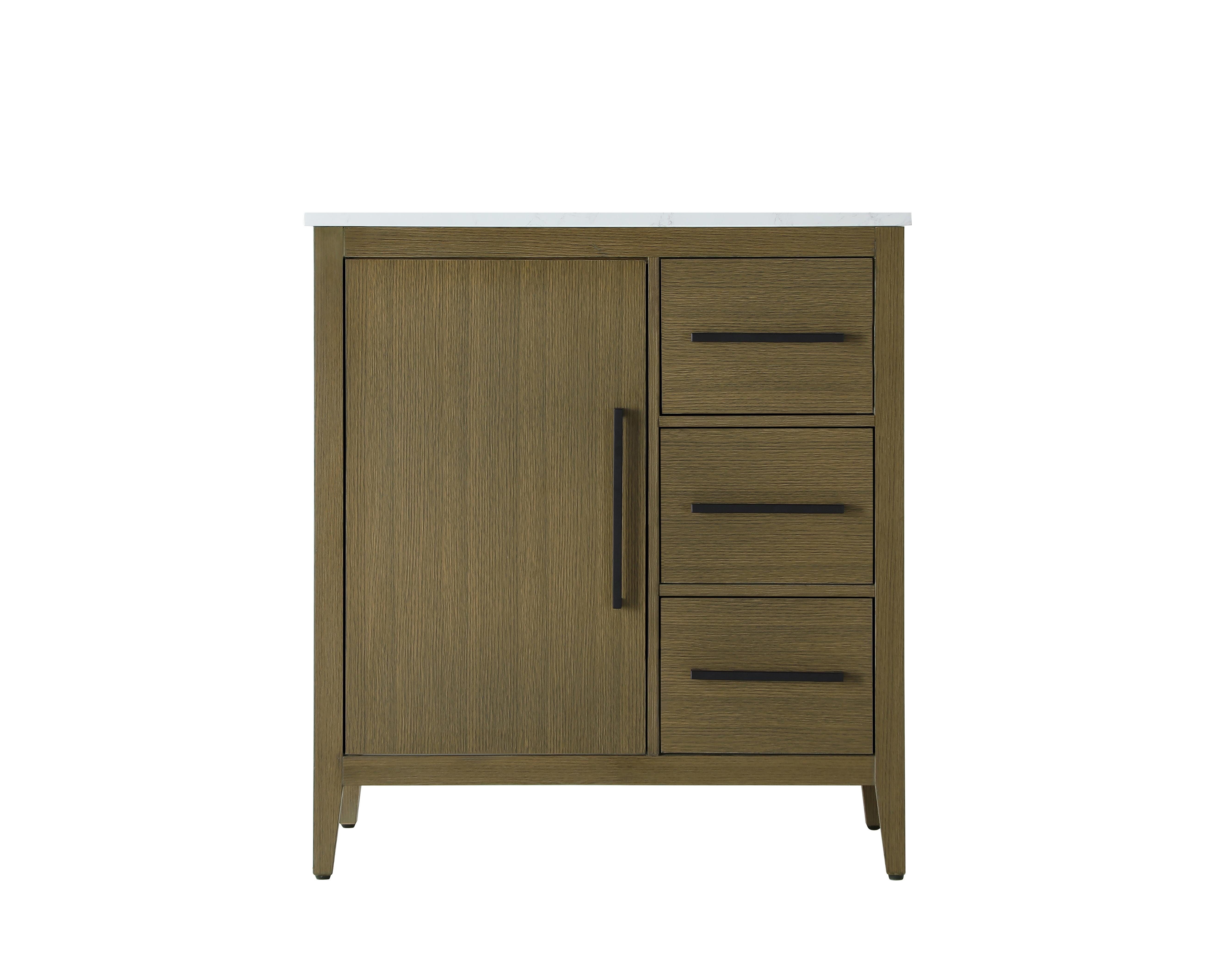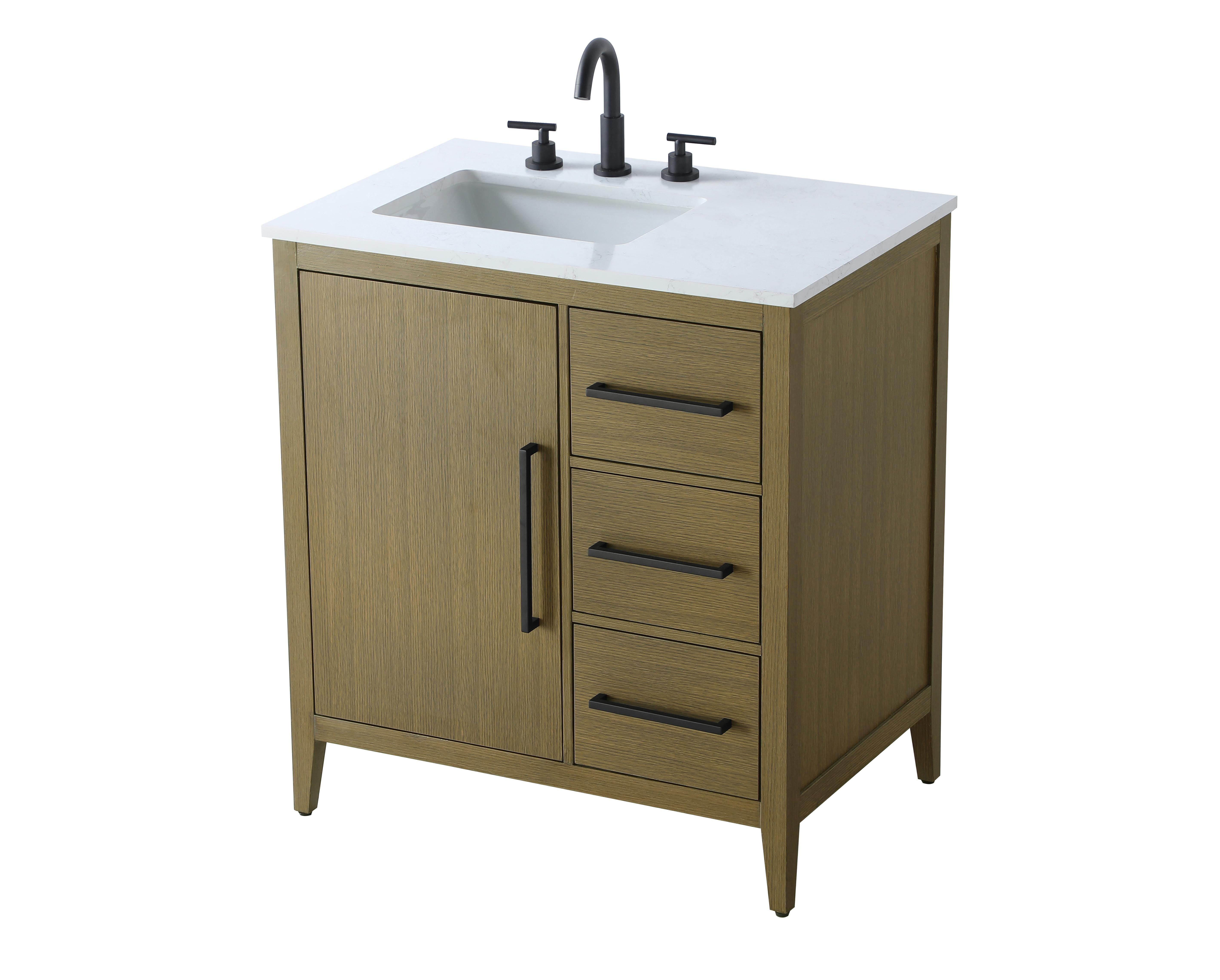 Bring both elegance and practicality to your bathroom with this transitional vanity, available in a selection of rich finishes that highlight the beauty of faux wood grain in shades of mocha, chestnut, and honey, along with classic white and modern grey. The flat door panels and sleek black metal pulls create a minimalist yet refined aesthetic, while the soft-closing drawers and tapered legs with levelers provide smooth, functional operation. Topped with a luxurious white engineered marble countertop and featuring a porcelain sink, this vanity combines timeless style with modern efficiency. Thoughtfully designed with U-shaped cutout for plumbing, it offers ample storage and easy installation, making it the perfect centerpiece for any bathroom.