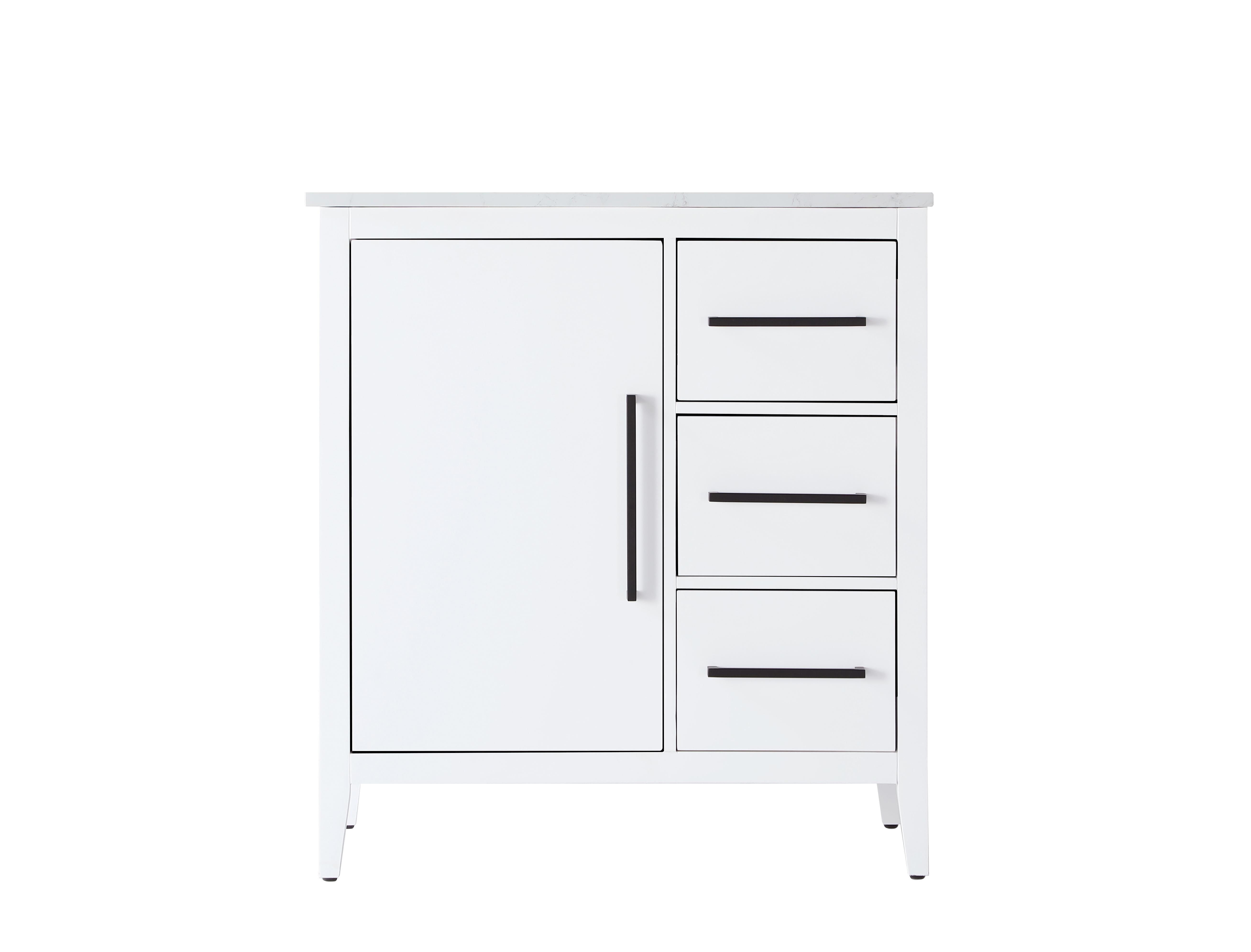 Bring both elegance and practicality to your bathroom with this transitional vanity, available in a selection of rich finishes that highlight the beauty of faux wood grain in shades of mocha, chestnut, and honey, along with classic white and modern grey. The flat door panels and sleek black metal pulls create a minimalist yet refined aesthetic, while the soft-closing drawers and tapered legs with levelers provide smooth, functional operation. Topped with a luxurious white engineered marble countertop and featuring a porcelain sink, this vanity combines timeless style with modern efficiency. Thoughtfully designed with U-shaped cutout for plumbing, it offers ample storage and easy installation, making it the perfect centerpiece for any bathroom.