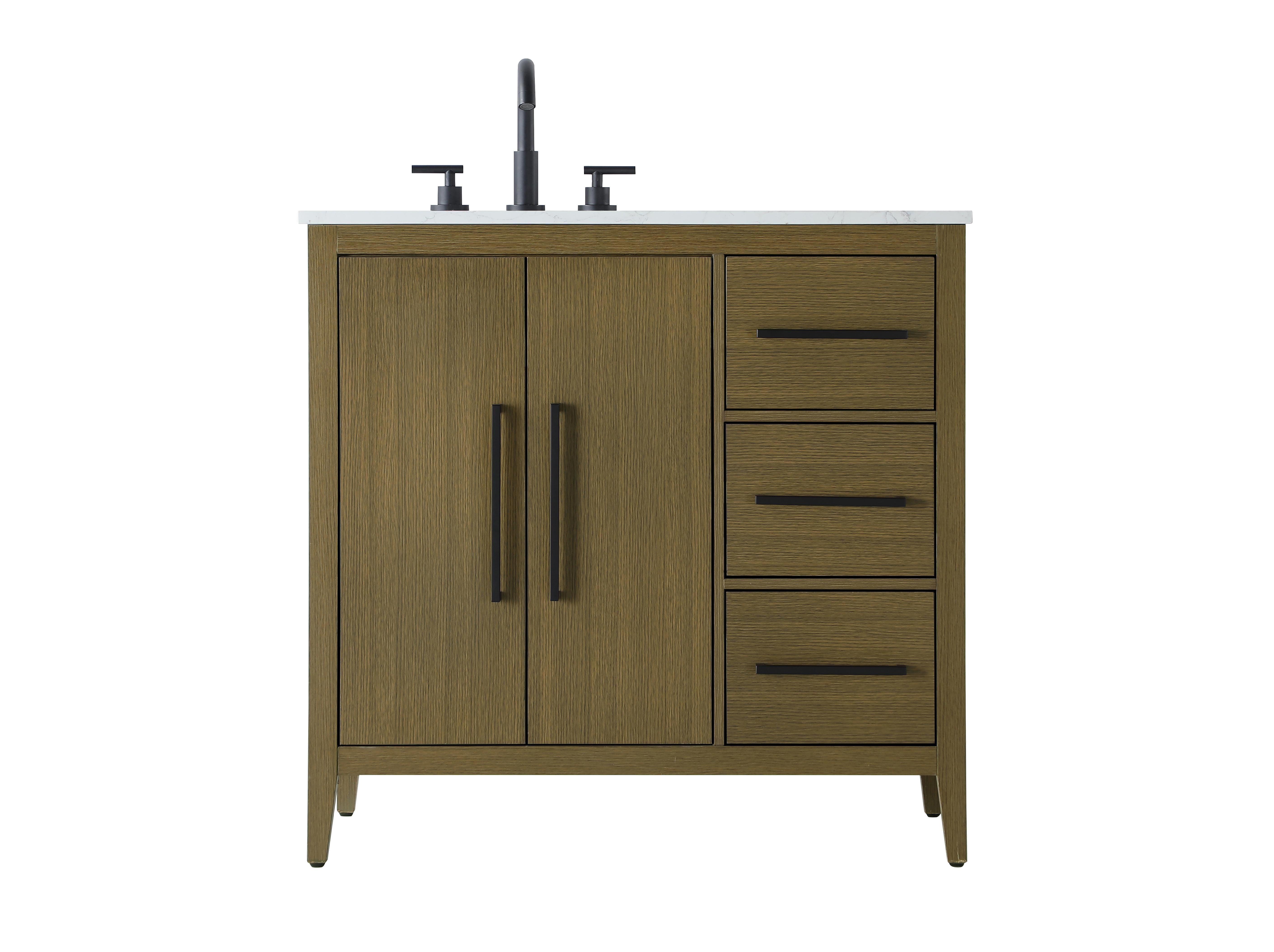 Bring both elegance and practicality to your bathroom with this transitional vanity, available in a selection of rich finishes that highlight the beauty of faux wood grain in shades of mocha, chestnut, and honey, along with classic white and modern grey. The flat door panels and sleek black metal pulls create a minimalist yet refined aesthetic, while the soft-closing drawers and tapered legs with levelers provide smooth, functional operation. Topped with a luxurious white engineered marble countertop and featuring a porcelain sink, this vanity combines timeless style with modern efficiency. Thoughtfully designed with U-shaped cutout for plumbing, it offers ample storage and easy installation, making it the perfect centerpiece for any bathroom.