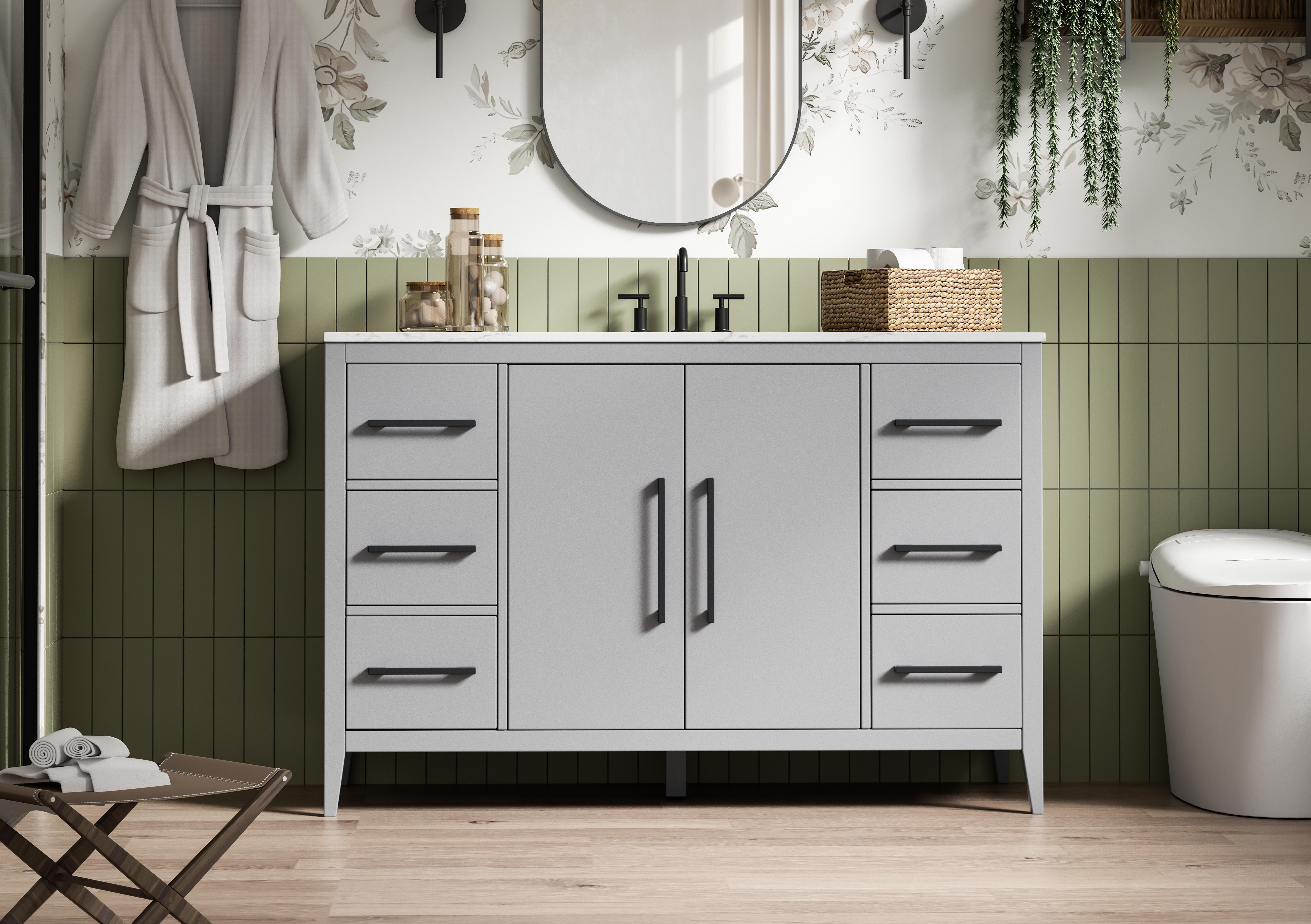 Bring both elegance and practicality to your bathroom with this transitional vanity, available in a selection of rich finishes that highlight the beauty of faux wood grain in shades of mocha, chestnut, and honey, along with classic white and modern grey. The flat door panels and sleek black metal pulls create a minimalist yet refined aesthetic, while the soft-closing drawers and tapered legs with levelers provide smooth, functional operation. Topped with a luxurious white engineered marble countertop and featuring a porcelain sink, this vanity combines timeless style with modern efficiency. Thoughtfully designed with U-shaped cutout for plumbing, it offers ample storage and easy installation, making it the perfect centerpiece for any bathroom.