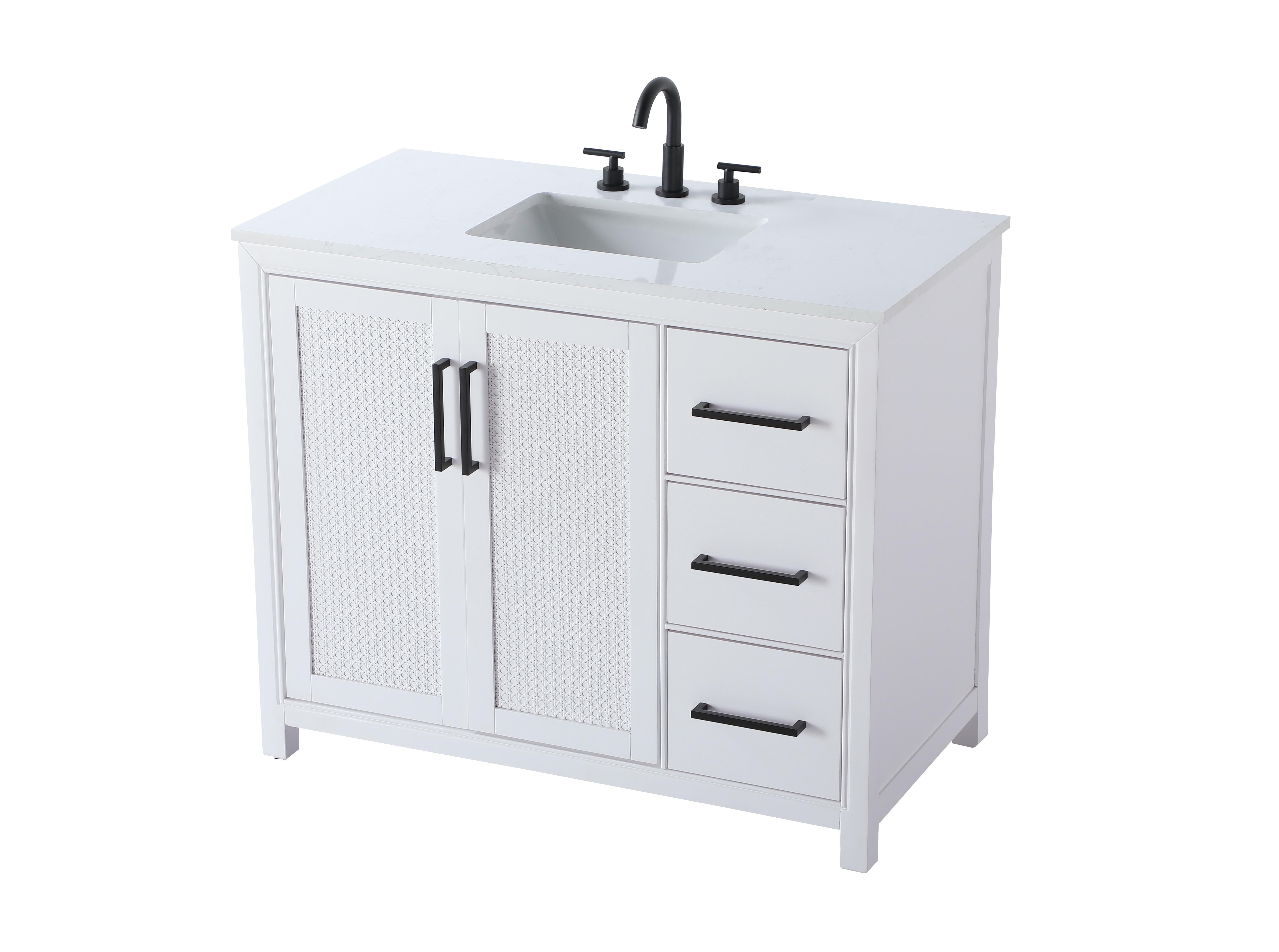 Perfect for those with an eye for detail and quality, this transitional vanity blends modern design with timeless elegance. Available in five stunning finishes, from Crisp White to Linen Oak, the wood grain visuals of the oak options bring warmth and character to any bathroom. The caning design on the Shaker-style door panels adds texture and a touch of refinement, while the soft-closing doors and drawers ensure smooth, quiet functionality. Topped with a white engineered marble countertop, the vanity offers both luxury and practicality, complete with pre-drilled faucet holes for customization. A concealed overflow and U-shaped shelf for plumbing make installation effortless, and the slender black metal pulls provide a sleek contrast.