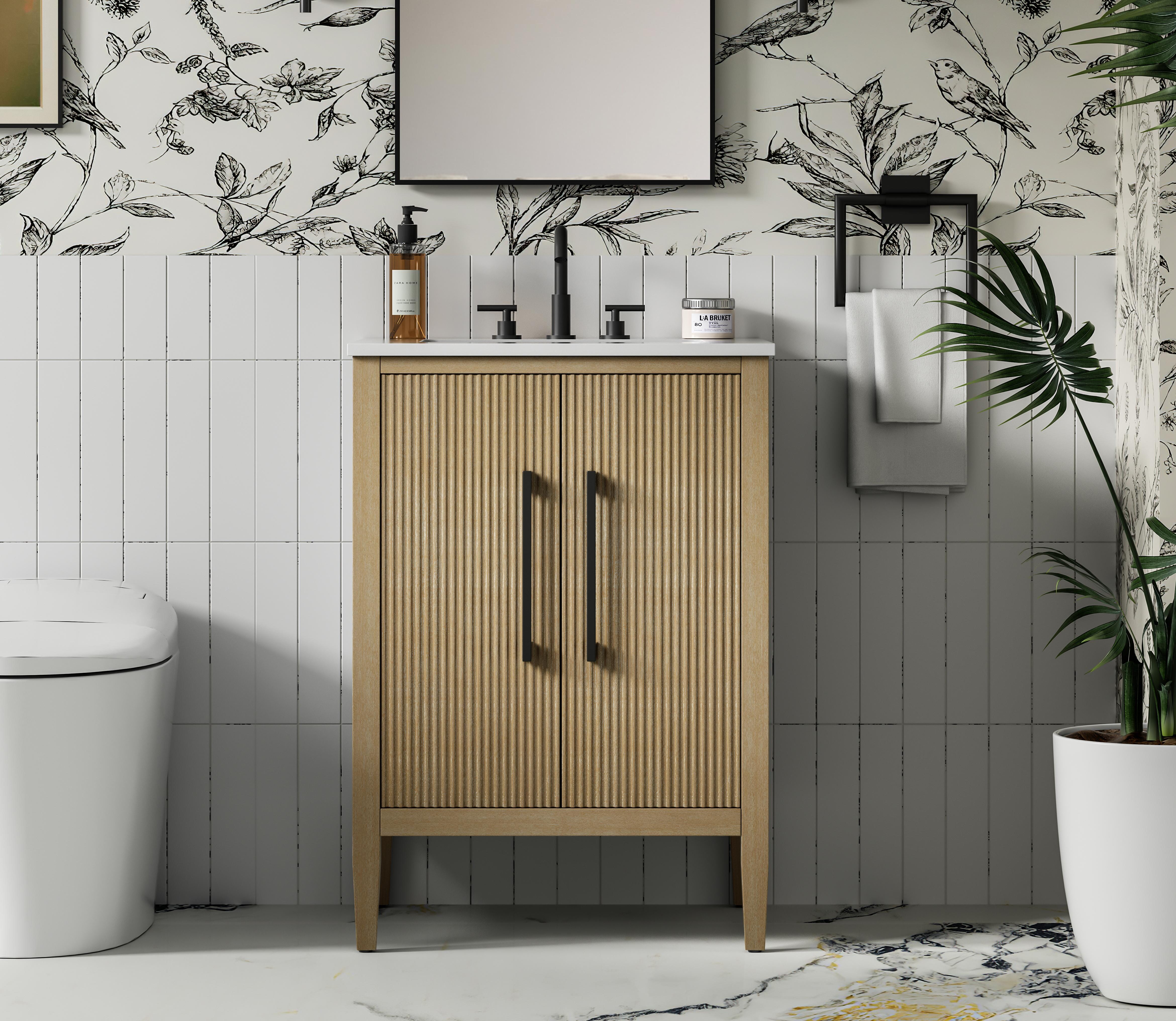 Designed with transitional elegance in mind, this bathroom vanity seamlessly blends traditional elements with modern functionality. Available in five stunning finishes, from the clean sophistication of Crisp White to the natural warmth of Honey Oak, the fluted door and drawer panels add subtle texture and charm. The white engineered marble countertop with natural veining exudes luxury, while the soft-closing doors with sleek black metal pulls offer a quiet, refined experience. Practicality is never compromised, with features like the U-shaped shelf for plumbing, and pre-drilled faucet holes for easy customization. Whether your style leans modern or classic, this vanity is the perfect balance of beauty and function, appealing to customers with a taste for quality and style.