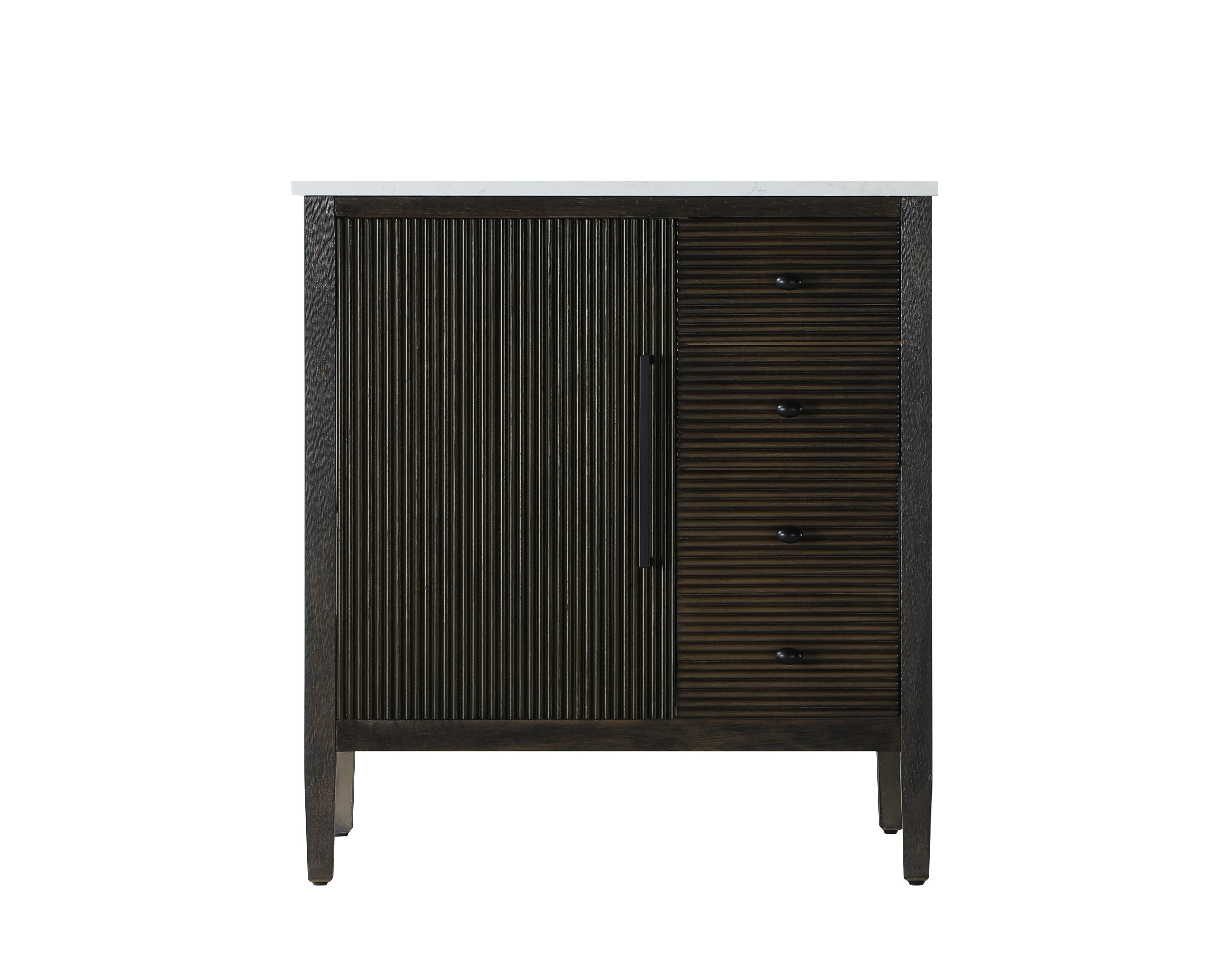Designed with transitional elegance in mind, this bathroom vanity seamlessly blends traditional elements with modern functionality. Available in five stunning finishes, from the clean sophistication of Crisp White to the natural warmth of Honey Oak, the fluted door and drawer panels add subtle texture and charm. The white engineered marble countertop with natural veining exudes luxury, while the soft-closing doors and drawers with sleek black metal pulls offer a quiet, refined experience. Practicality is never compromised, with features like the U-shaped shelf for plumbing, deeper bottom drawer for ample storage, and pre-drilled faucet holes for easy customization. Whether your style leans modern or classic, this vanity is the perfect balance of beauty and function, appealing to customers with a taste for quality and style.