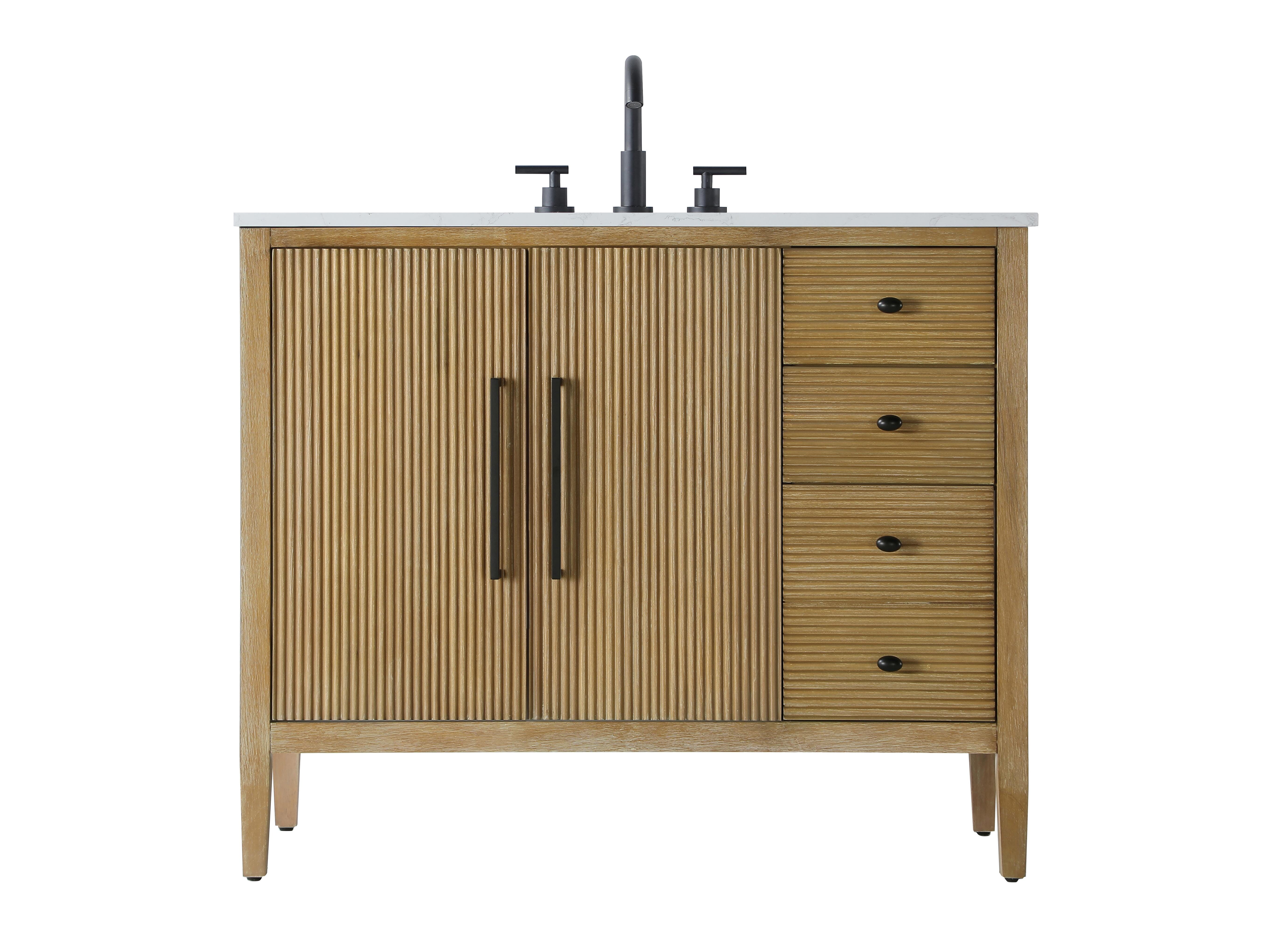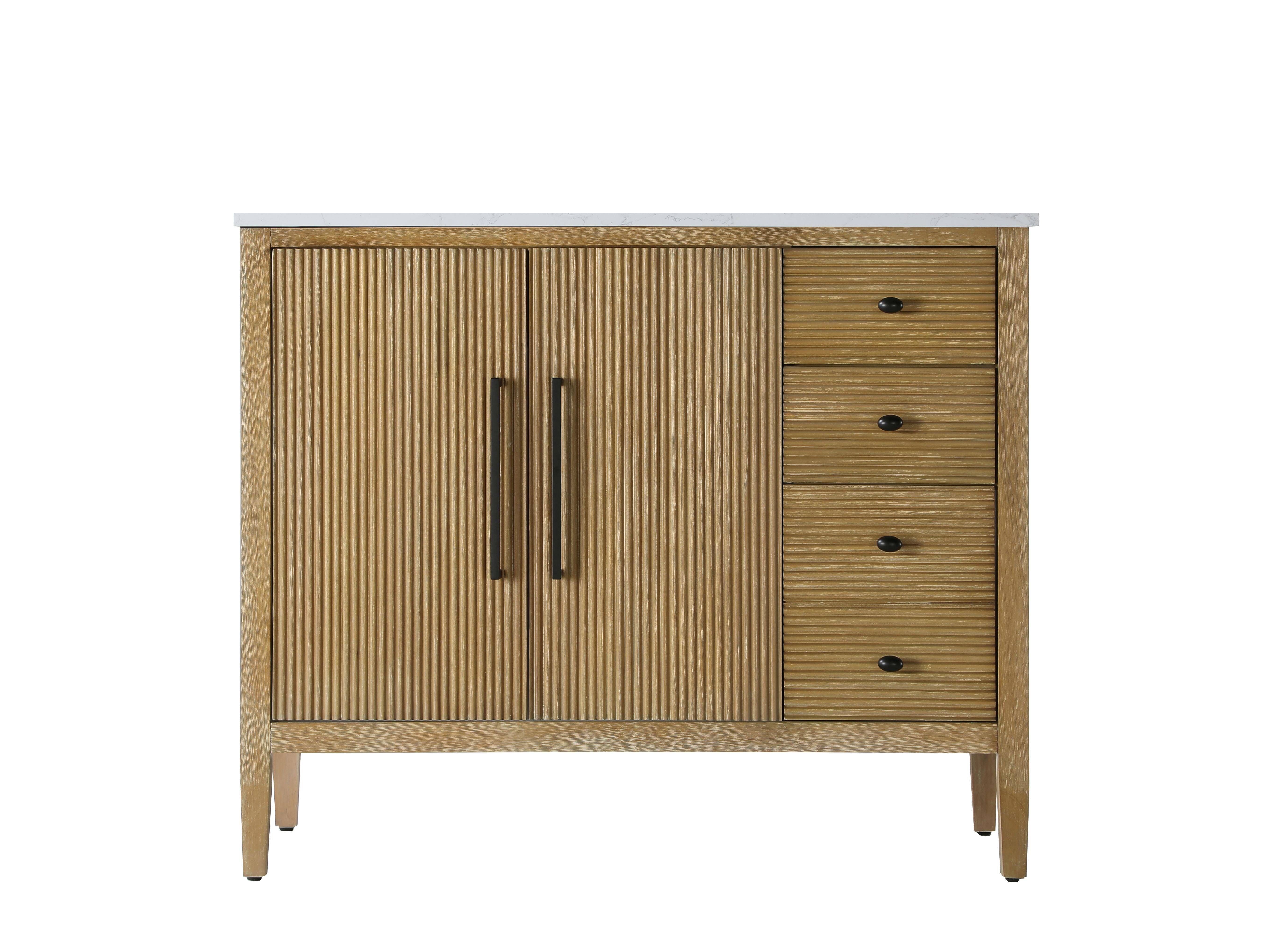 Designed with transitional elegance in mind, this bathroom vanity seamlessly blends traditional elements with modern functionality. Available in five stunning finishes, from the clean sophistication of Crisp White to the natural warmth of Honey Oak, the fluted door and drawer panels add subtle texture and charm. The white engineered marble countertop with natural veining exudes luxury, while the soft-closing doors and drawers with sleek black metal pulls offer a quiet, refined experience. Practicality is never compromised, with features like the U-shaped shelf for plumbing, deeper bottom drawer for ample storage, and pre-drilled faucet holes for easy customization. Whether your style leans modern or classic, this vanity is the perfect balance of beauty and function, appealing to customers with a taste for quality and style.