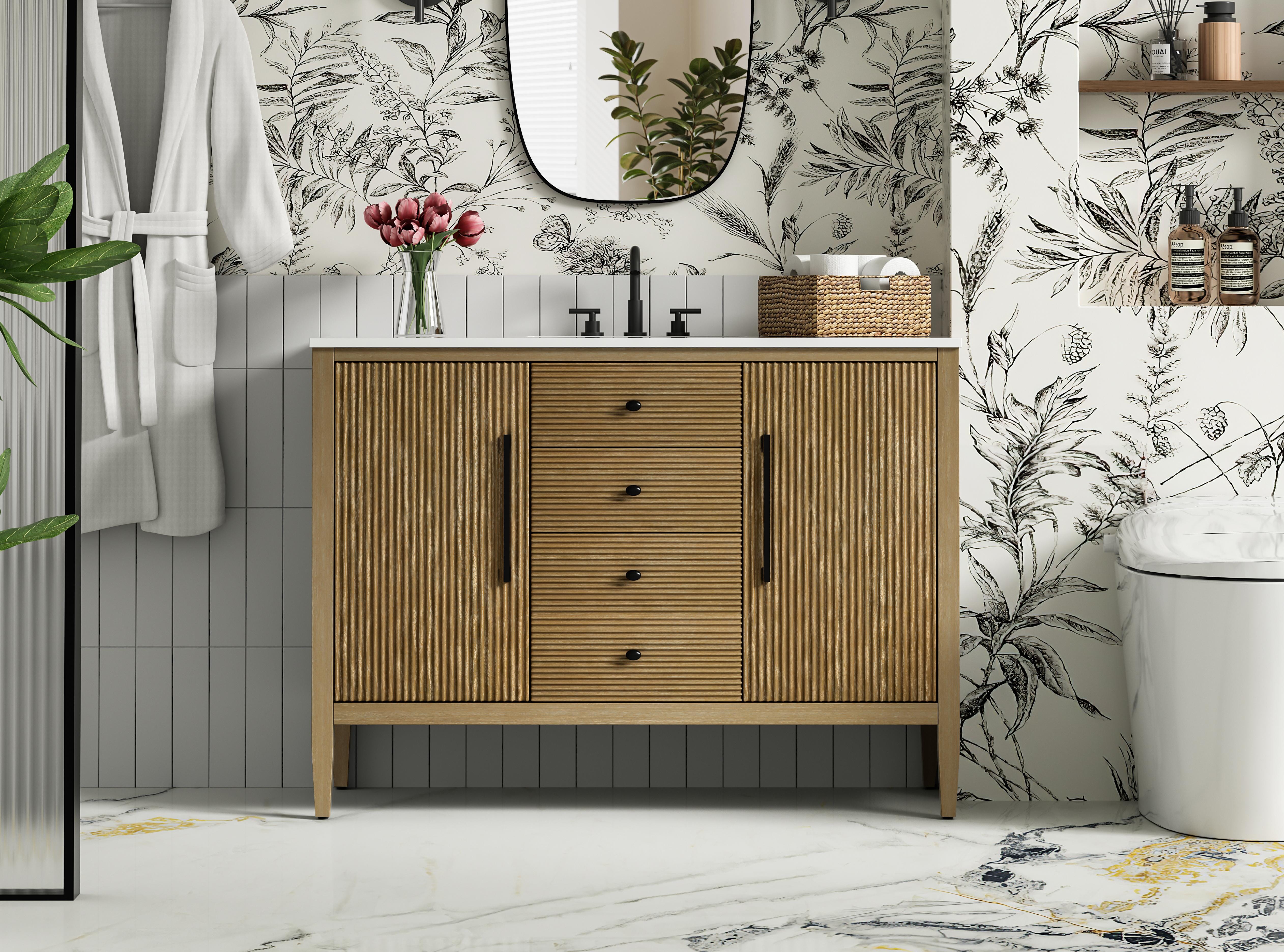 Designed with transitional elegance in mind, this bathroom vanity seamlessly blends traditional elements with modern functionality. Available in five stunning finishes, from the clean sophistication of Crisp White to the natural warmth of Honey Oak, the fluted door and drawer panels add subtle texture and charm. The white engineered marble countertop with natural veining exudes luxury, while the soft-closing doors and drawers with sleek black metal pulls offer a quiet, refined experience. Practicality is never compromised, with features like the U-shaped shelf for plumbing, deeper bottom drawer for ample storage, and pre-drilled faucet holes for easy customization. Whether your style leans modern or classic, this vanity is the perfect balance of beauty and function, appealing to customers with a taste for quality and style.