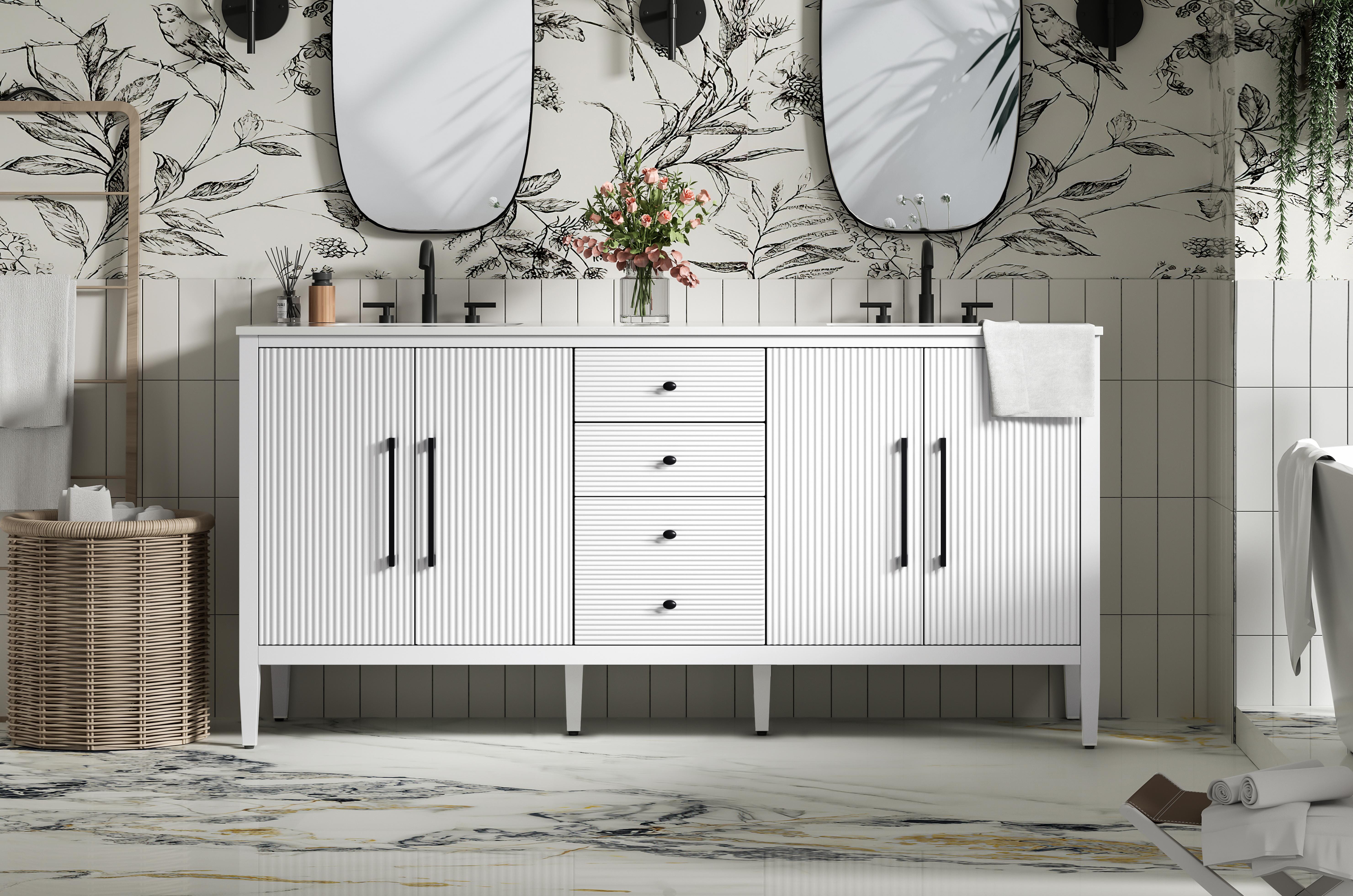 Designed with transitional elegance in mind, this bathroom vanity seamlessly blends traditional elements with modern functionality. Available in five stunning finishes, from the clean sophistication of Crisp White to the natural warmth of Honey Oak, the fluted door and drawer panels add subtle texture and charm. The white engineered marble countertop with natural veining exudes luxury, while the soft-closing doors and drawers with sleek black metal pulls offer a quiet, refined experience. Practicality is never compromised, with features like the U-shaped shelf for plumbing, deeper bottom drawer for ample storage, and pre-drilled faucet holes for easy customization. Whether your style leans modern or classic, this vanity is the perfect balance of beauty and function, appealing to customers with a taste for quality and style.