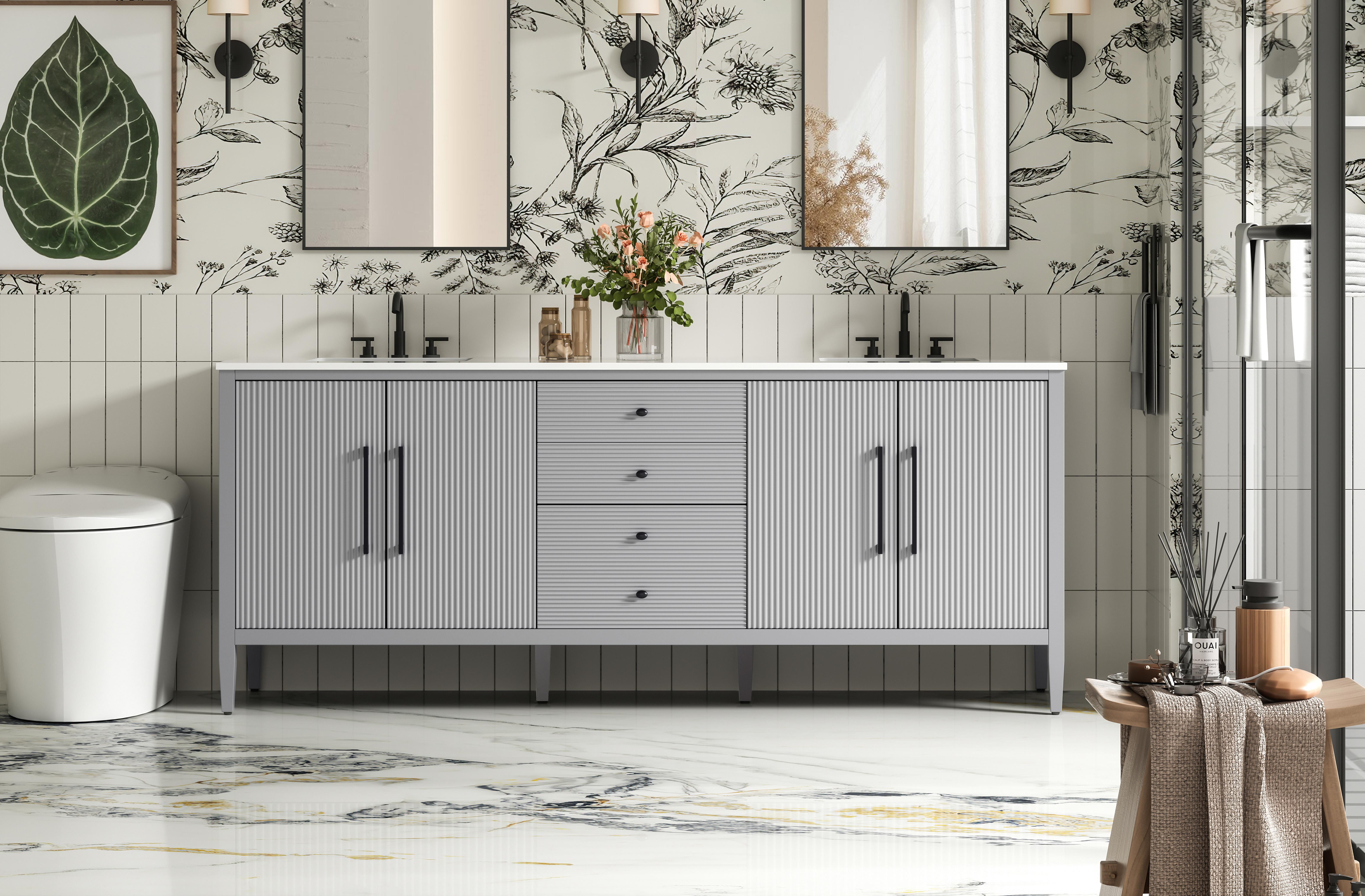 Designed with transitional elegance in mind, this bathroom vanity seamlessly blends traditional elements with modern functionality. Available in five stunning finishes, from the clean sophistication of Crisp White to the natural warmth of Honey Oak, the fluted door and drawer panels add subtle texture and charm. The white engineered marble countertop with natural veining exudes luxury, while the soft-closing doors and drawers with sleek black metal pulls offer a quiet, refined experience. Practicality is never compromised, with features like the U-shaped shelf for plumbing, deeper bottom drawer for ample storage, and pre-drilled faucet holes for easy customization. Whether your style leans modern or classic, this vanity is the perfect balance of beauty and function, appealing to customers with a taste for quality and style.
