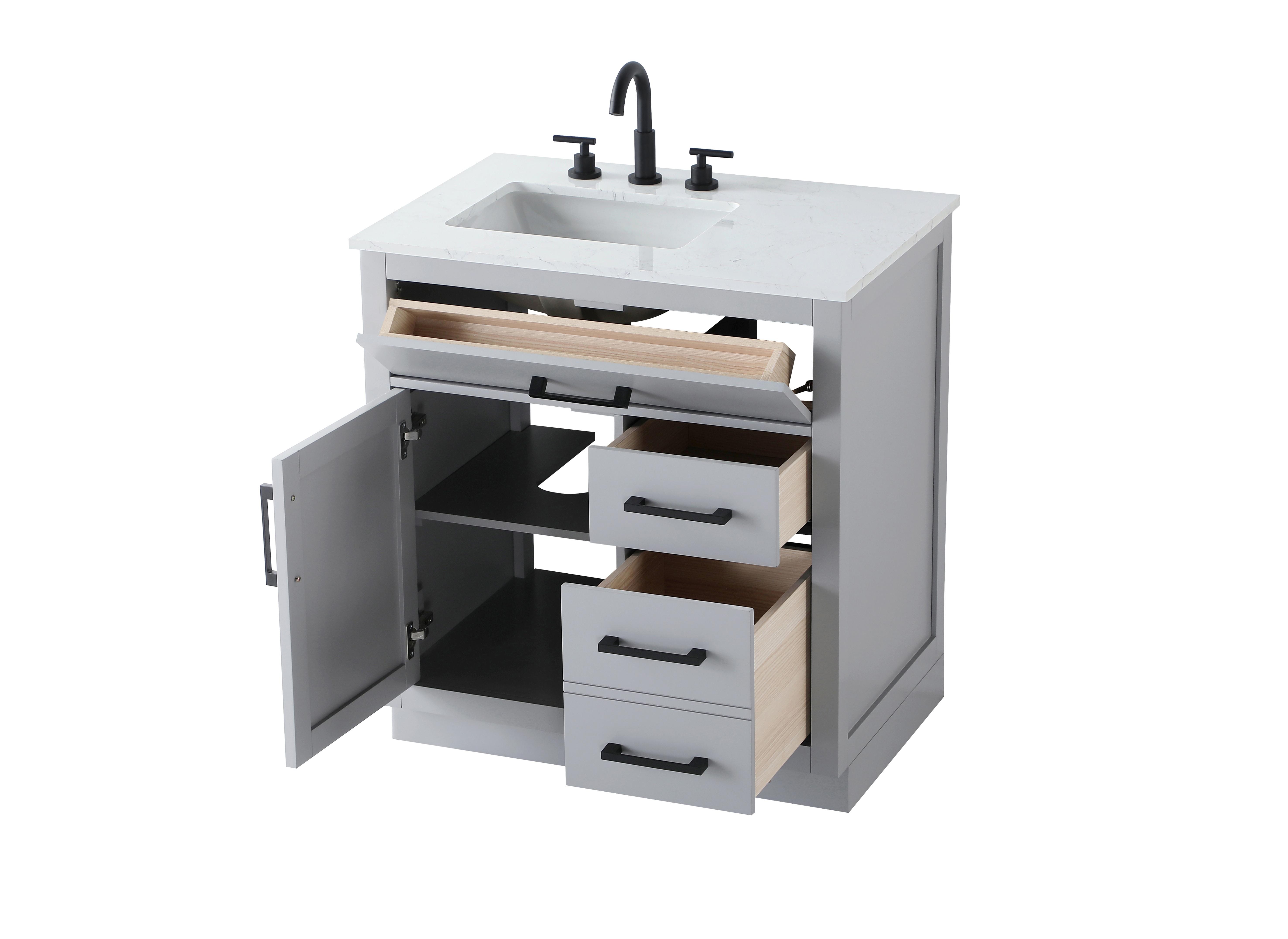 Introduce a perfect balance of functionality and style to your bathroom with this thoughtfully designed vanity. Constructed with a combination of solid wood and MDF, it offers durability and a sturdy build. The sleek engineered marble countertop with subtle grey marbling complements the rustic wood grain finish, creating a stylish and inviting centerpiece for your bathroom. Designed in a contemporary style with a transitional flair, it features a U-shaped shelf for seamless plumbing integration and multiple soft-close drawers for clutter-free organization. A pull-down drawer enhances convenience, while the toe kick adds a refined, clean-lined appearance and simplifies cleaning underneath. Matte black hardware contrasts beautifully with the cabinet finish, tying the look together. Delivered fully assembled and equipped with foot levelers, this vanity combines practicality and aesthetic appeal to suit modern and transitional bathrooms alike.